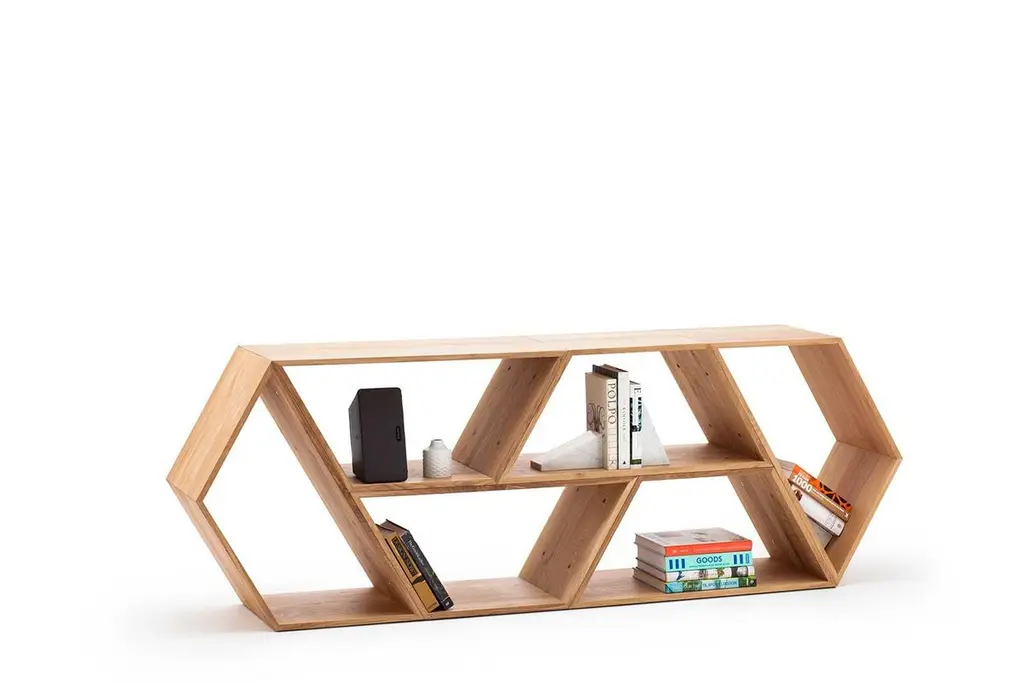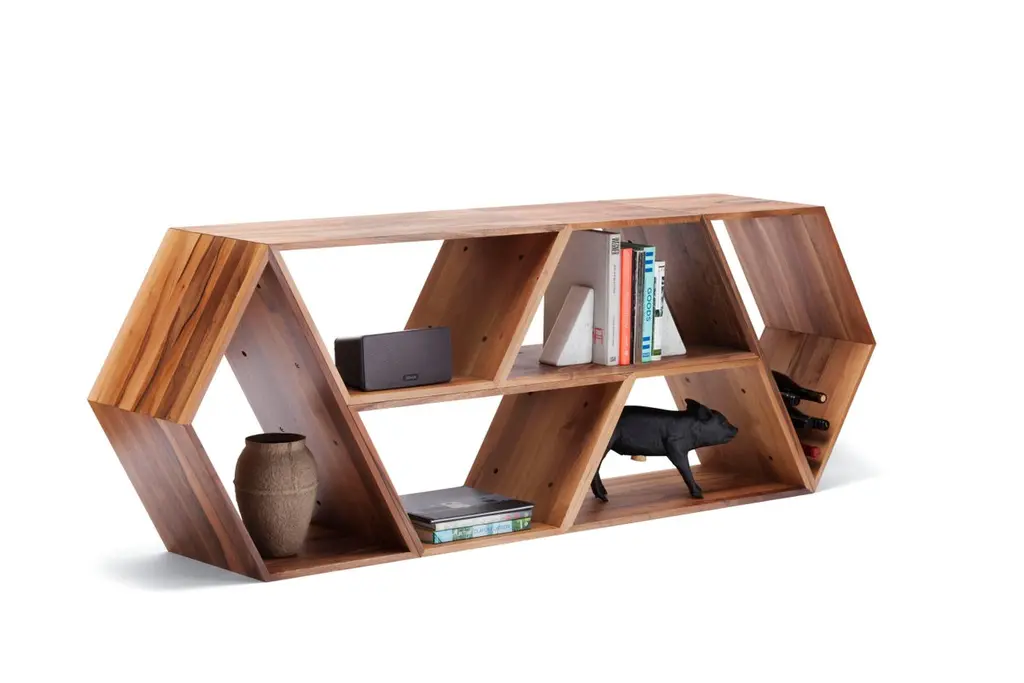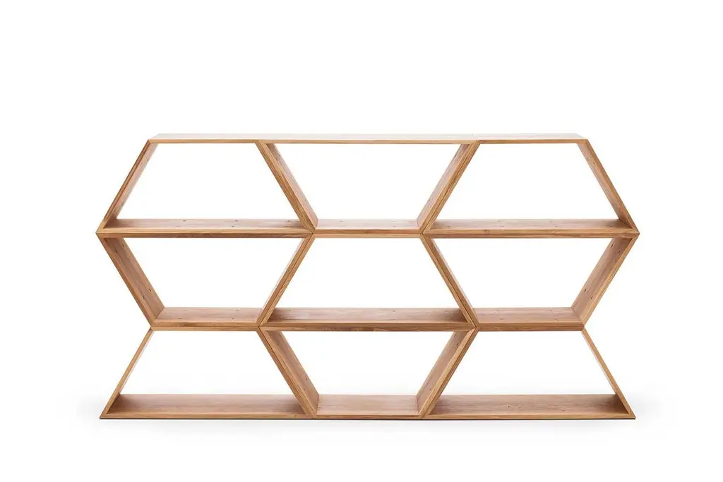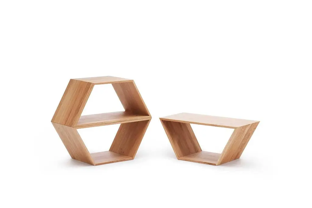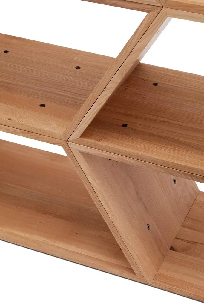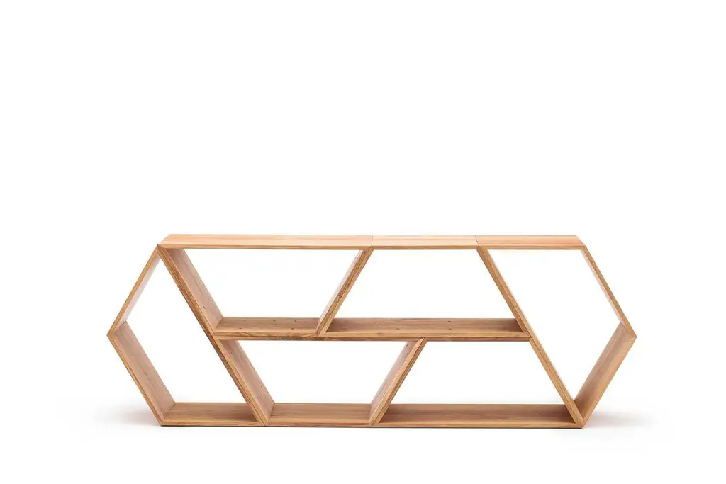 The contemporary Tetra shelving system is made from solid European white oak or solid European walnut. The modular trapezoid cell can be used as a single unit or can be built up to create endless configurations.
