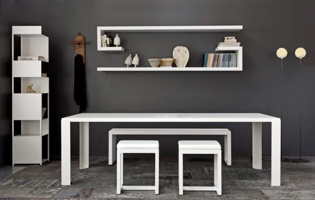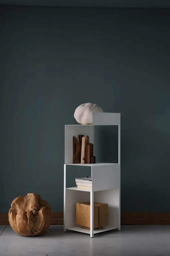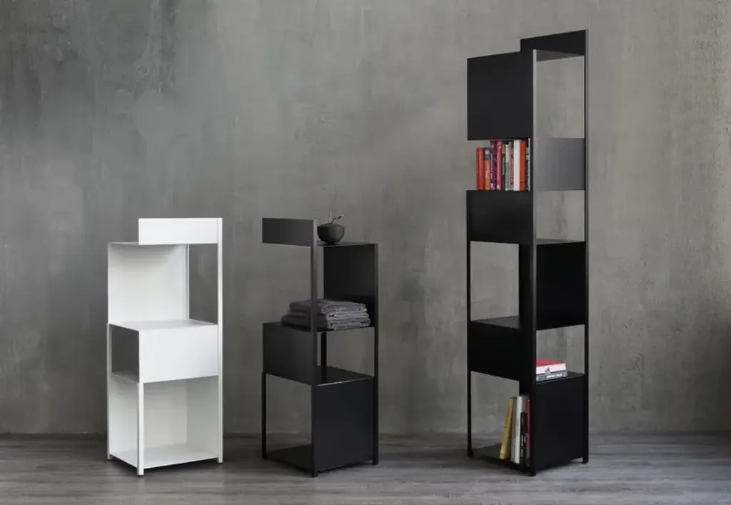 Tito is a freestanding painted metal shelving unit.Frame/shelves: Copper black sand-touch / Embossed white