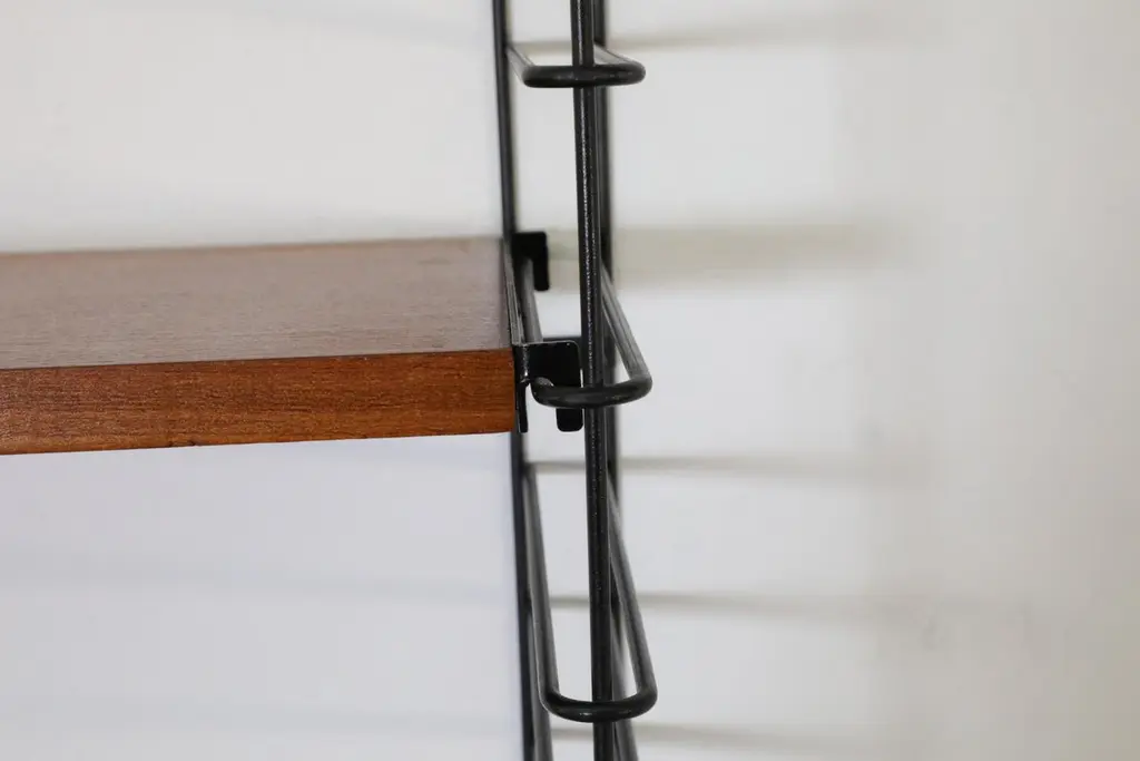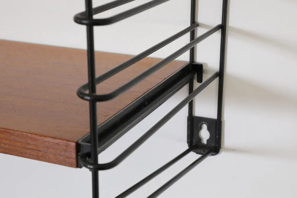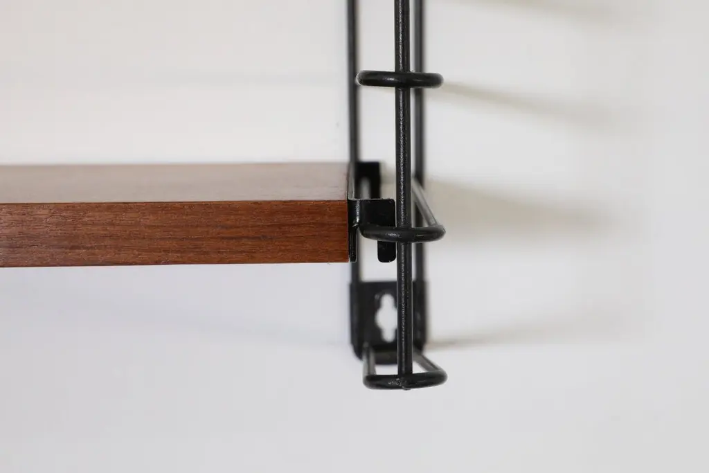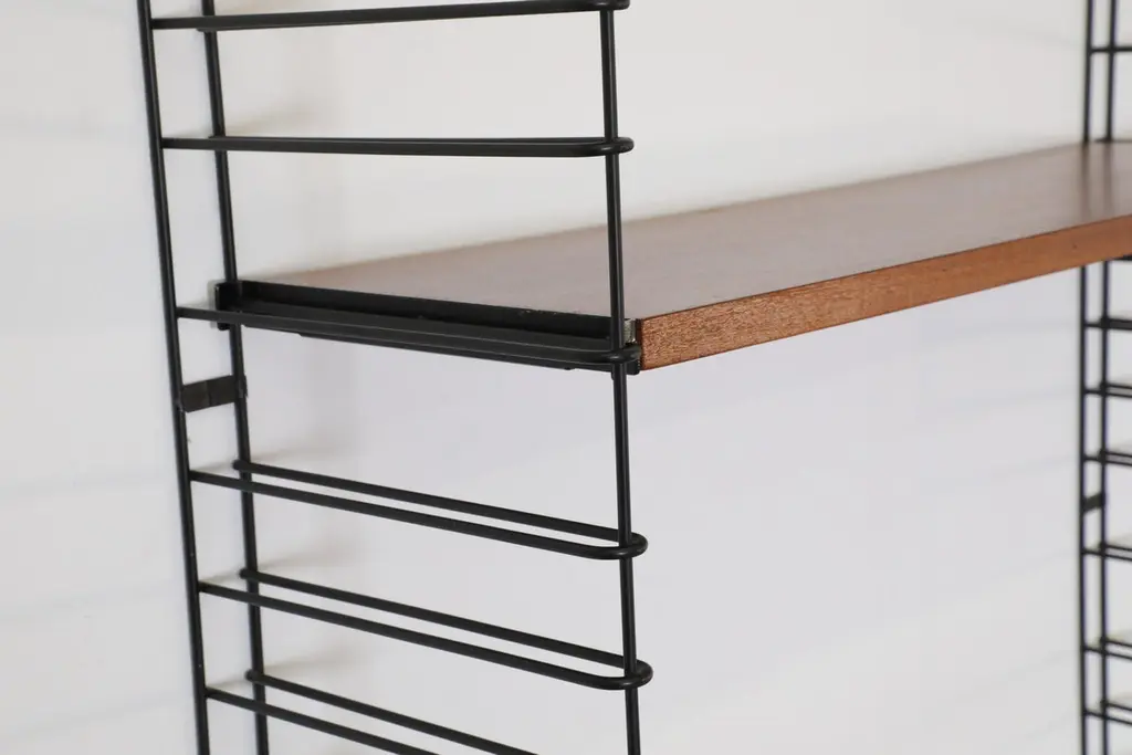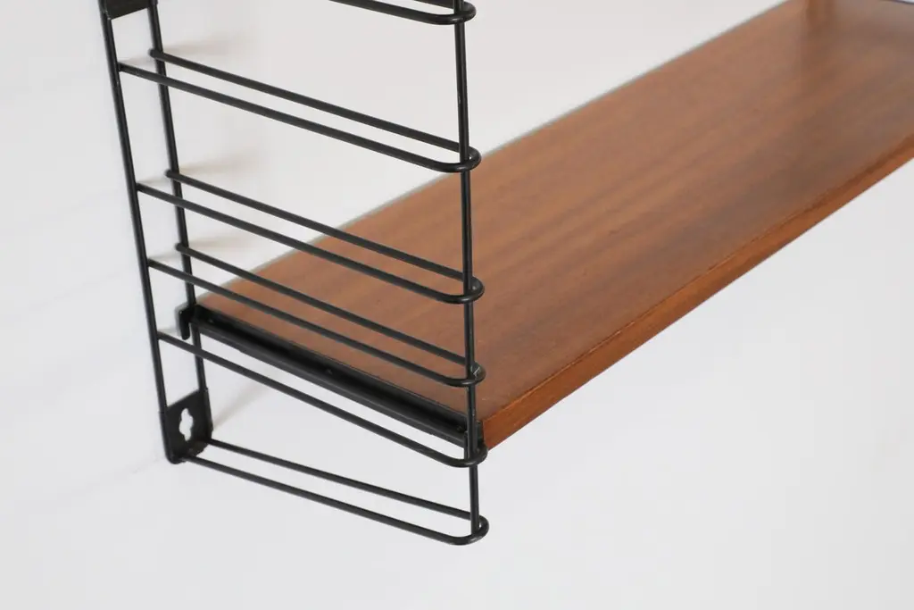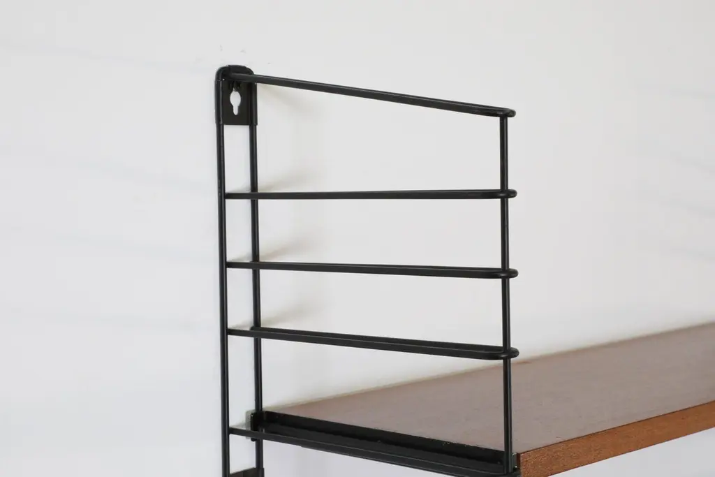Dutch Mid-Century, single section, Tomado shelving unit with adjustable teak shelves and black enameled metal risers. Functional and attractive wall mount shelves perfect for displaying books, plants and other accessories. In original condition with some visible wear consistent with age and use. Priced individually.