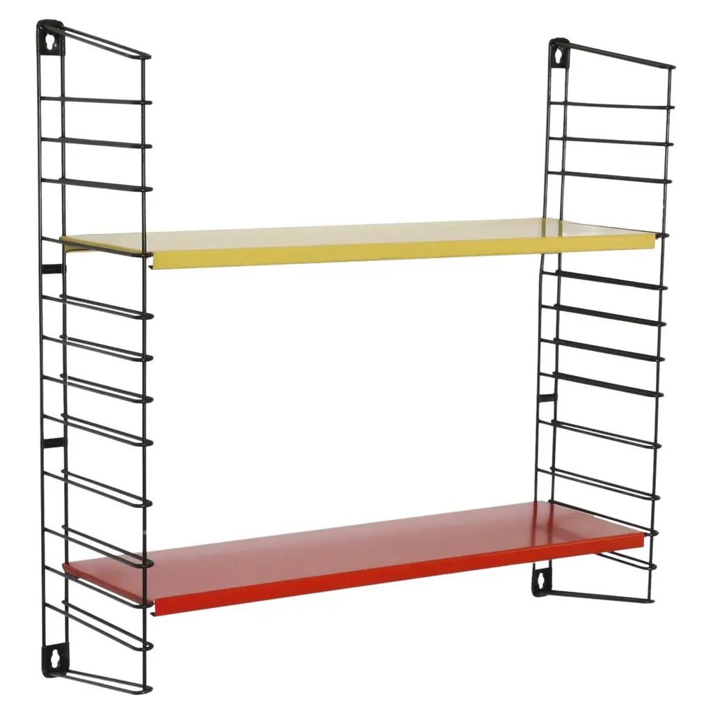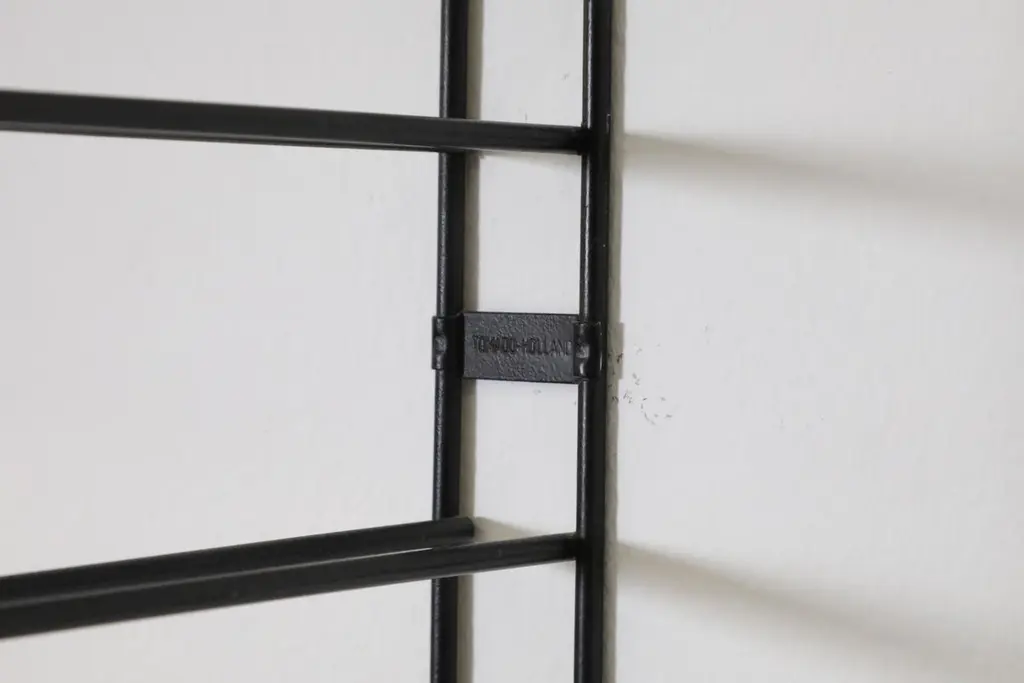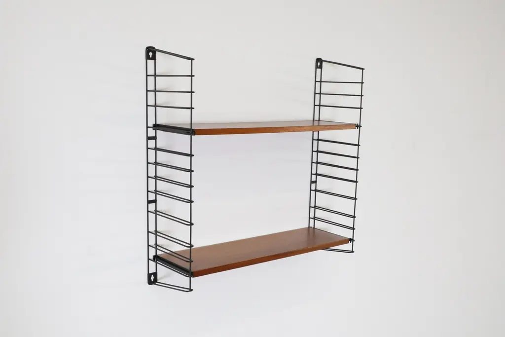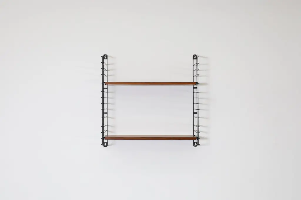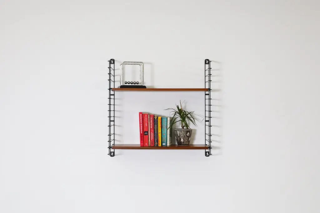 Dutch Mid-Century, single section, Tomado shelving unit with adjustable teak shelves and black enameled metal risers. Functional and attractive wall mount shelves perfect for displaying books, plants and other accessories. In original condition with some visible wear consistent with age and use. Priced individually.