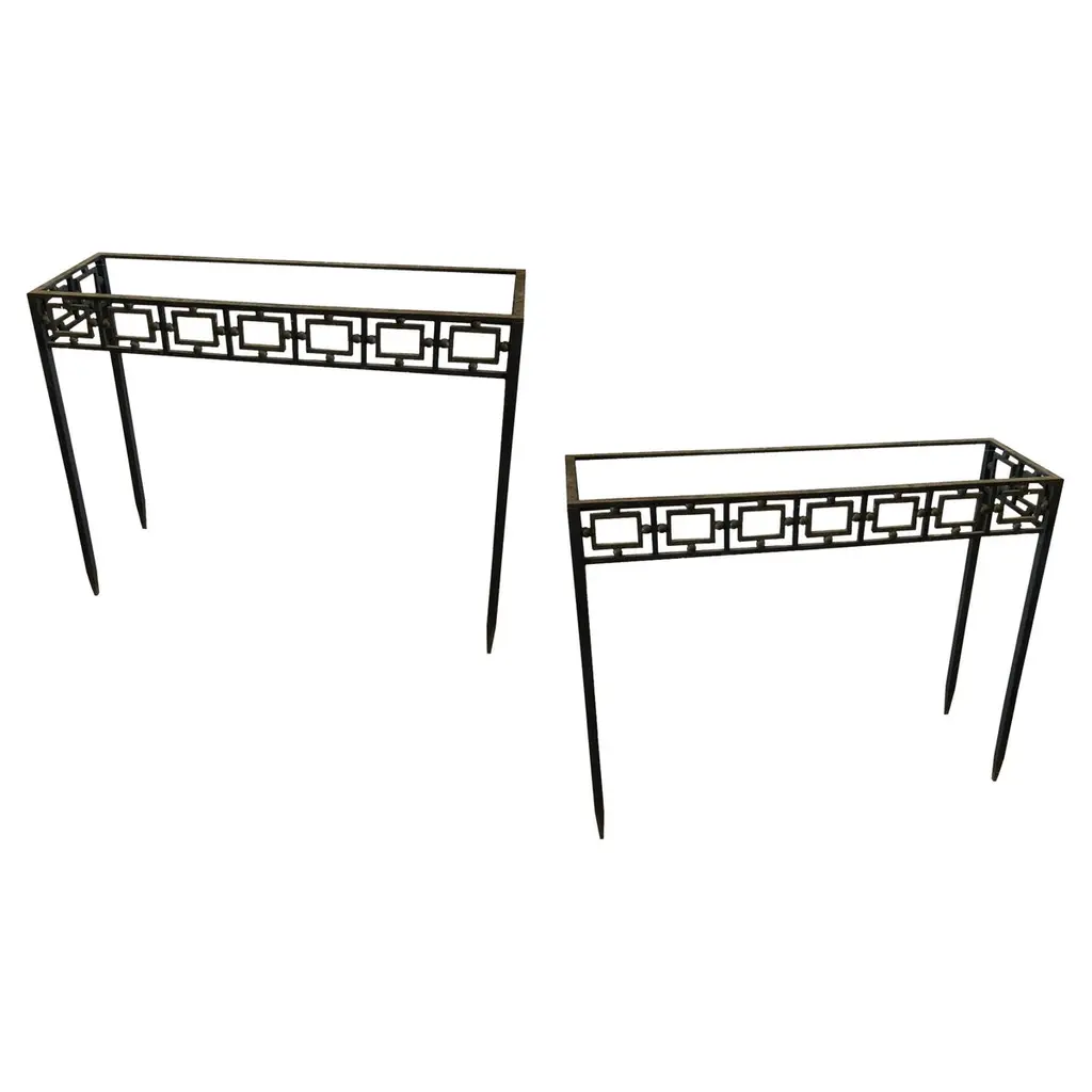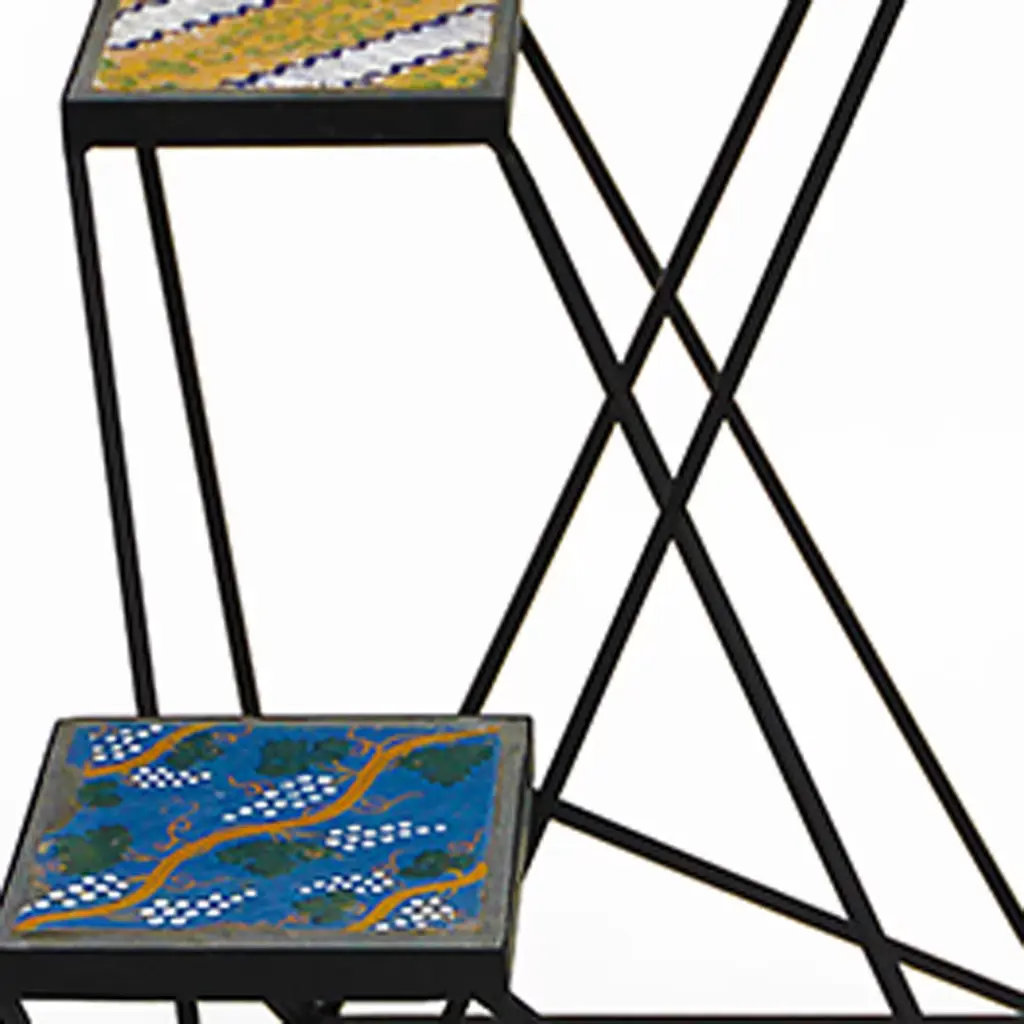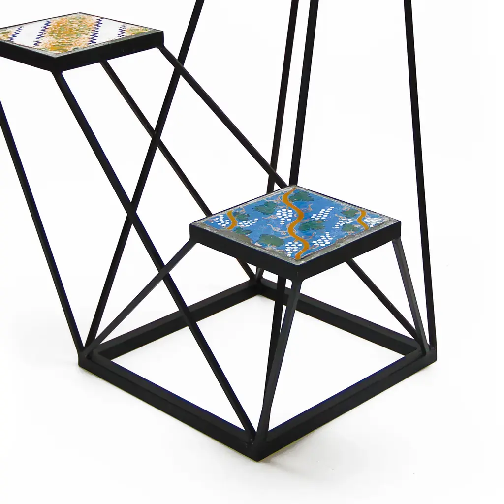 This shelving piece has a structure in black varnished iron bearing a striking geometric shape that features three shelves, each positioned at different heights. The tops are in antique colored tiles and can be used as tables or pedestals as well. The modern design of this piece is combined with traditional wrought iron crafting techniques, creating a contemporary feel. Part of the Ensemble collection, this piece is hand-made by fine Italian craftsmen, and suitable for indoor or outdoor use.