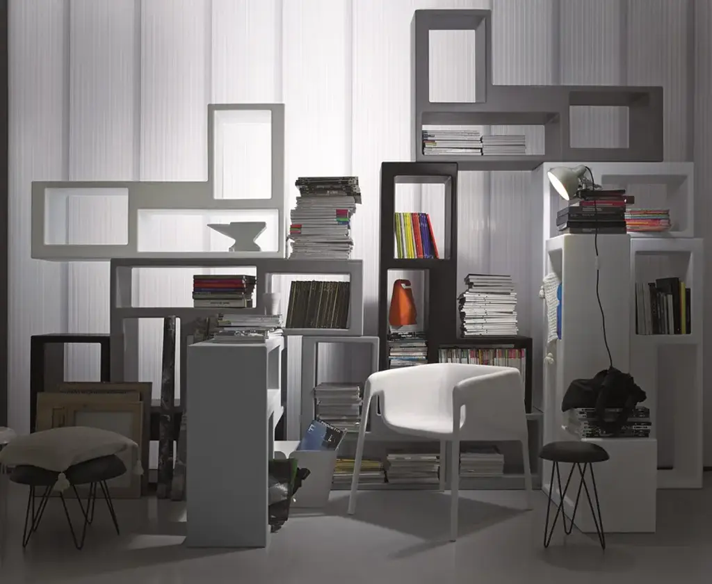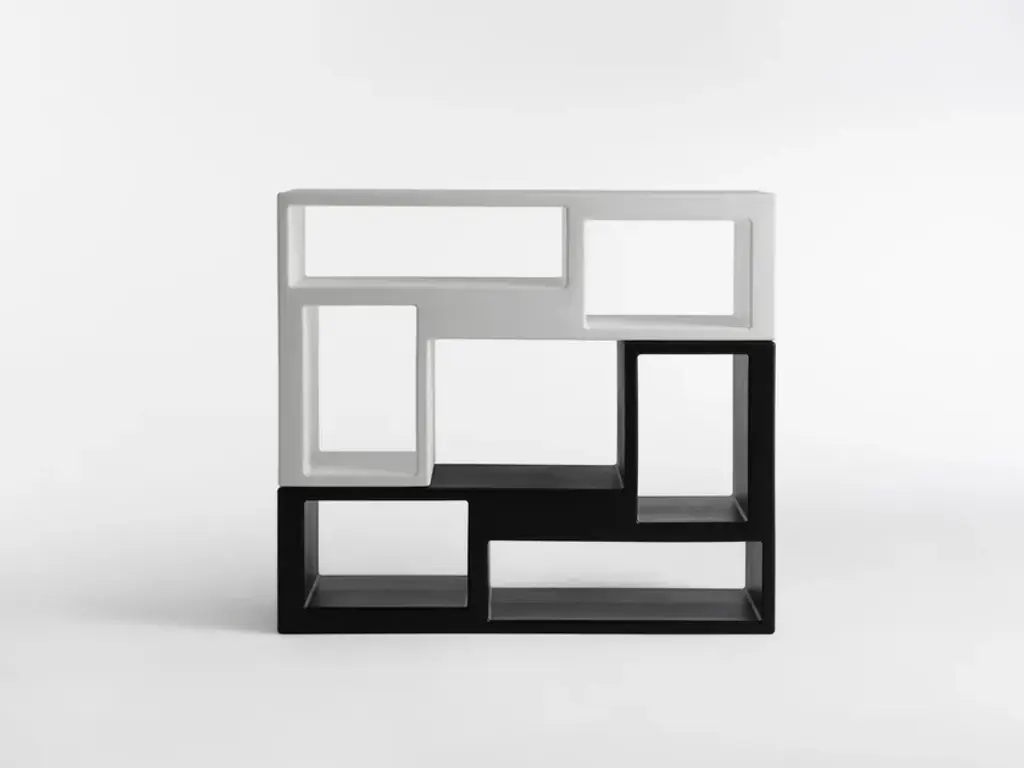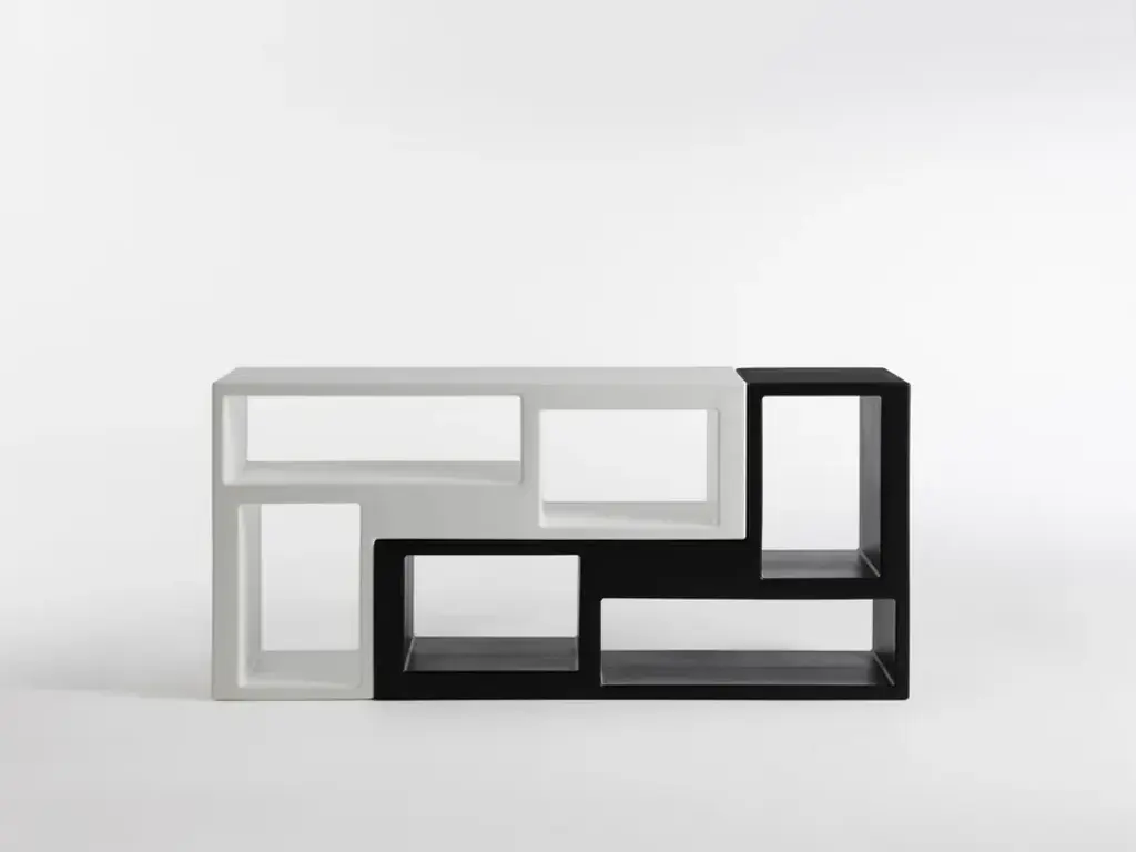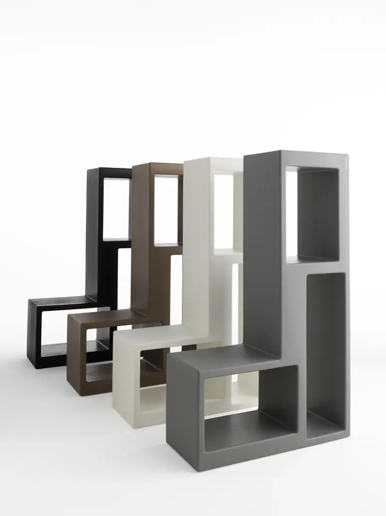 The ‘L’ shaped module measuring 140x 35cm can be used in any position. A system without hooks or joints which allows the user to create walls, screens, horizontal and vertical elements; angles, benches, entertainment systems – everything that comes to mind.The niches carved out of the piece underline the monolithic and solid nature of the Urban shelving unit. A modern piece which stands above the whims of fashion.The infinite possibilities of composition and the a vast choice of colours allow the user to create surprising landscapes and furnish her spaces in a dynamic and bright way. The apparent simplicity of the Urban shelving unit contrasts with the technical difficulties encountered in the rotational moulding of a plastic object with large flat surfaces. MATERIALS AND FINISHES Polyethylene. Carrying capacity: 200 Kg.