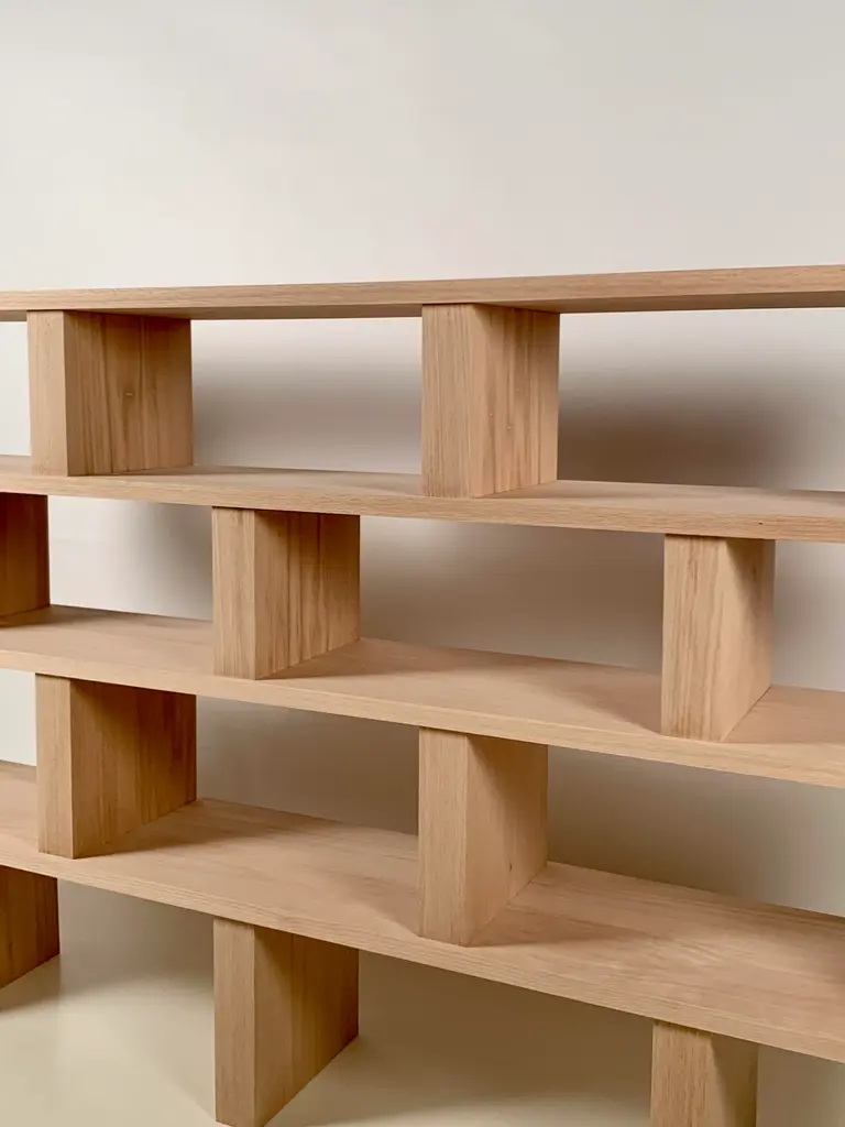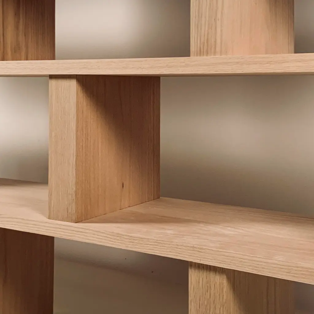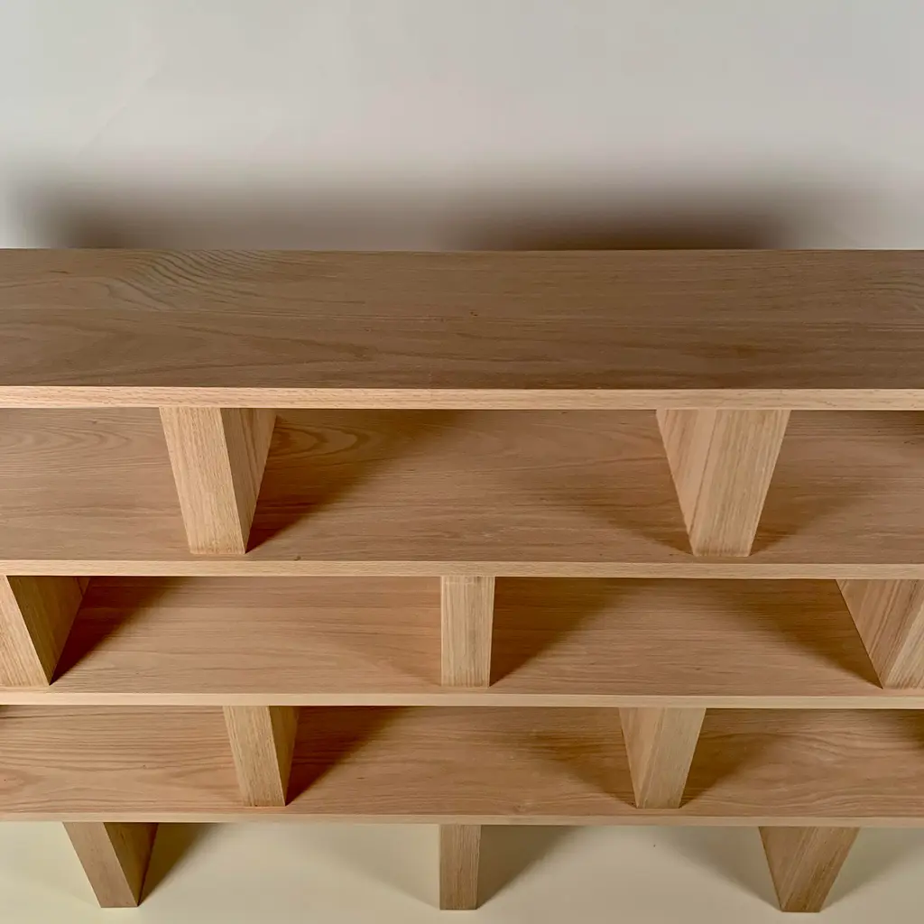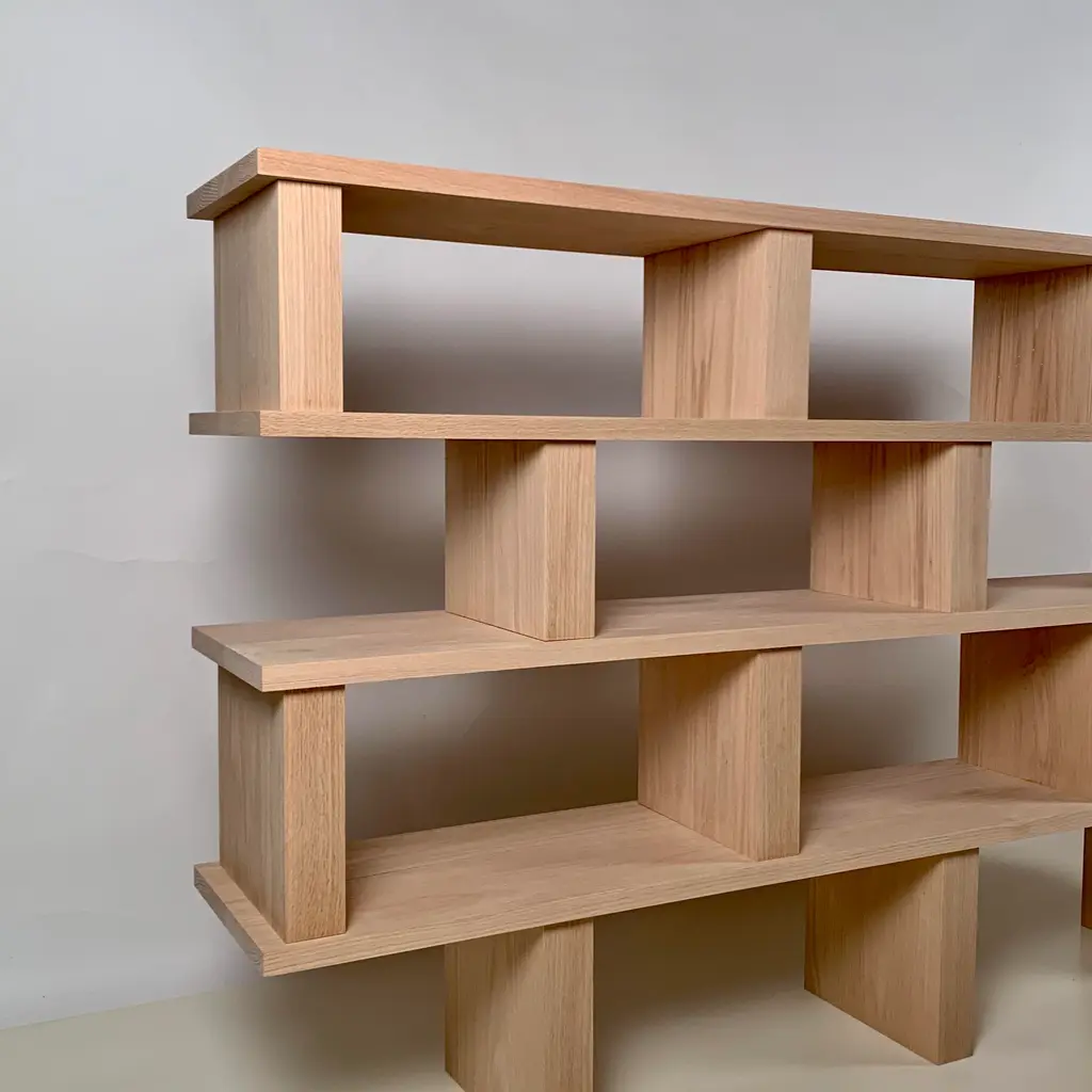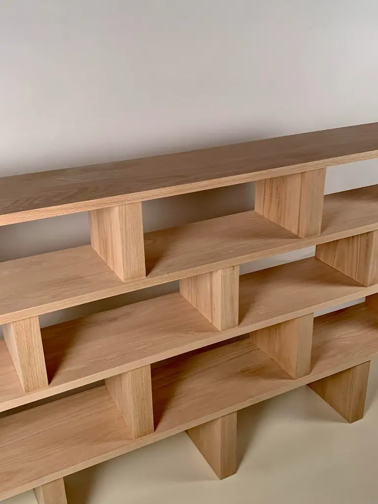 Four shelves 'Verticale' polished oak shelving unit. Highest quality solid oak construction. Comes in 2 parts connected with dowels, for easy shipping, installation, and moving.