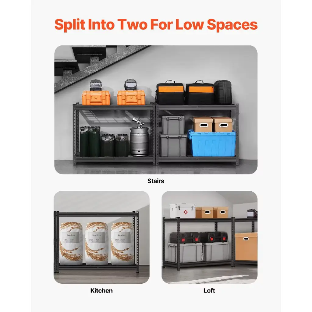 Feature: 2400 lbs Load Capacity: With a maximum total capacity of 2400 lbs and 600 lbs per shelf, our garage shelving unit allows you to store more items and tools in your garage or warehouse. Extremely Durable: Made from SPCC carbon steel, the garage metal shelving features excellent rust and oxidation resistance. It is equipped with a high-quality powder coating that avoids rust and scratches for longer-lasting use. Flexible Design: The adjustable shelf height accommodates various items of different sizes. Our storage shelf for garage also comes with board hooks for side-mounting excess grid plates, expanding your hanging storage space. Easy to Assemble: Installation of garage shelving is effortless, requiring no complicated steps. You only need simply press to install. A rubber hammer and gloves are included for added convenience. Versatile Use: Ideal for kitchens, garages, workshops, supermarkets, and more, this garage storage shelf meets your diverse space needs and helps keep items organized. Package Content 1 x Storage Shelf 1 x Rubber Hammer with Metal Handle 16 x Foot Pads 1 x Pair of Gloves 2 x Anti-Tipping Accessories 4 x Column Connector Blocks 4 x Board Hooks 2 x Plastic Connectors