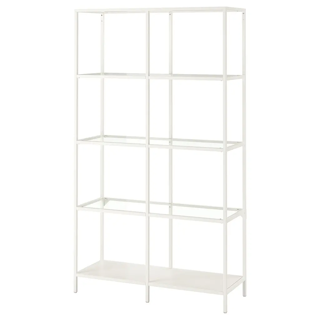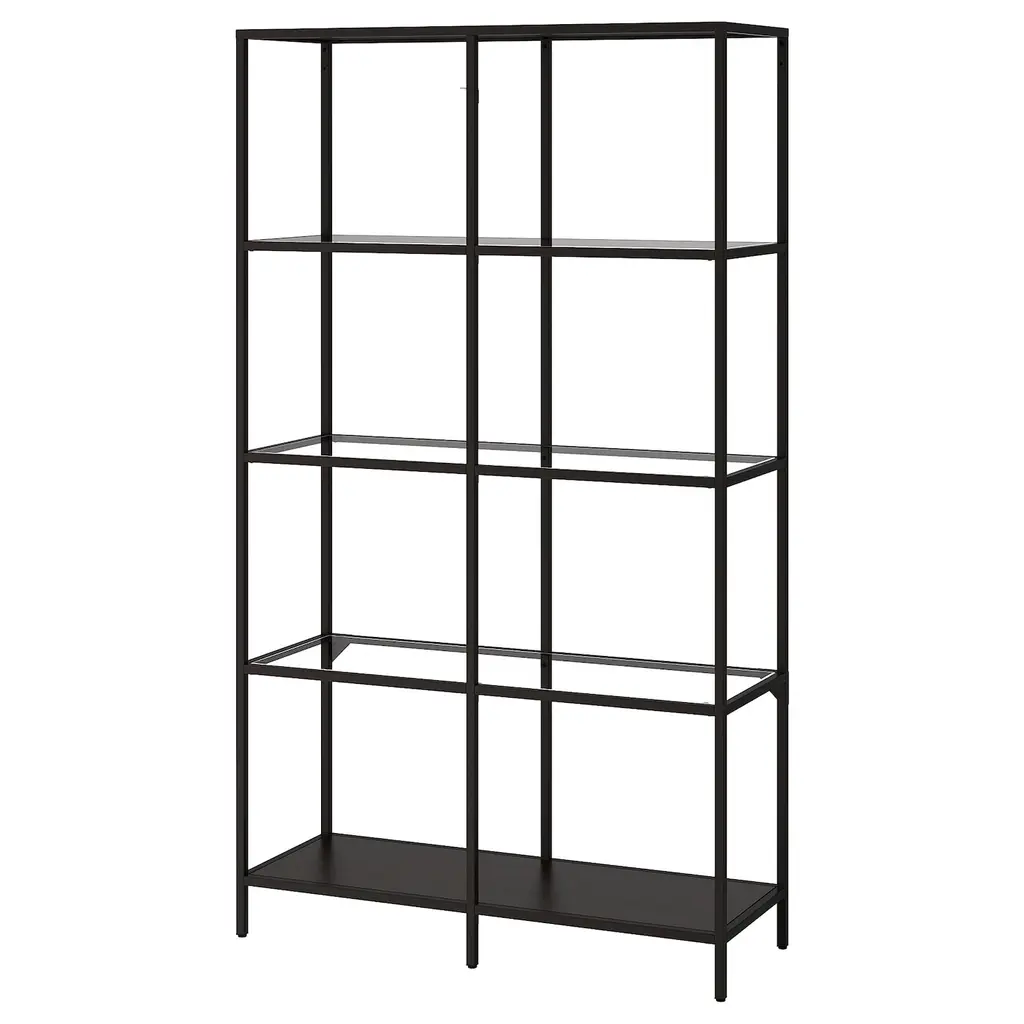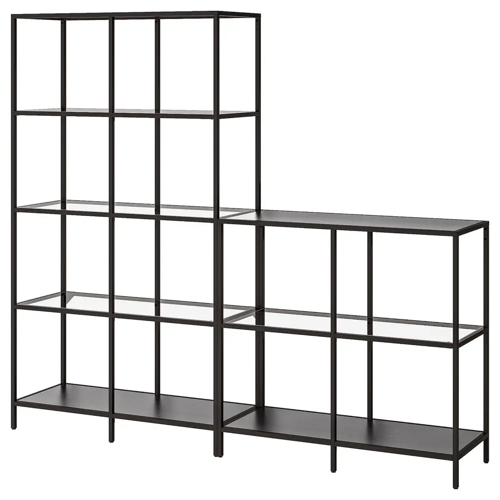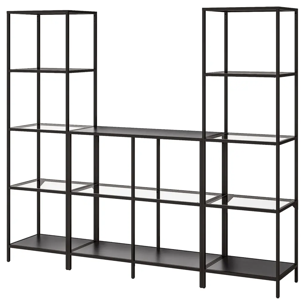 VITTSJÖ Shelf unit - black-brown/glass 39 3/8x68 7/8 ". Tempered glass and metal are durable materials that provide an open, airy feel. A simple unit can be enough storage for a limited space or the foundation for a larger storage solution if your needs change.