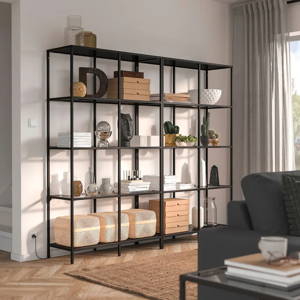 VITTSJÖ Storage combination - black-brown/glass 78 3/4x14 1/8x68 7/8 ". Tempered glass and metal are durable materials that provide an open, airy feel. You can select the look you like best because the top and bottom panels have one black-brown and one black side.