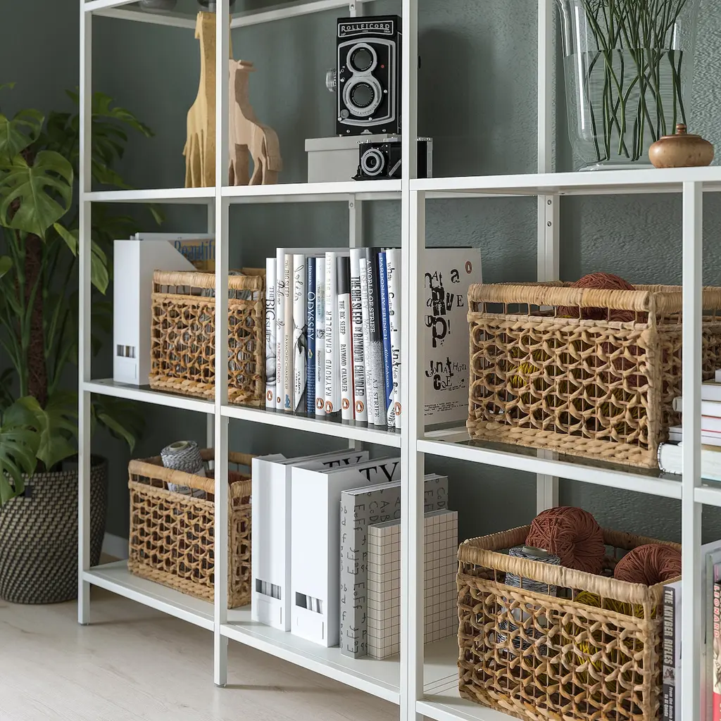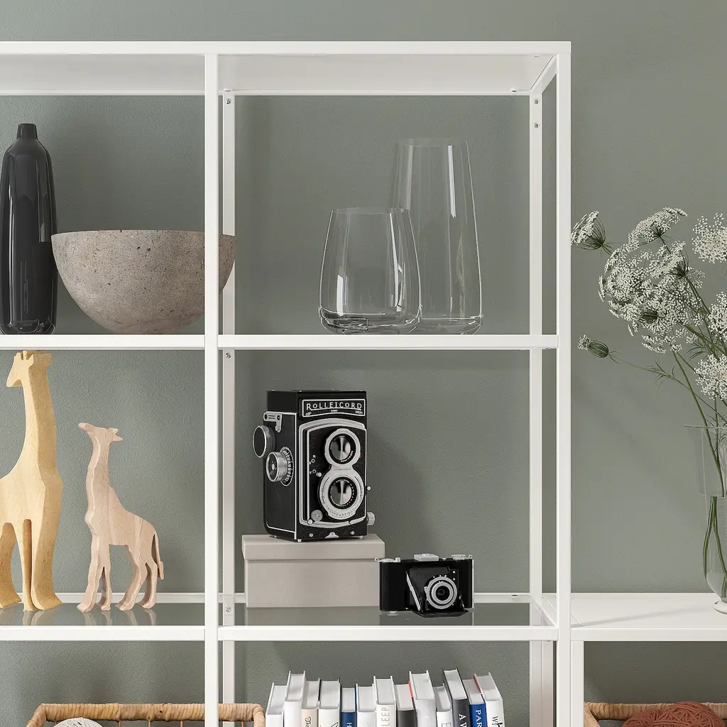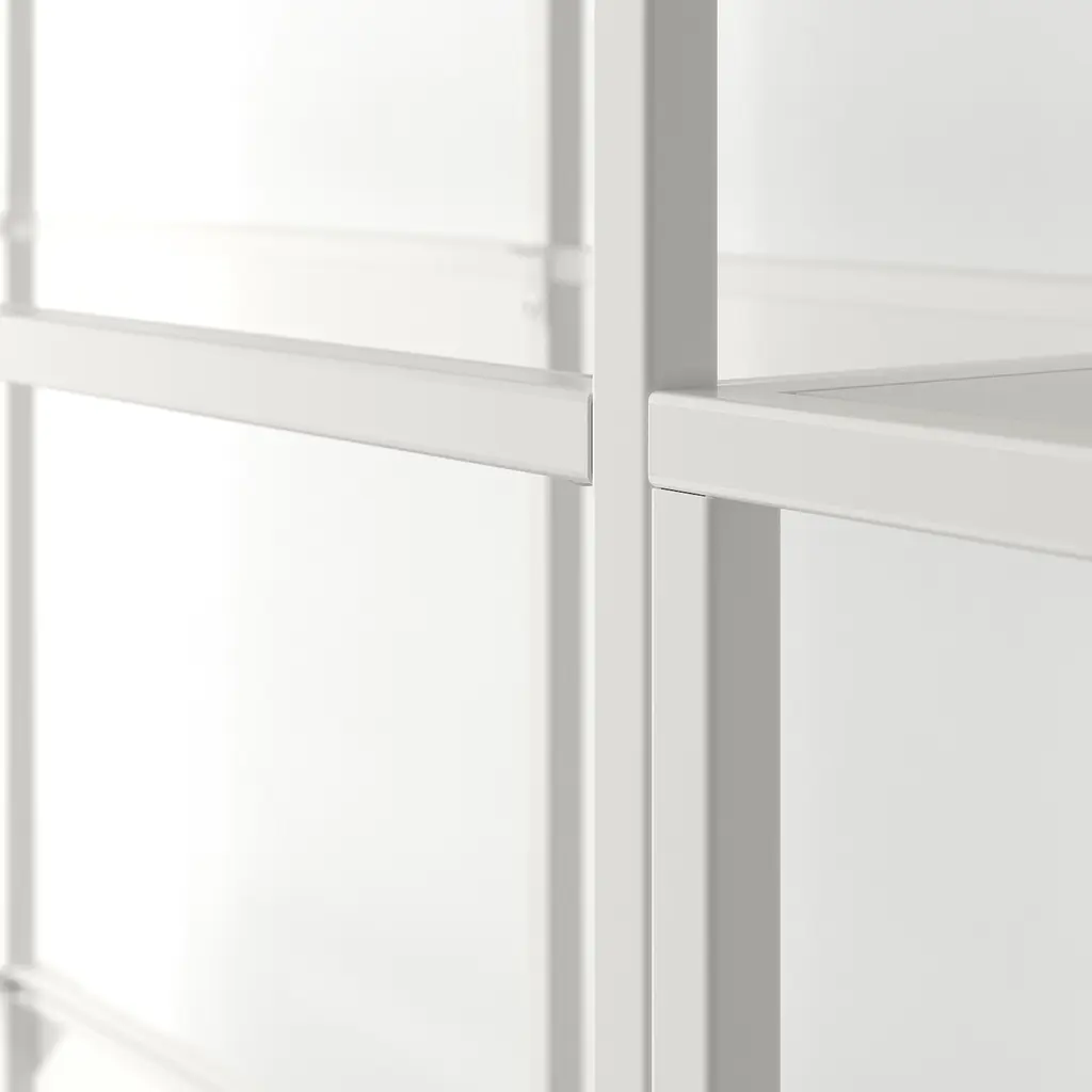VITTSJÖ Storage combination - white/glass 78 3/4x14 1/8x68 7/8 ". Tempered glass and metal are durable materials that provide an open, airy feel. Adjustable feet for stability on uneven floors. This furniture must be secured to the wall with the enclosed wall anchoring device.
