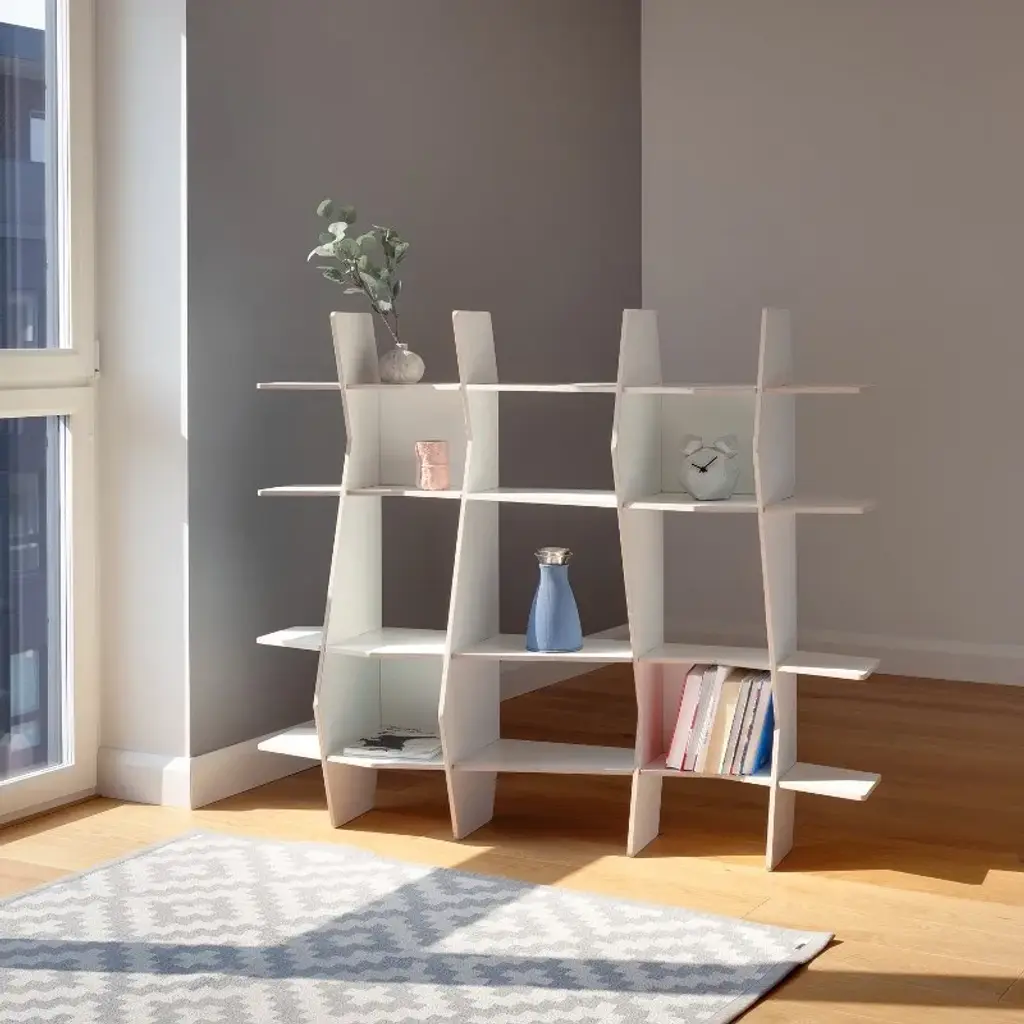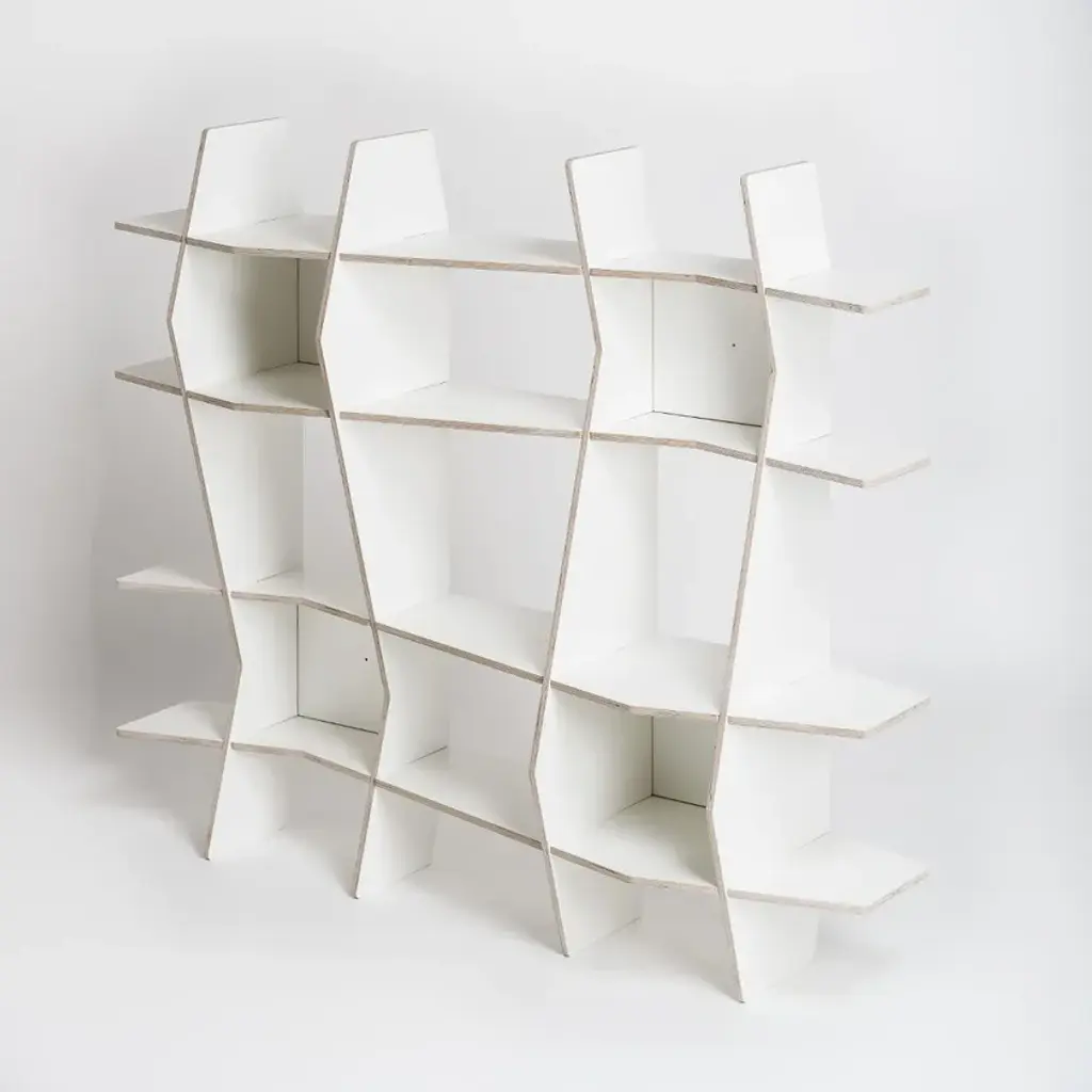 Just go with the flow. Let the magical flow pull you along. There is lots of room for different thoughts and views on the shelves. Your most beautiful possessions will fall into place as if by magic.You can place it horizontally or vertically. Dimensions 121x145cm, depth 16-34cm. Made of birch plywood, oilwaxed or film plywood.Tones: white film laminated