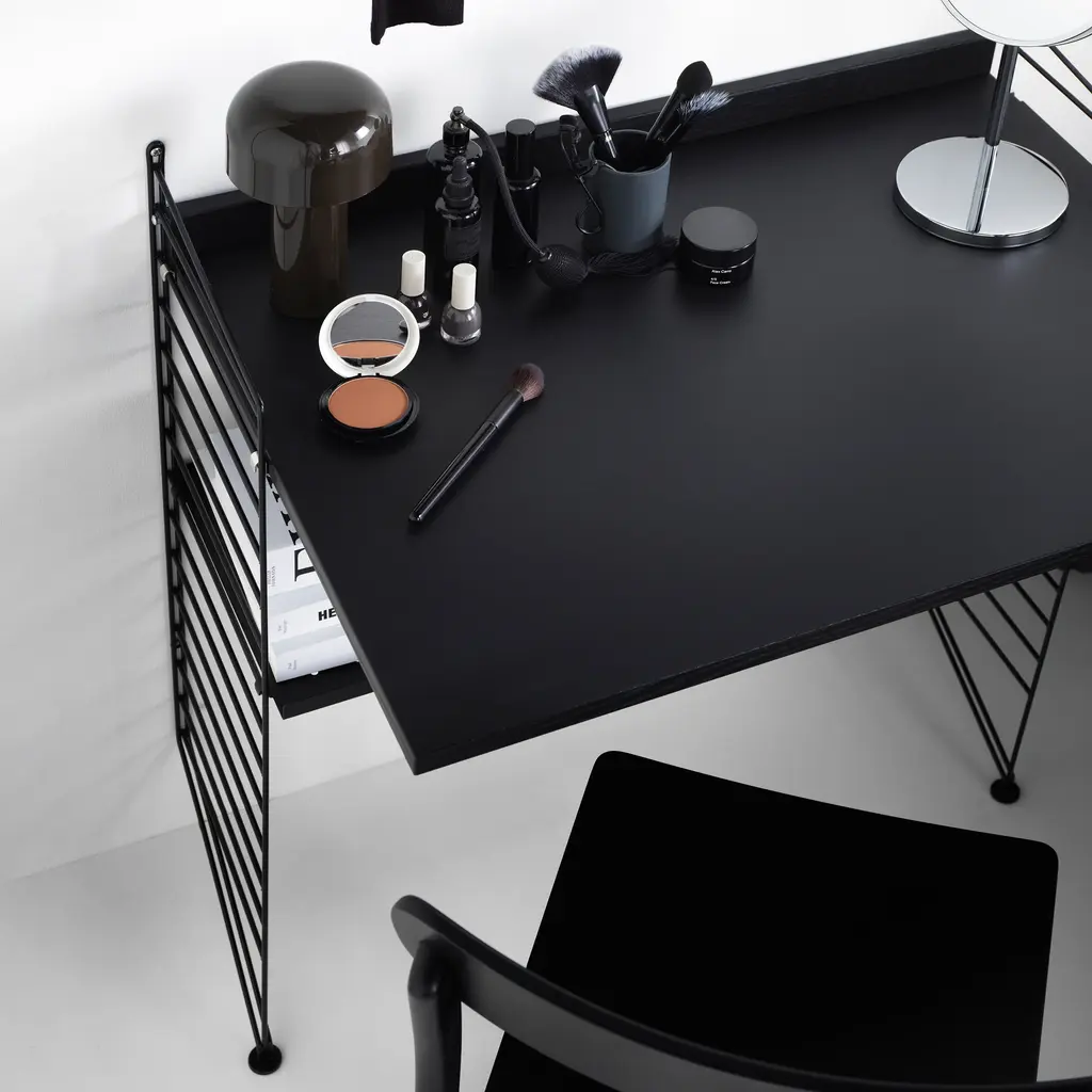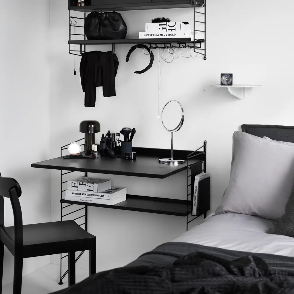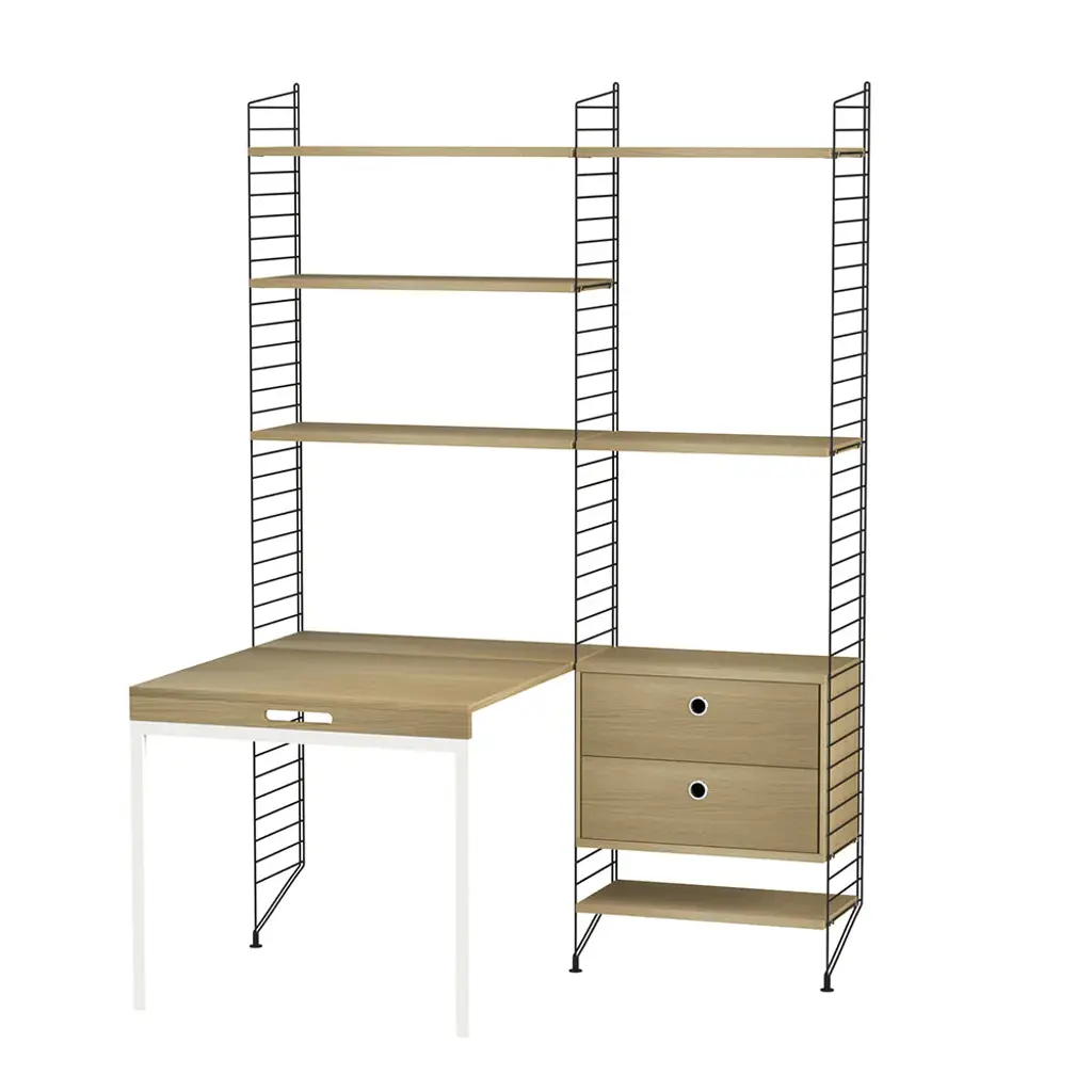 Introducing the Workspace Shelving Unit from String Furniture, the perfect compact solution for cubicles and home offices alike. This floor-mounted, one-section combination features three shelves, plus a work desk, delivering a tasteful and stylish answer to your space-saving needs. Whether you're in the office or the living room, make sure you have the best working environment possible with this sleek storage design. Highlights For in-stock custom color and configurations please call sales team at (888) 222-4410