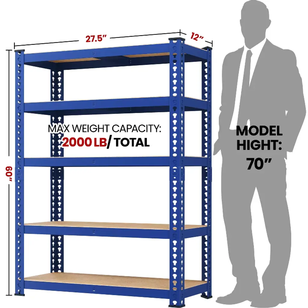 This firm, universal boltless storage shelf is designed for convenient assembly. It is a metal-frame storage rack with a maximum weight capacity of up to 386 lb per shelf. The storage shelves are made from thick MDF for placing items. This black storage shelving can be disassembled to save more space and for convenient transport. The frame can be adjusted to fit various items to be used for storage or display. It can be used in the garage, balcony, kitchen, etc. Specifications: Colour: Dark Grey, Light Grey, Blue, Silver, Black, Neptune BlueMaterials: iron frame with powder coated, MDF BoardsOverall Dimensions: 27.5" L × 12" W × 60" HMax Weight Capacity (per shelf): 330 lb Please see the image for exact measurements.Please allow ±0.5" measurement tolerance.A rubber mallet is recommended for assembly. The rubber mallet is not included. Thanks for your understanding!