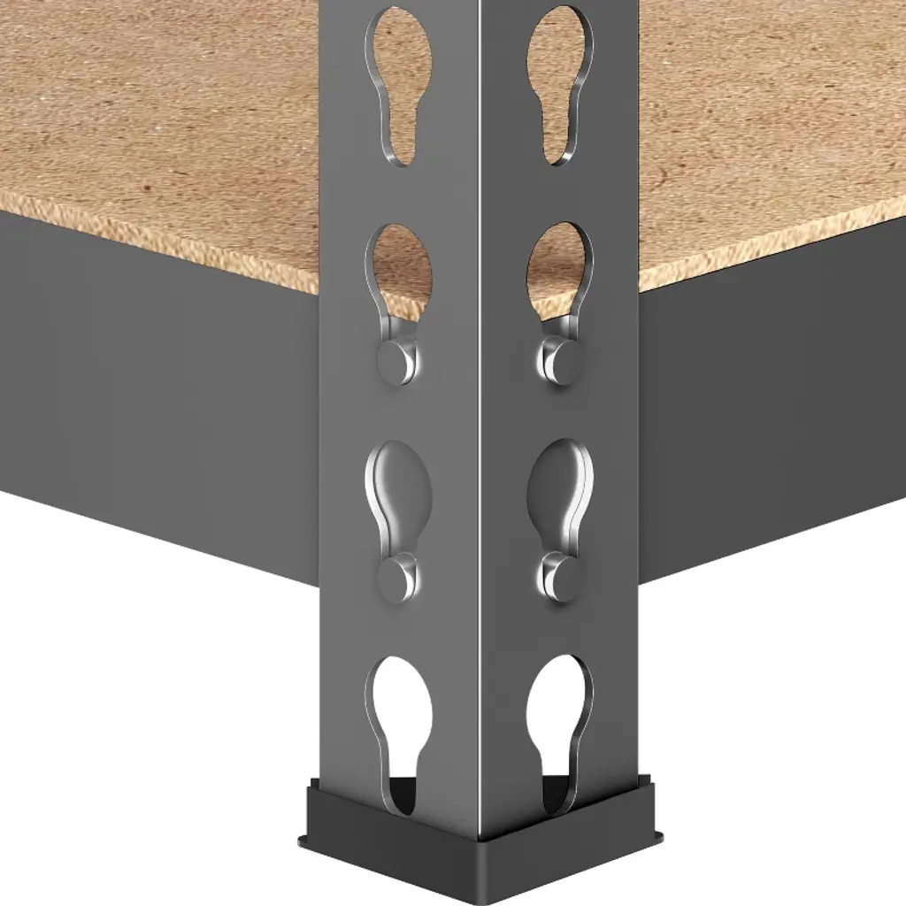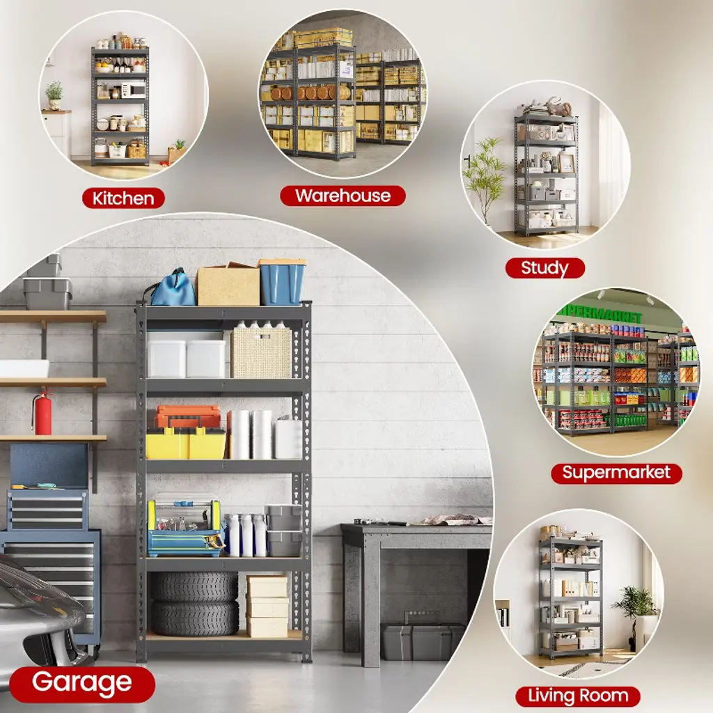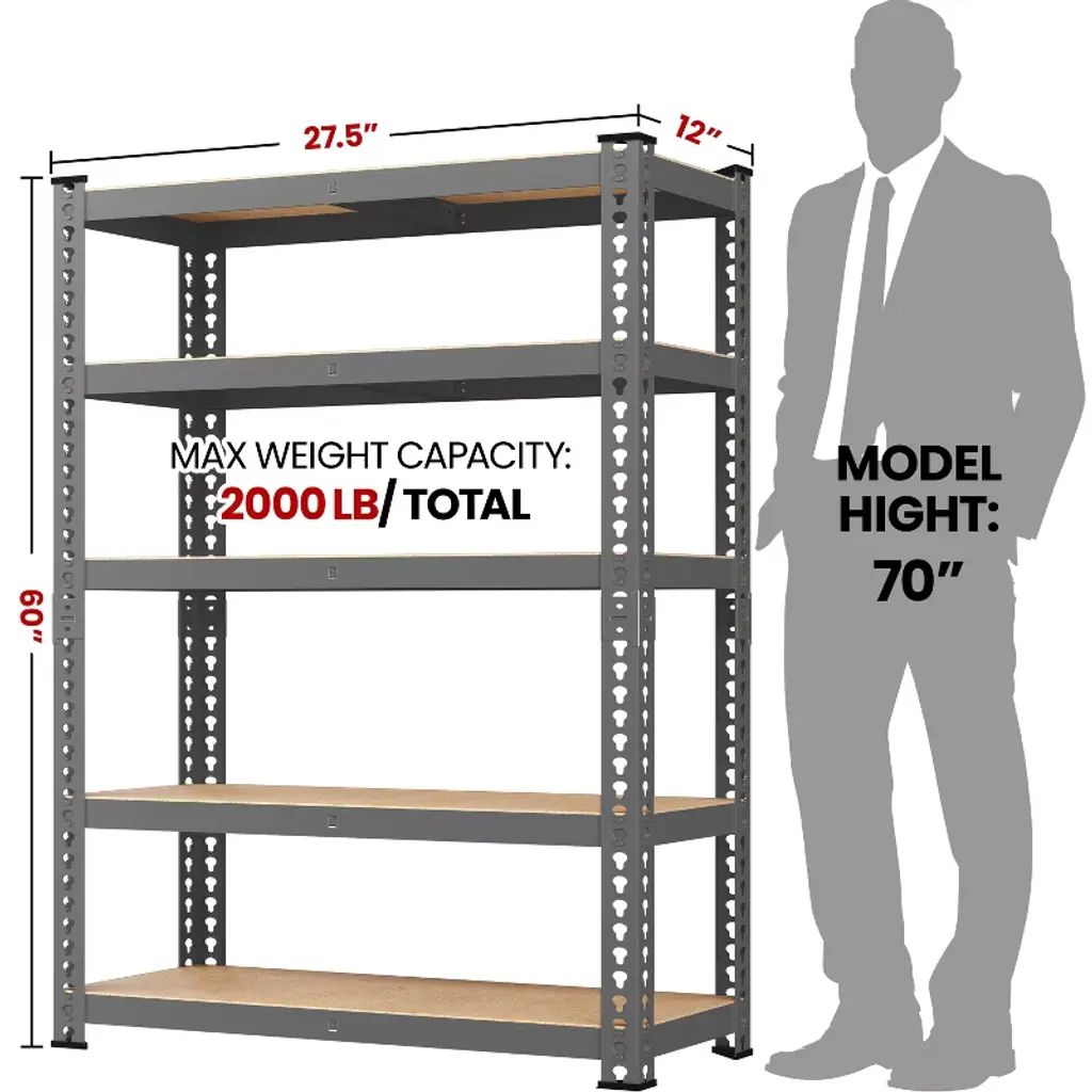 This firm, universal boltless storage shelf is designed for convenient assembly. It is a metal-frame storage rack with a maximum weight capacity of up to 386 lb per shelf. The storage shelves are made from thick MDF for placing items. This black storage shelving can be disassembled to save more space and for convenient transport. The frame can be adjusted to fit various items to be used for storage or display. It can be used in the garage, balcony, kitchen, etc. Specifications: Colour: Dark Grey, Light Grey, Blue, Silver, Black, Neptune BlueMaterials: iron frame with powder coated, MDF BoardsOverall Dimensions: 27.5" L × 12" W × 60" HMax Weight Capacity (per shelf): 330 lb Please see the image for exact measurements.Please allow ±0.5" measurement tolerance.A rubber mallet is recommended for assembly. The rubber mallet is not included. Thanks for your understanding!