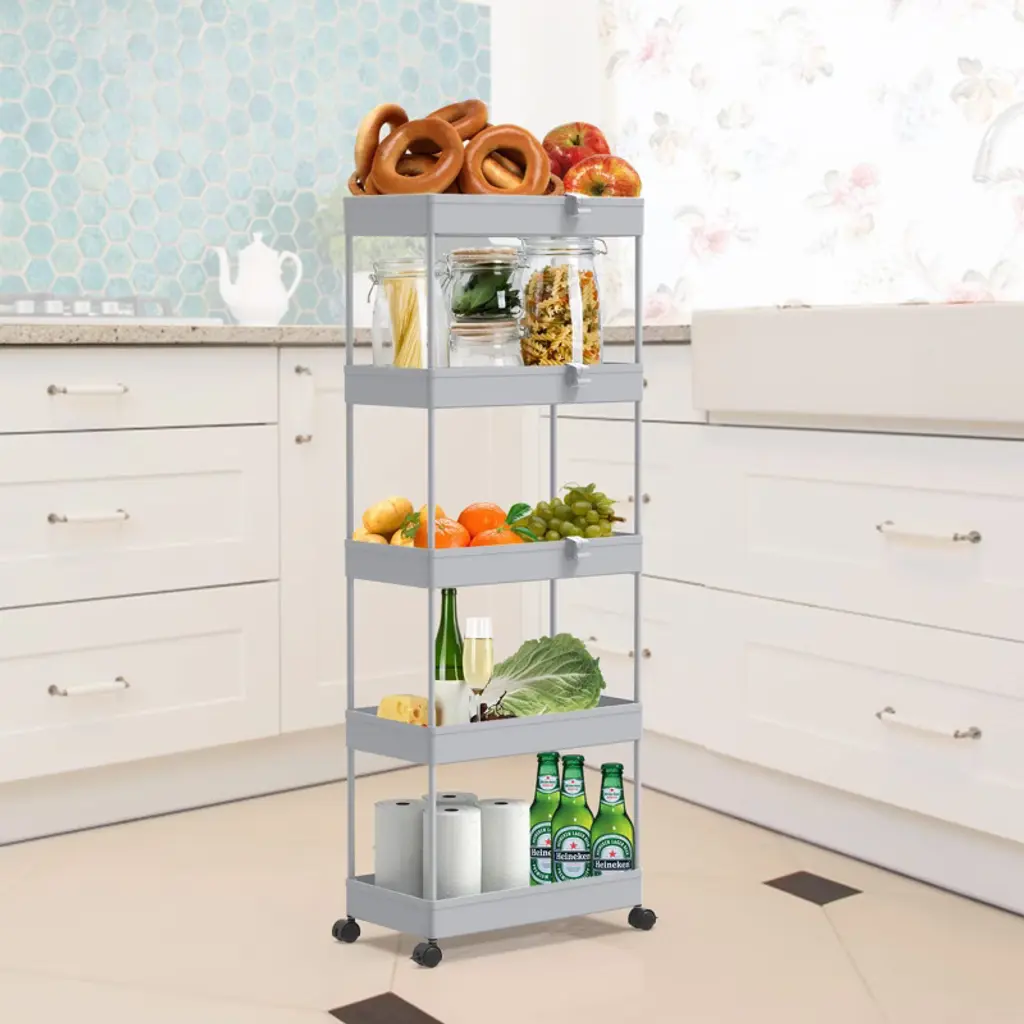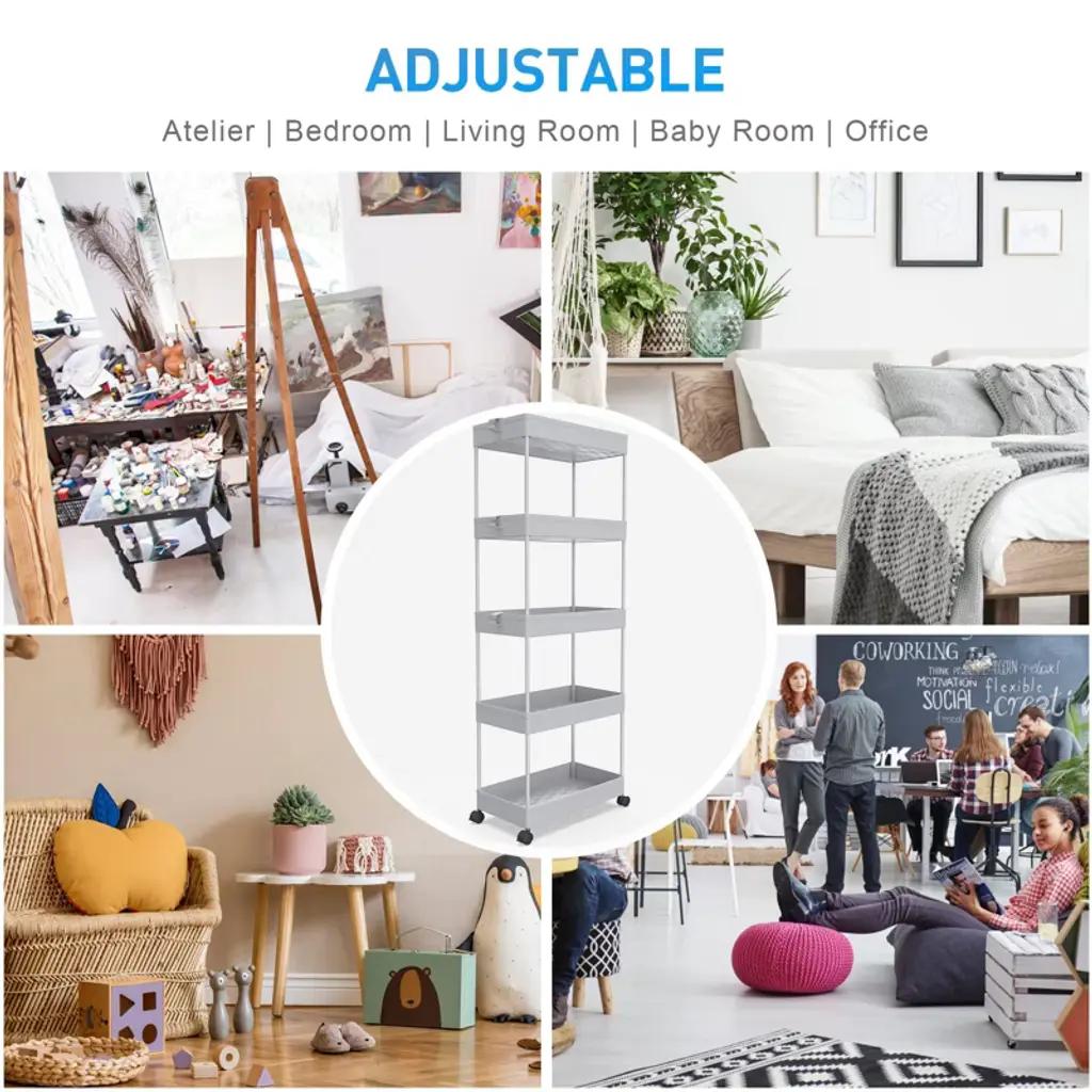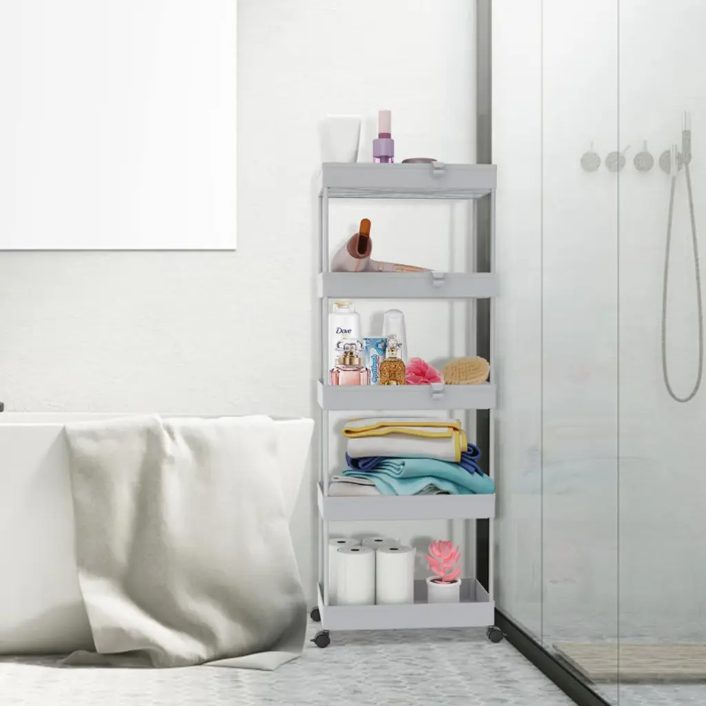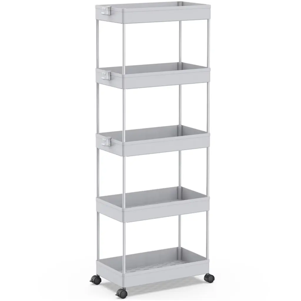 The 5-tier Rolling storage utility cart is 8.66 in design which can be used in tight spaces in your home for storage. Suitable for closets, kitchens, bathrooms, garages, laundry rooms, offices.