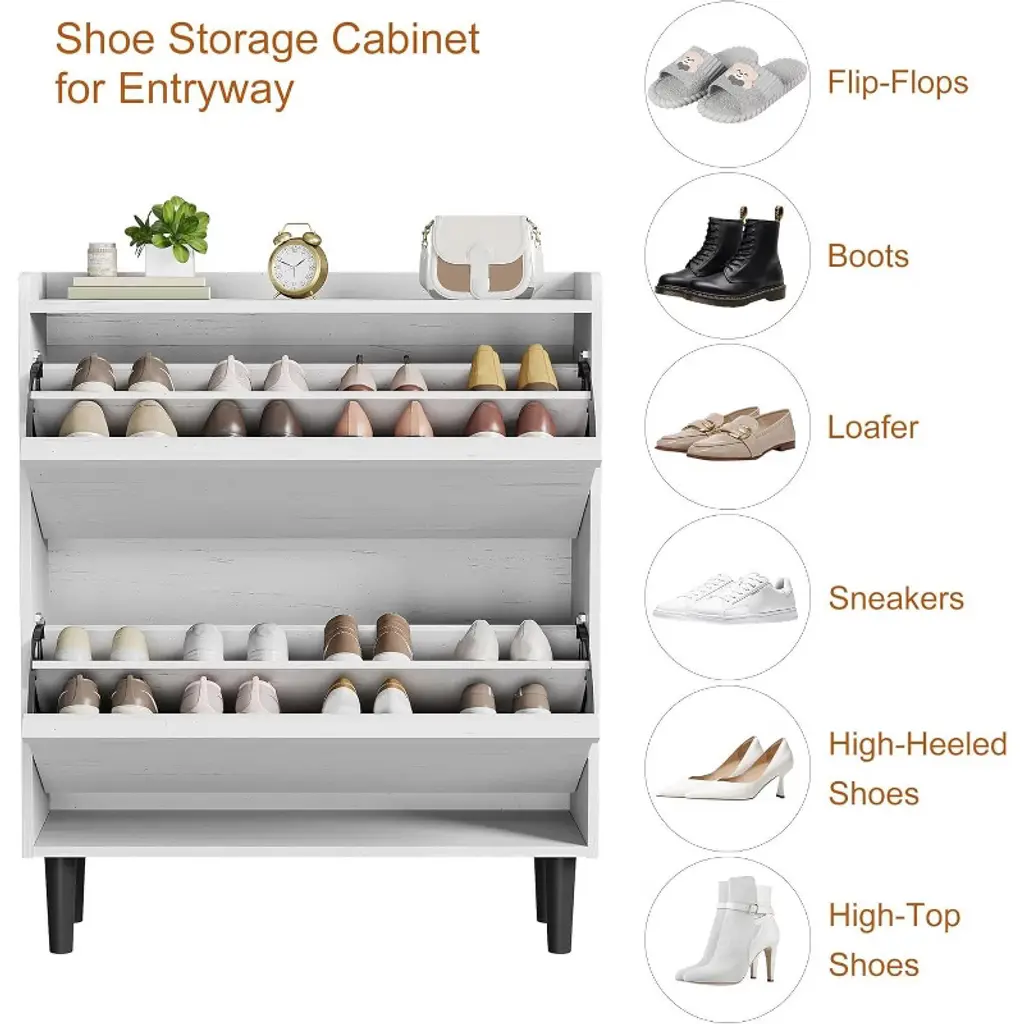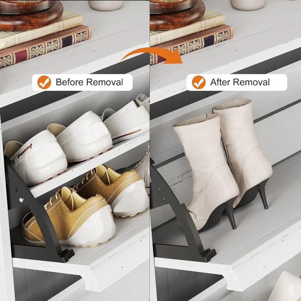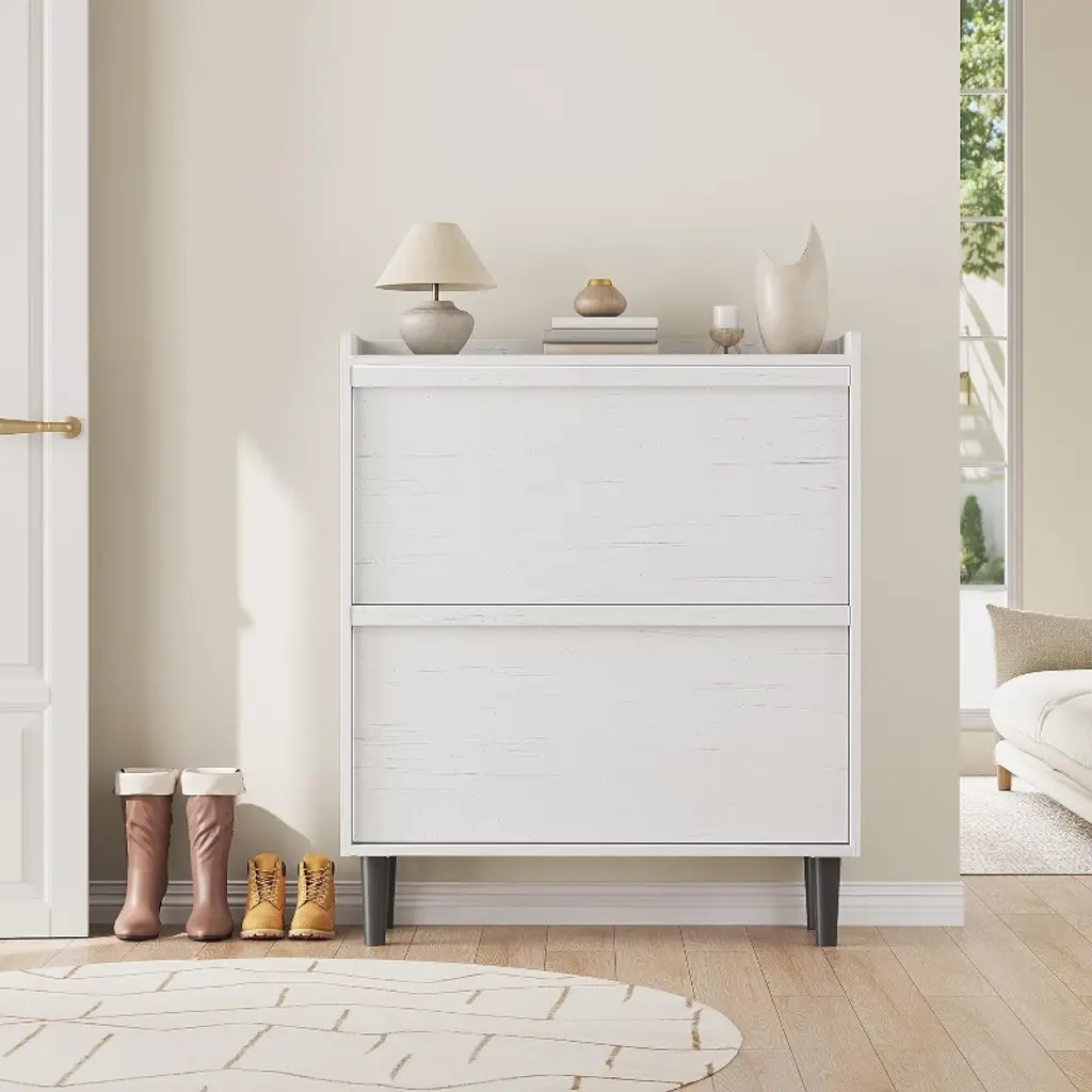 Organize your entryway, hallway, or living room with this elegant 2-Drawer Wooden Shoe Cabinet. Designed for modern homes, this freestanding shoe organizer blends style and function, keeping footwear hidden yet easily accessible. The spacious interior can store 18–24 pairs of shoes, with adjustable panels to fit a variety of styles and sizes—including men’s shoes up to size 12.Crafted from durable MDF engineered wood, the cabinet offers a stable structure, a waterproof top surface, and interior shelves that are built to support daily use. The flip drawer design maximizes floor space while providing a seamless, streamlined look. For added safety, the cabinet includes an anti-tip device for wall anchoring, ensuring stability for households with kids and pets.