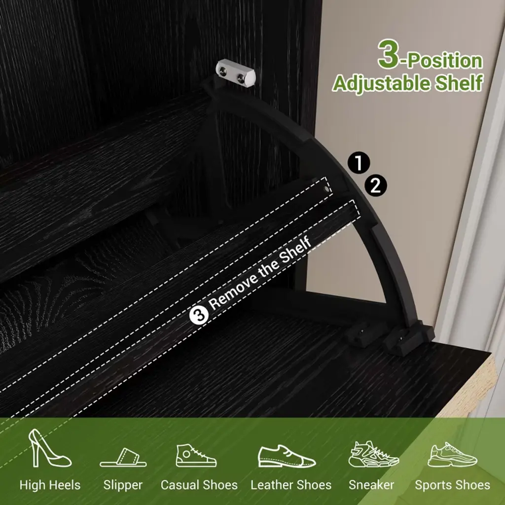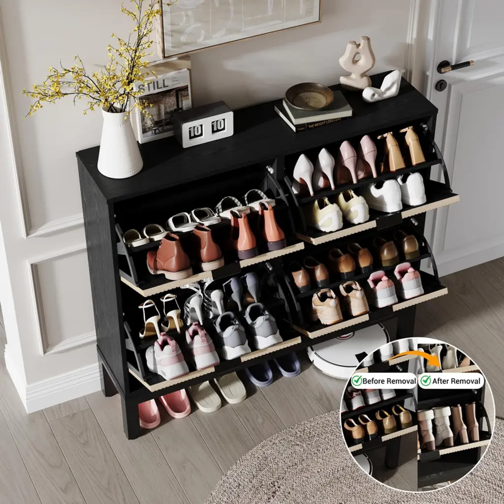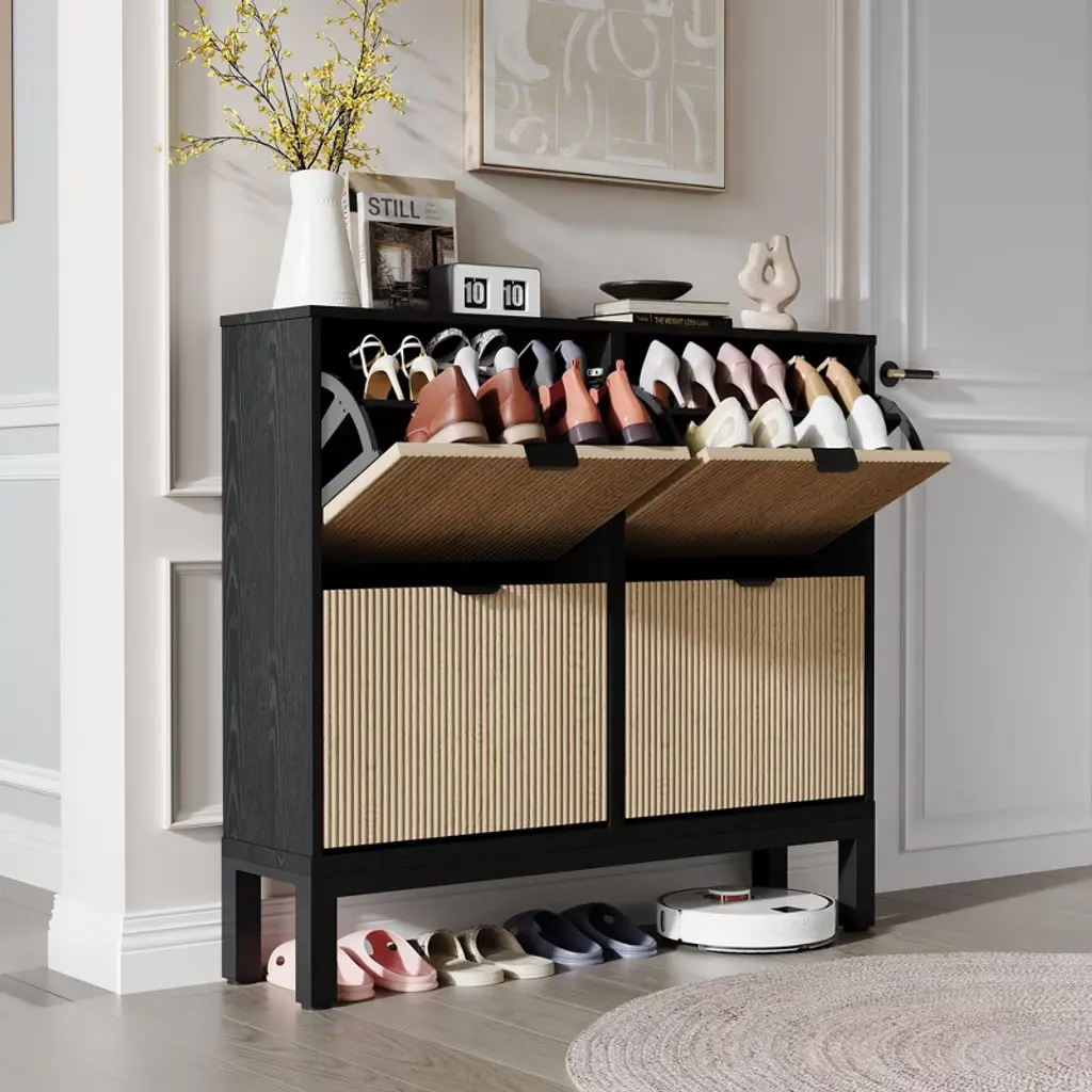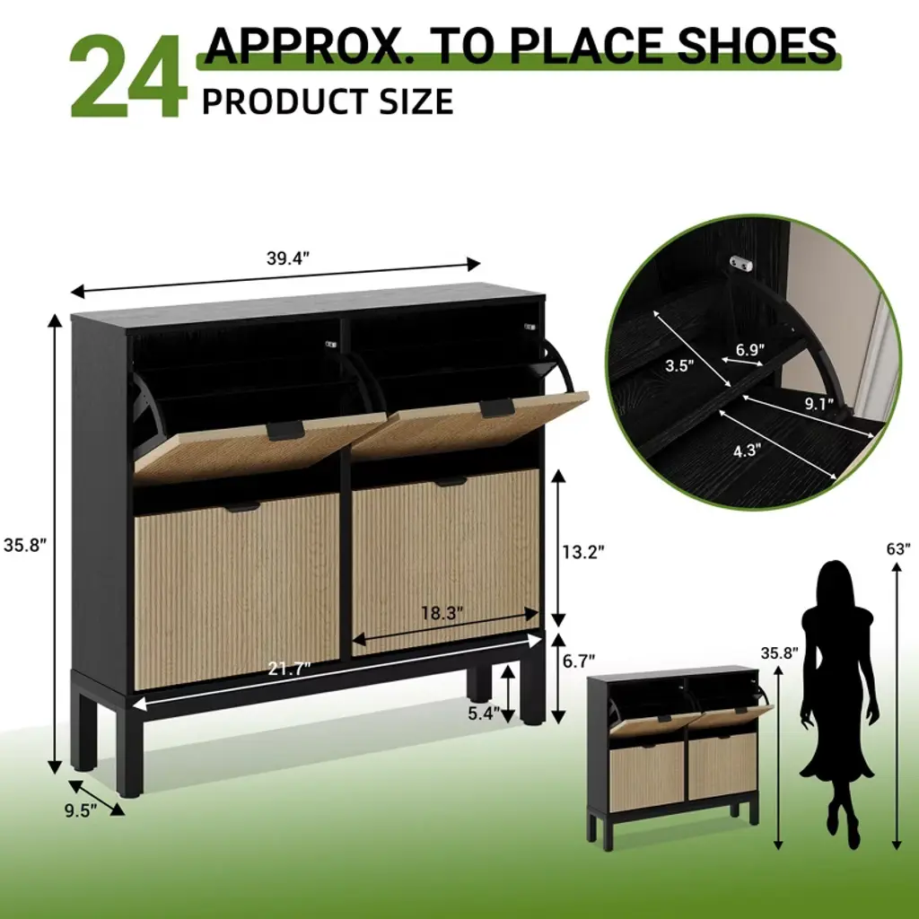 This shoe storage cabinet features 4 flip drawers, each with two-tier storage, accommodating up to 24 pairs of shoes. The spacious top surface provide the perfect spot for your keys, wallet, and accessories¡ªkeeping essentials within easy reach. Besides, featuring fluted panel detailing and a chic contrast-color design, this freestanding shoe organizer adds a touch of rustic charm to your home. A perfect blend of style and functionality to keep your entryway tidy and elegant.