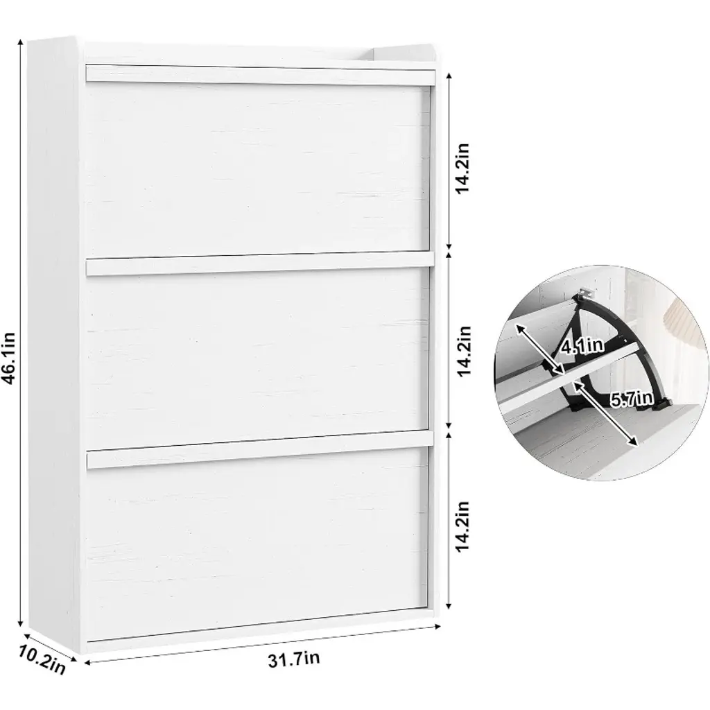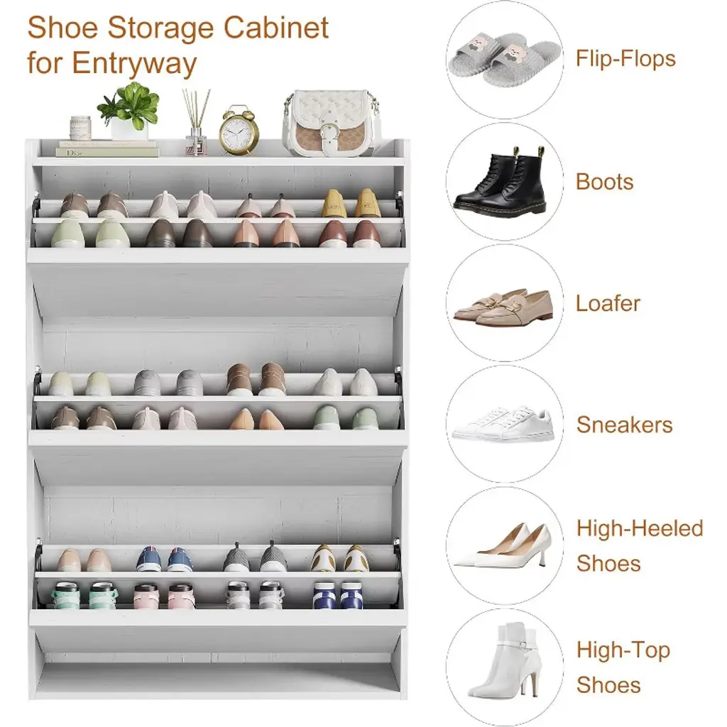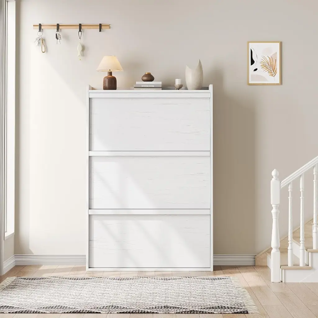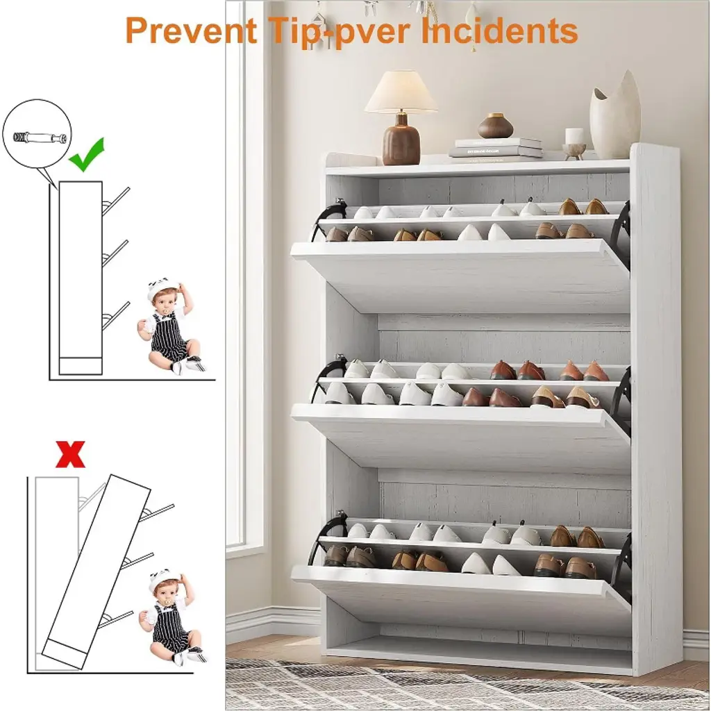 Keep your entryway or hallway organized with this stylish 3-Drawer Wooden Shoe Cabinet. Designed to fit narrow spaces, it offers ample storage for 18 to 24 pairs of shoes, including sneakers, boots, heels, and men’s footwear up to size 12. Adjustable interior shelves allow you to customize the fit, while flip drawers provide smooth, space-saving access to your shoes. Constructed from high-quality, waterproof MDF engineered wood, this shoe cabinet features a sturdy tabletop supporting up to 25 pounds and shelves rated for 12 pounds each. An anti-tip safety device anchors the unit securely to the wall, ensuring stability for families with children or pets.