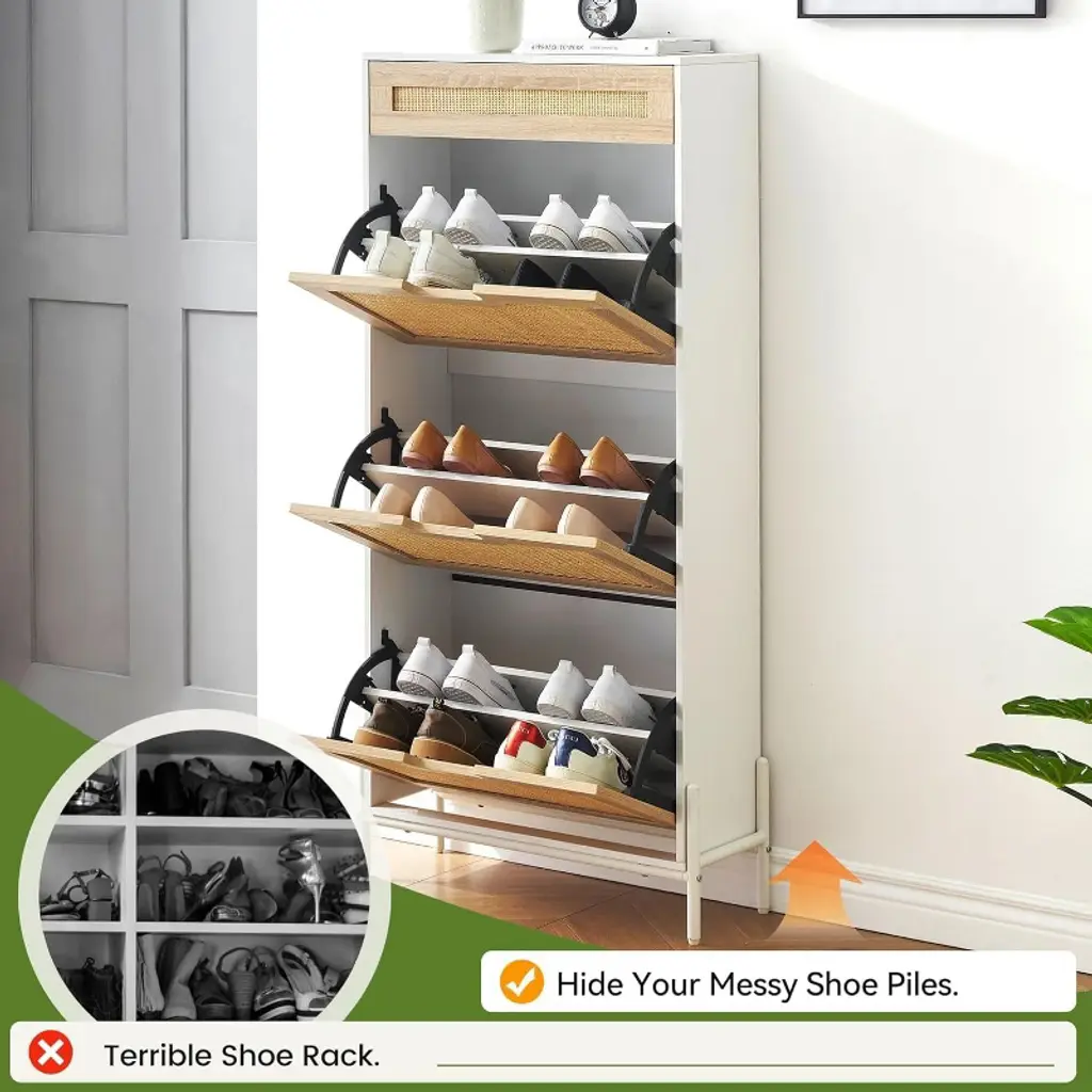 The Acekool Rattan Shoe Cabinet blends natural elegance with practical design to help organize your entryway or living space. Featuring handwoven rattan panels and a solid wood frame, it offers breathable storage that keeps your shoes fresh and odor-free. This cabinet provides ample space with three flip-down drawers for shoes, a top drawer for keys or small items, and four adjustable shelves that fit a variety of shoe styles, including boots. Its sturdy construction with metal legs ensures reliable stability, and an anti-tip device adds safety for busy homes. Designed to fit compact spaces, it measures 24 inches wide, 9.4 inches deep, and 53.7 inches tall. The assembly is straightforward with labeled parts and detailed instructions included, making setup easy for anyone. Specifications: Dimensions: 24" W × 9.4" D × 53.7" H Storage Capacity: Holds 18–21 pairs of shoes Features: 3 flip drawers, 1 top drawer, 4 adjustable shelves, breathable rattan panels, metal legs, anti-tip device Ideal Use: Entryway, hallway, bedroom, living room