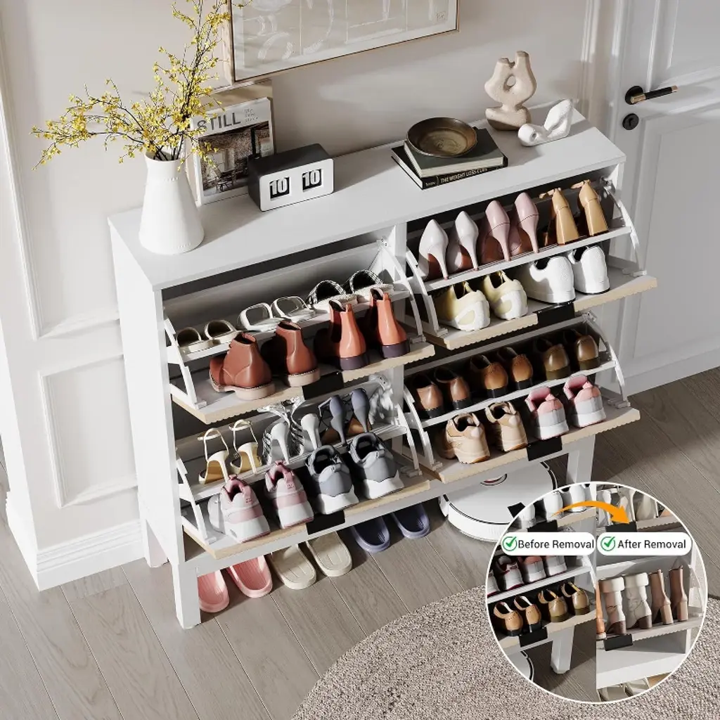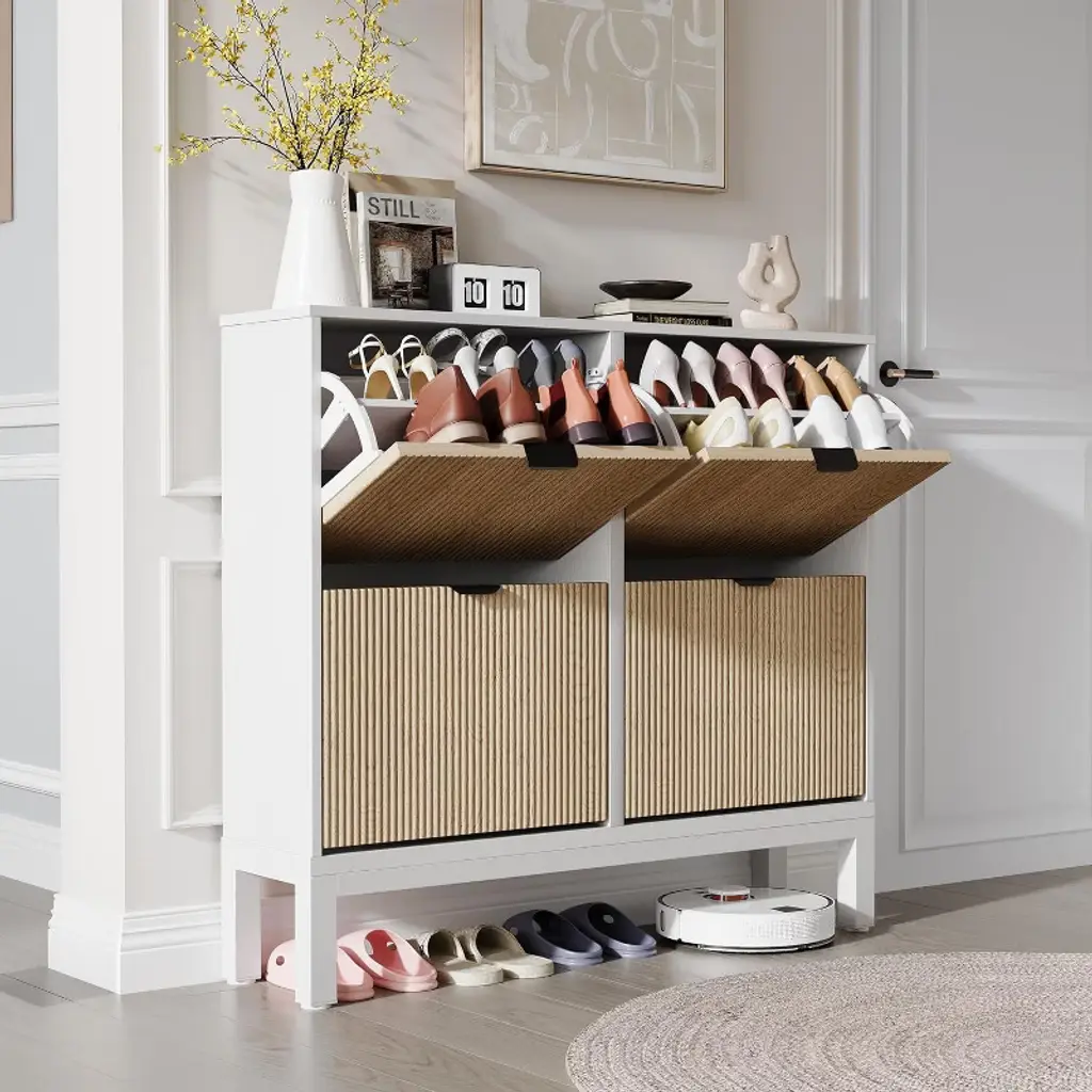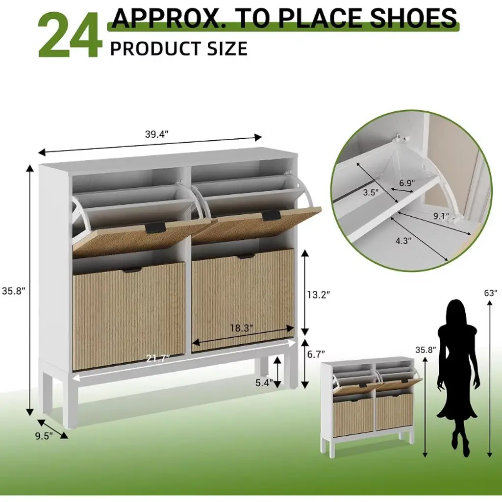 Acekool Shoe Cabinet Storage With 4 Flip Drawers, Adjustable Shelves & Metal Legs – White + Oak