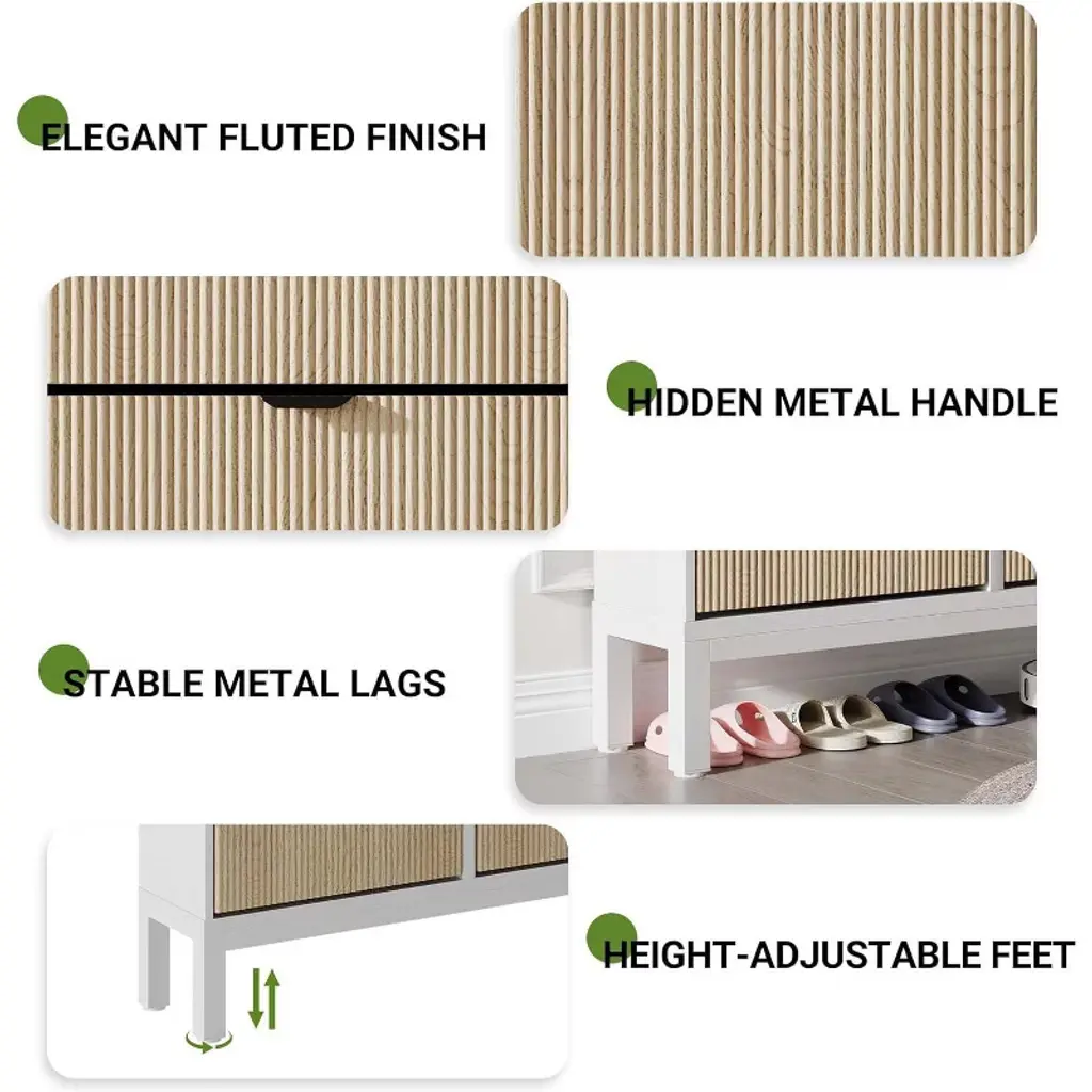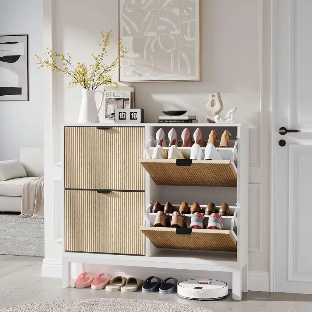 The Acekool Shoe Cabinet Storage combines style and function to keep your entryway organized. With 4 flip drawers and two-tiered storage, it holds up to 24 pairs of shoes while its spacious top surface offers room for essentials like keys and wallets. Featuring a farmhouse-inspired design with fluted panels and contrast colors, this slim cabinet fits well in small spaces. Adjustable feet ensure stable placement on any floor, and removable dividers let you customize storage for different shoe types. Metal legs provide sturdy support, and the included tip-over restraint kit adds safety for families with kids or pets. Measuring to fit narrow entryways, this shoe cabinet comes in white + oak, gray + white, and black + oak finishes. Assembly is straightforward with clear instructions and labeled parts, making it a practical and stylish addition to your home.