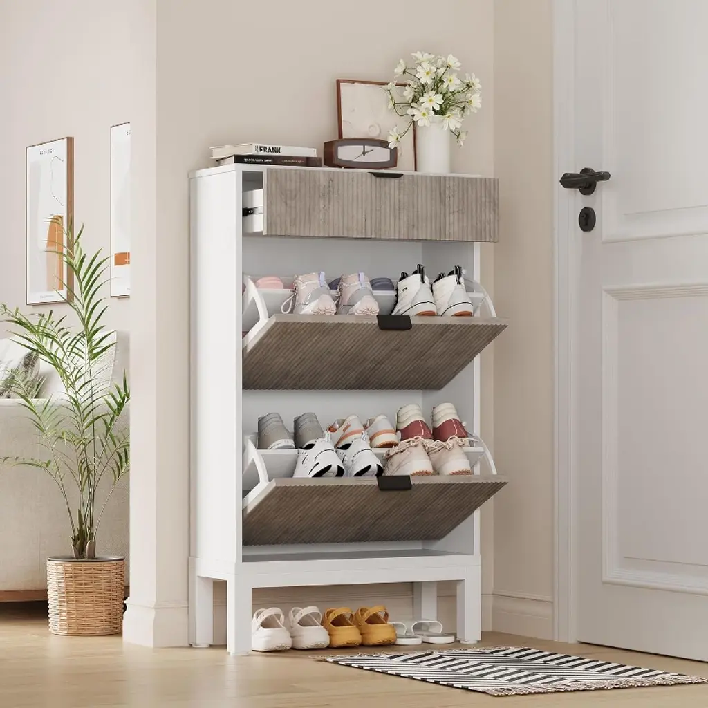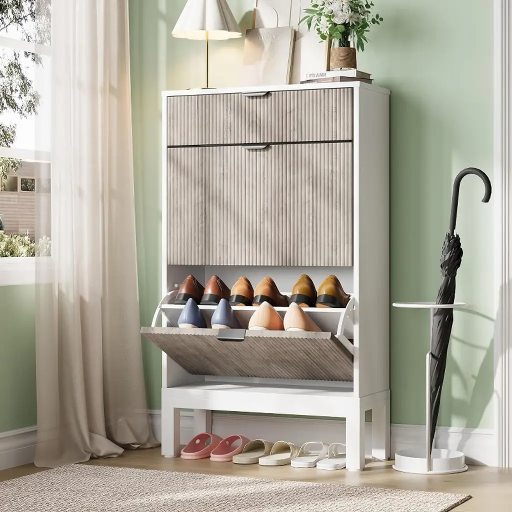 Acekool Slim Shoe Cabinet With 2 Flip Drawers & Small Storage Drawer, Fluted Door Design – Gray + White