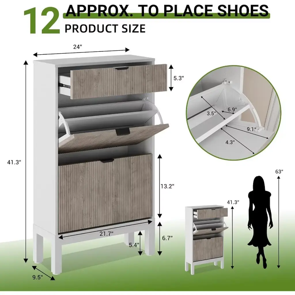 The Acekool Shoe Storage Organizer offers a stylish and space-saving way to keep shoes and small essentials neatly arranged. Featuring two flip drawers with removable shelves, it holds up to 12 pairs of shoes while the added top drawer stores accessories like keys or sunglasses for easy access. Designed with fluted doors and a delicate wave texture, this slim cabinet brings a modern, mid-century vibe to your entryway. Supported by sturdy metal legs and crafted from engineered wood, it ensures stable, secure storage. This shoe rack measures 24.02 inches wide by 9.45 inches deep and 41.34 inches tall, making it a smart choice for smaller spaces such as apartments or narrow foyers. Available in white + oak, gray + white, and black + oak to suit various decorating styles.