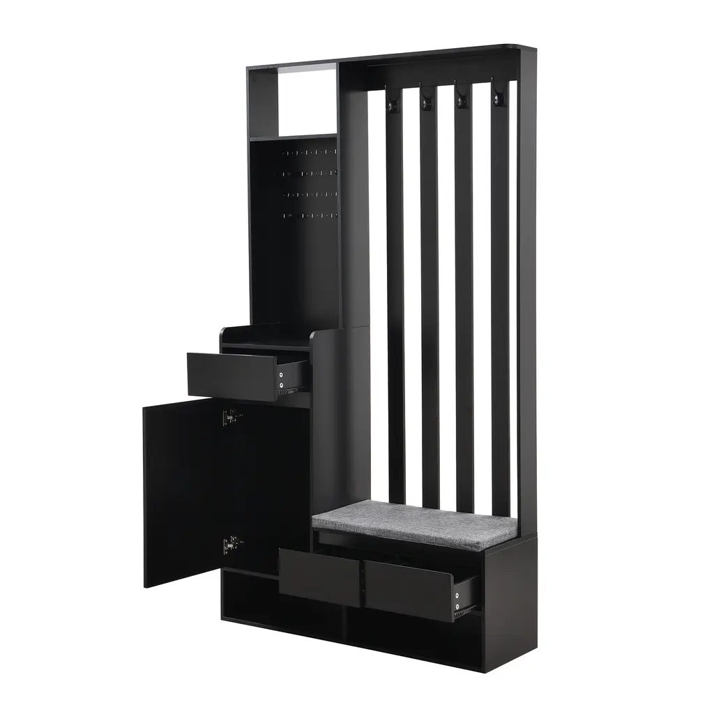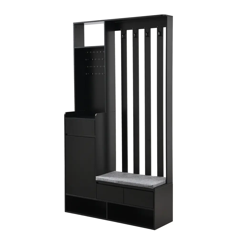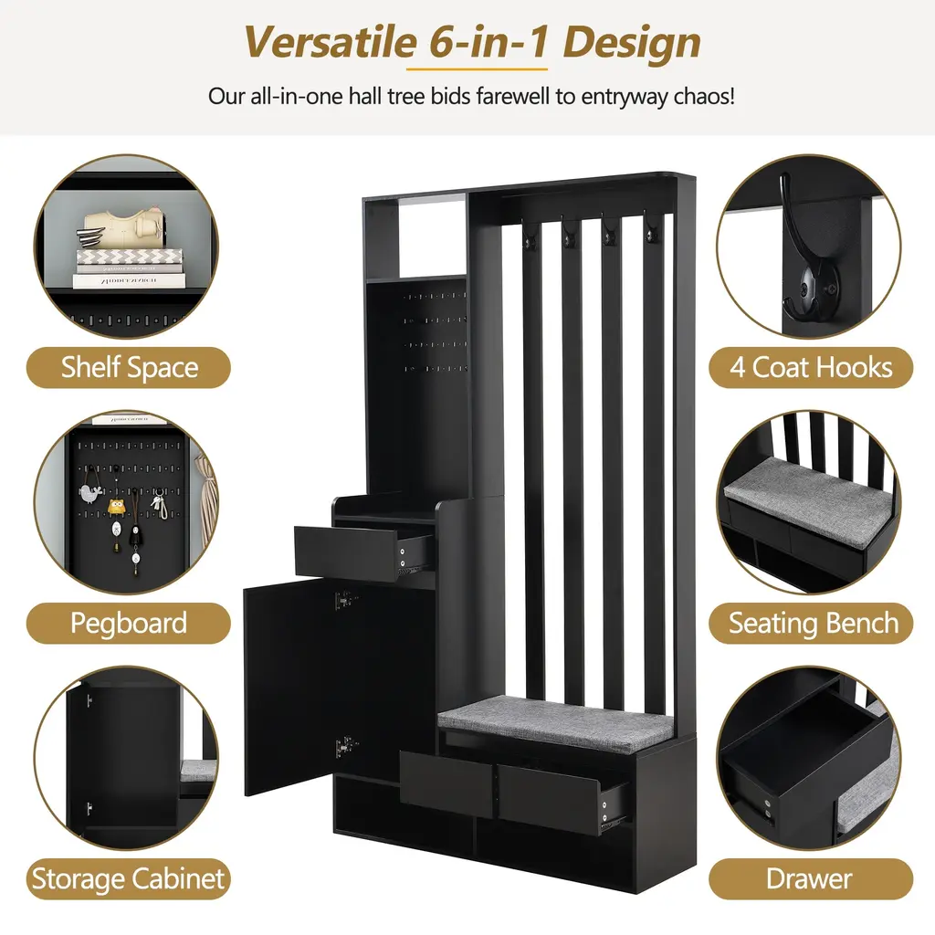 Contemporary Hall Tree Storage With Cushioned Storage Bench,multifunctional Hallway Shoe Cabinet With Pegboard - Black