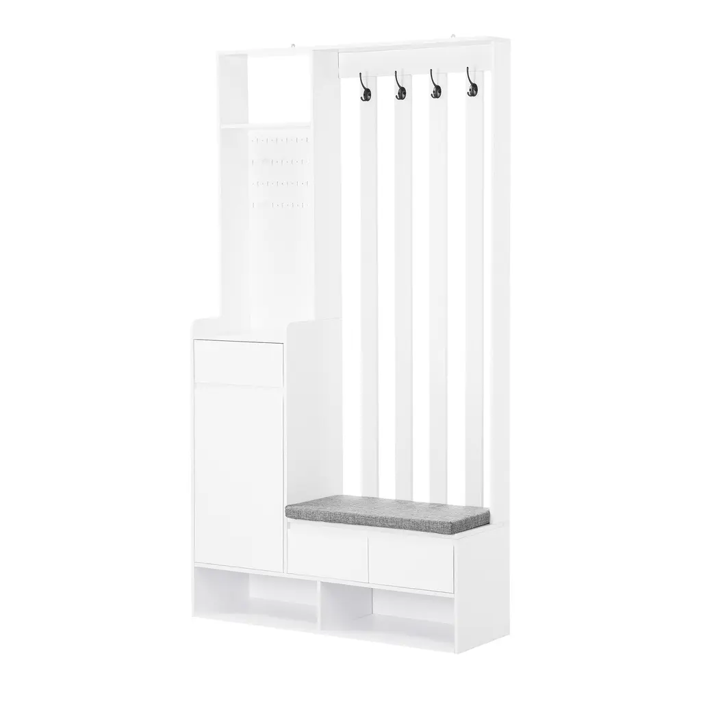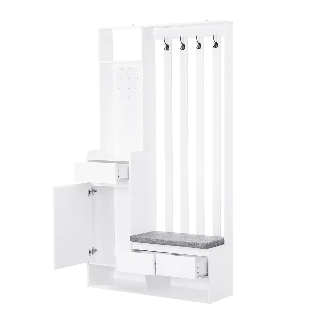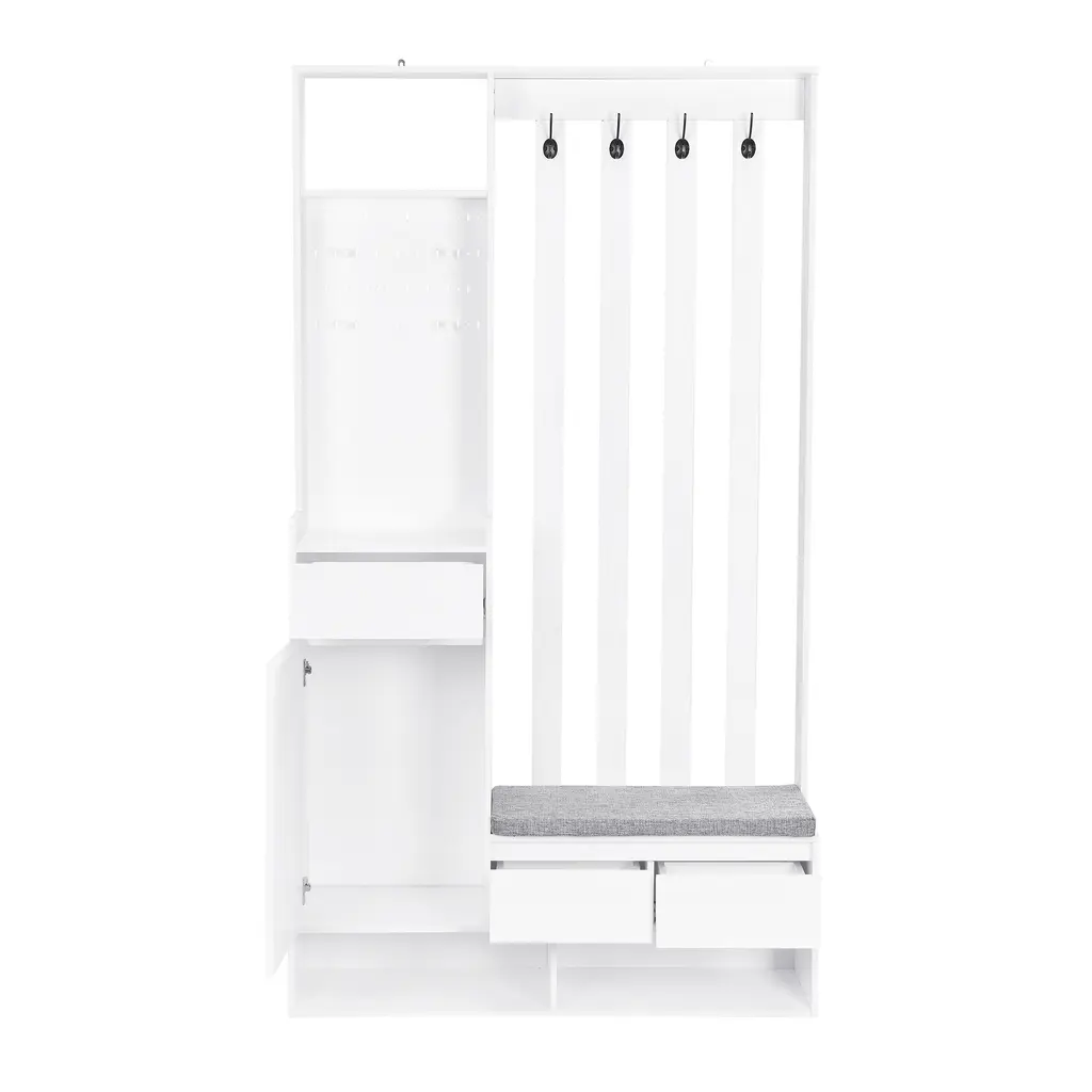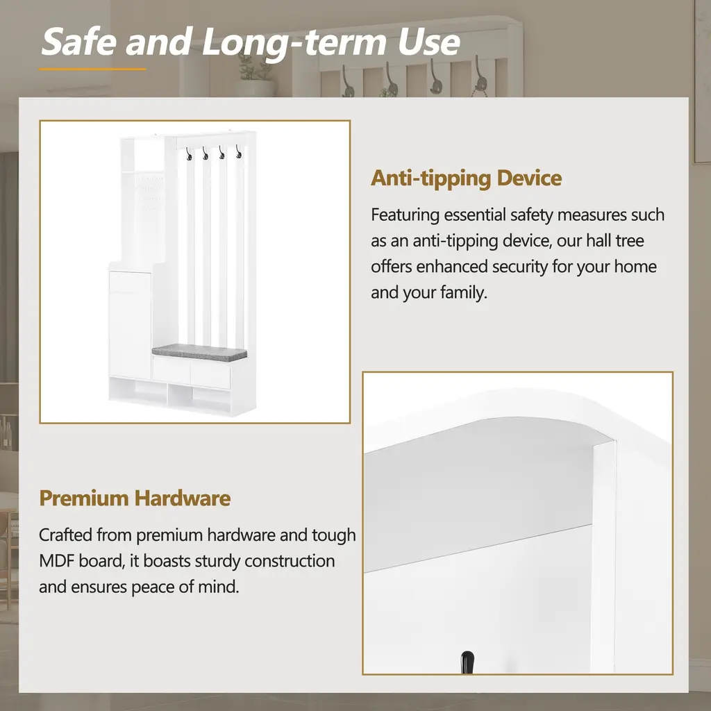 Contemporary Hall Tree Storage With Cushioned Storage Bench,multifunctional Hallway Shoe Cabinet With Pegboard - White