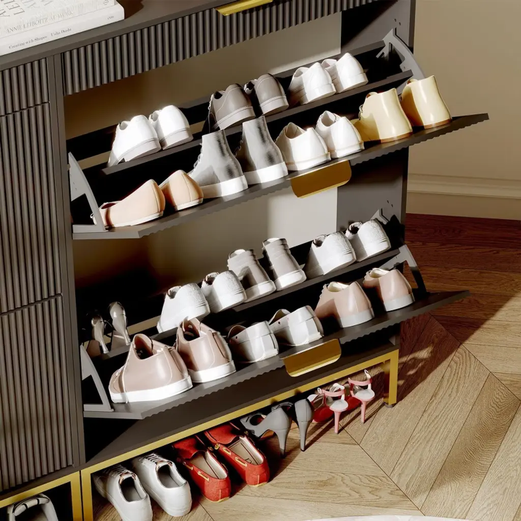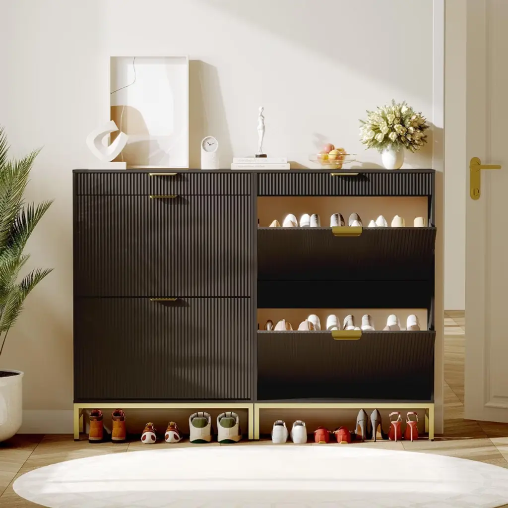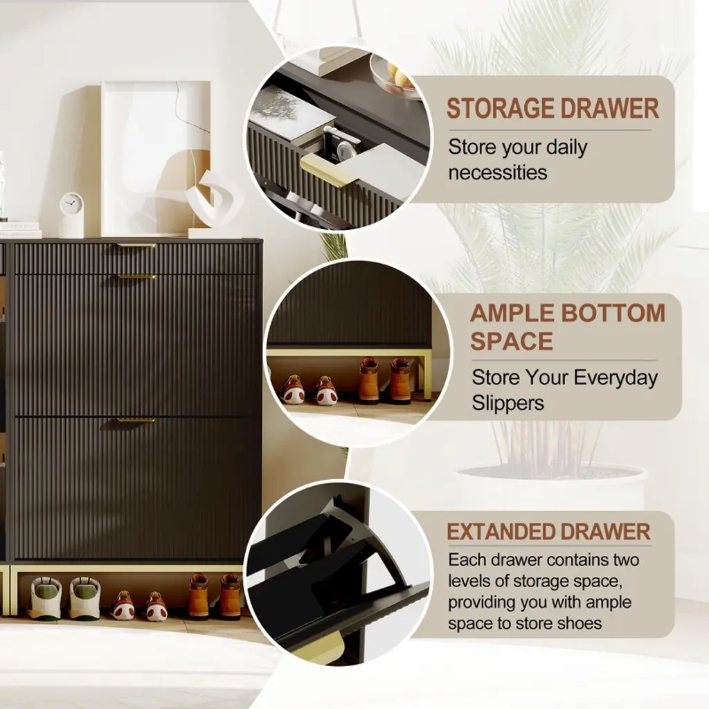 Fluted Shoe Storage Cabinet with 2 Flip Drawers, Slim Wood Shoe Organizer, Narrow Entryway Furniture with Storage for Small Spaces, Hallway Entrance Apartments