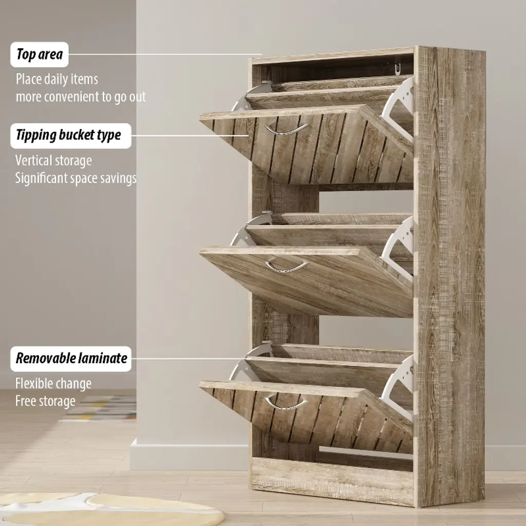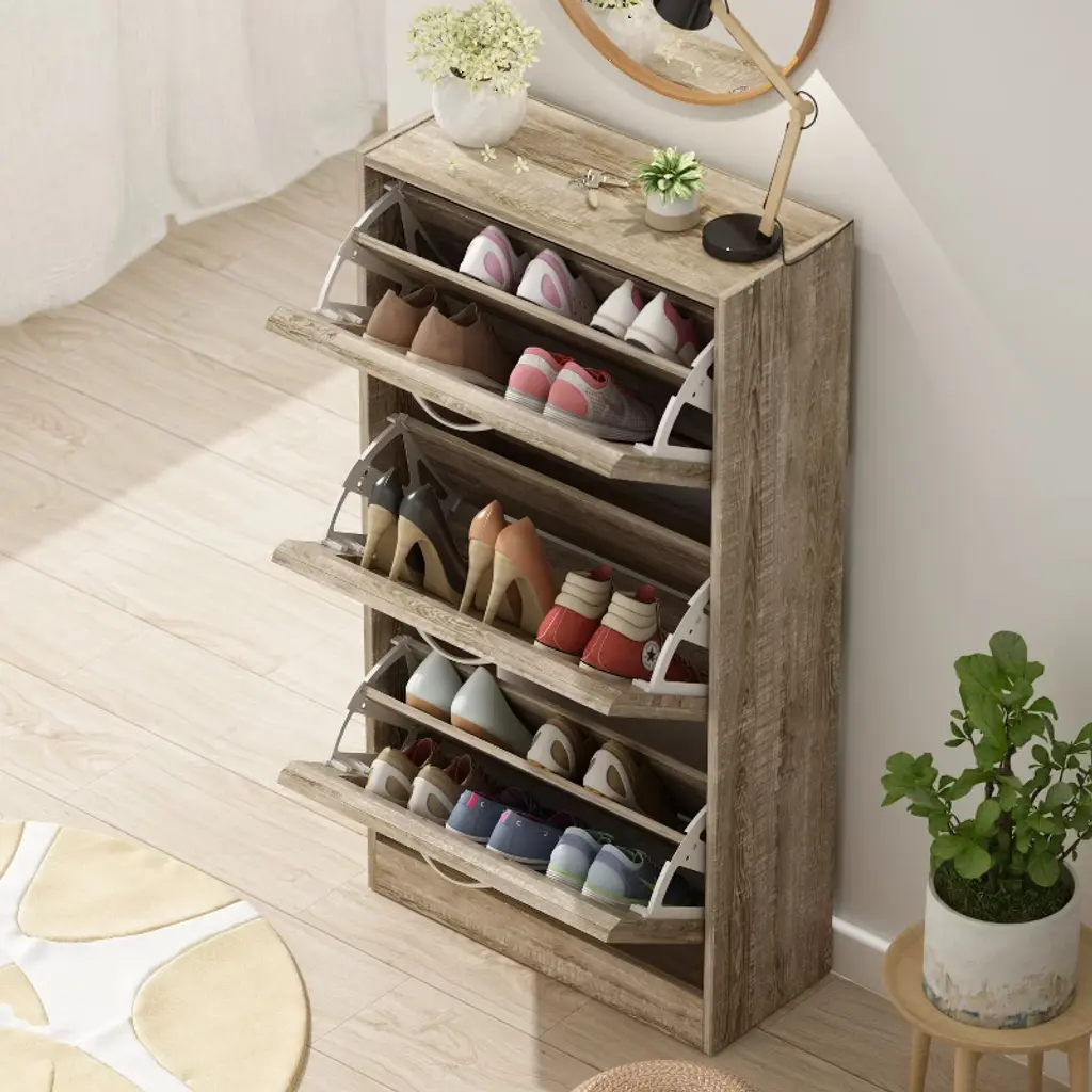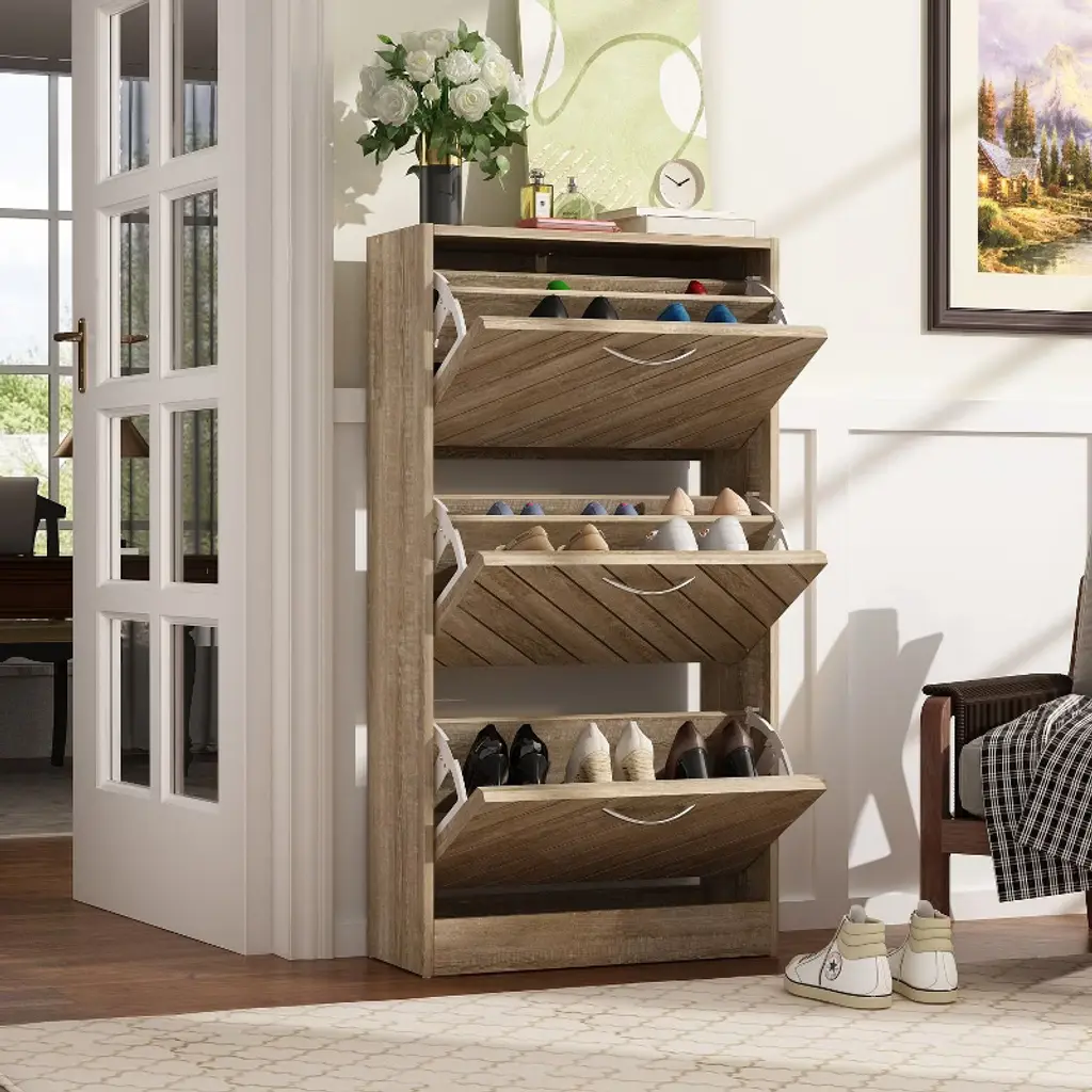 Famapy Brown Woodgrain 3 Drawer Flip Up Shoe Cabinet Openwork