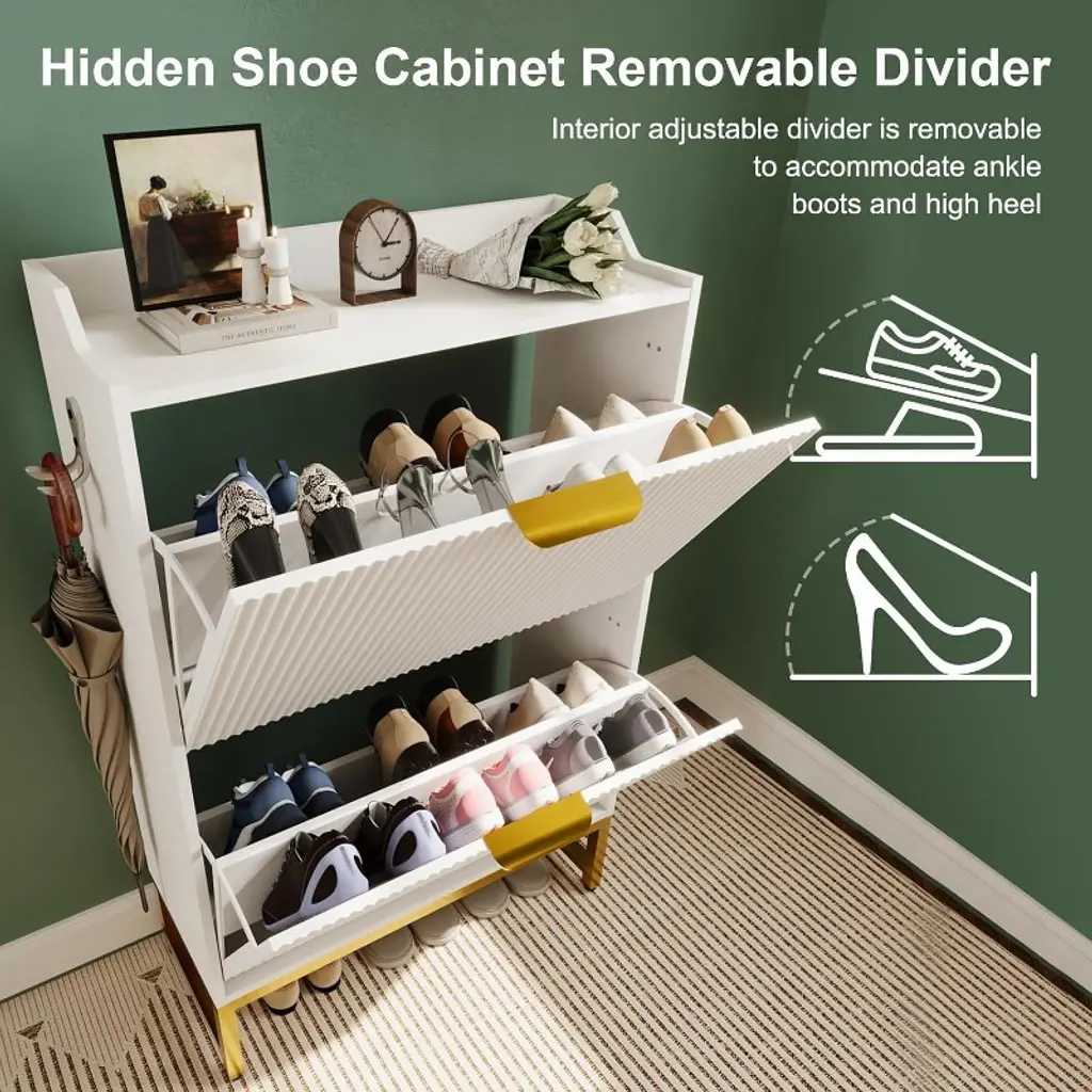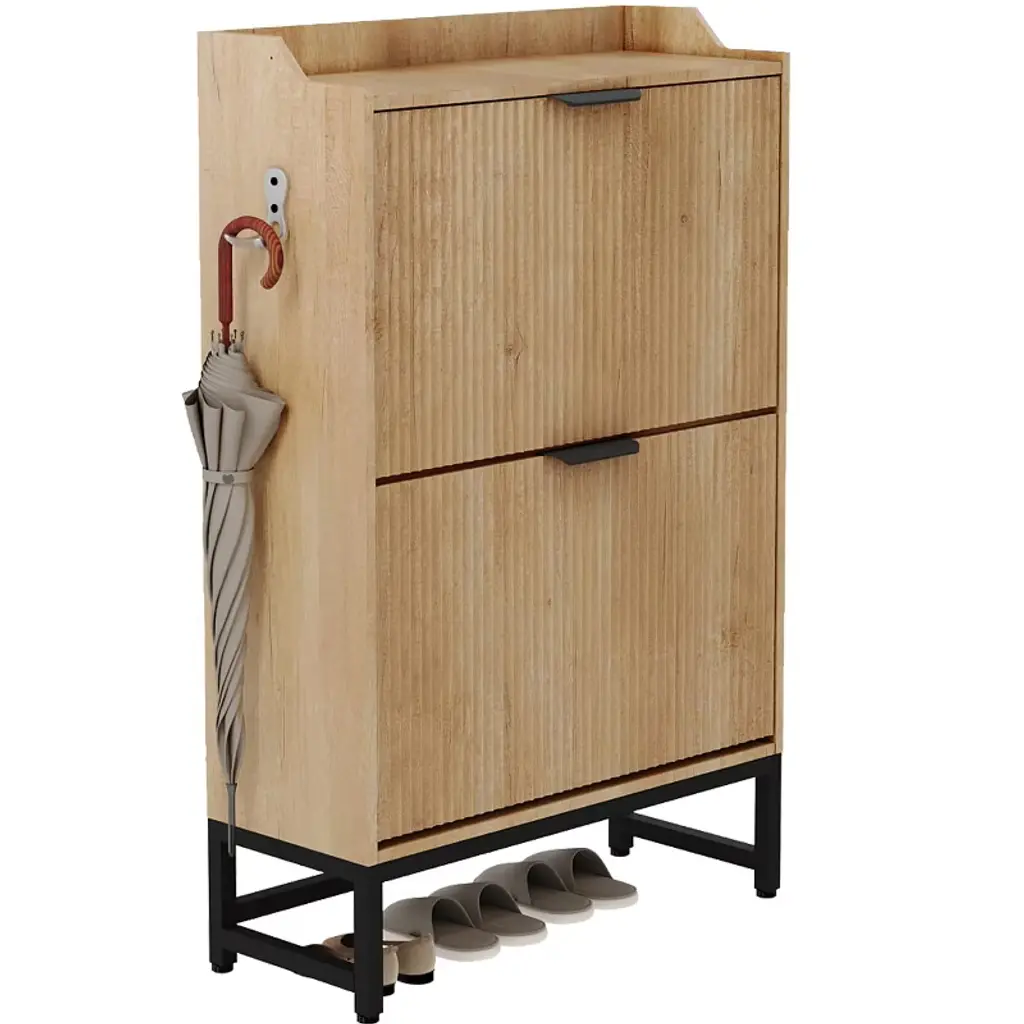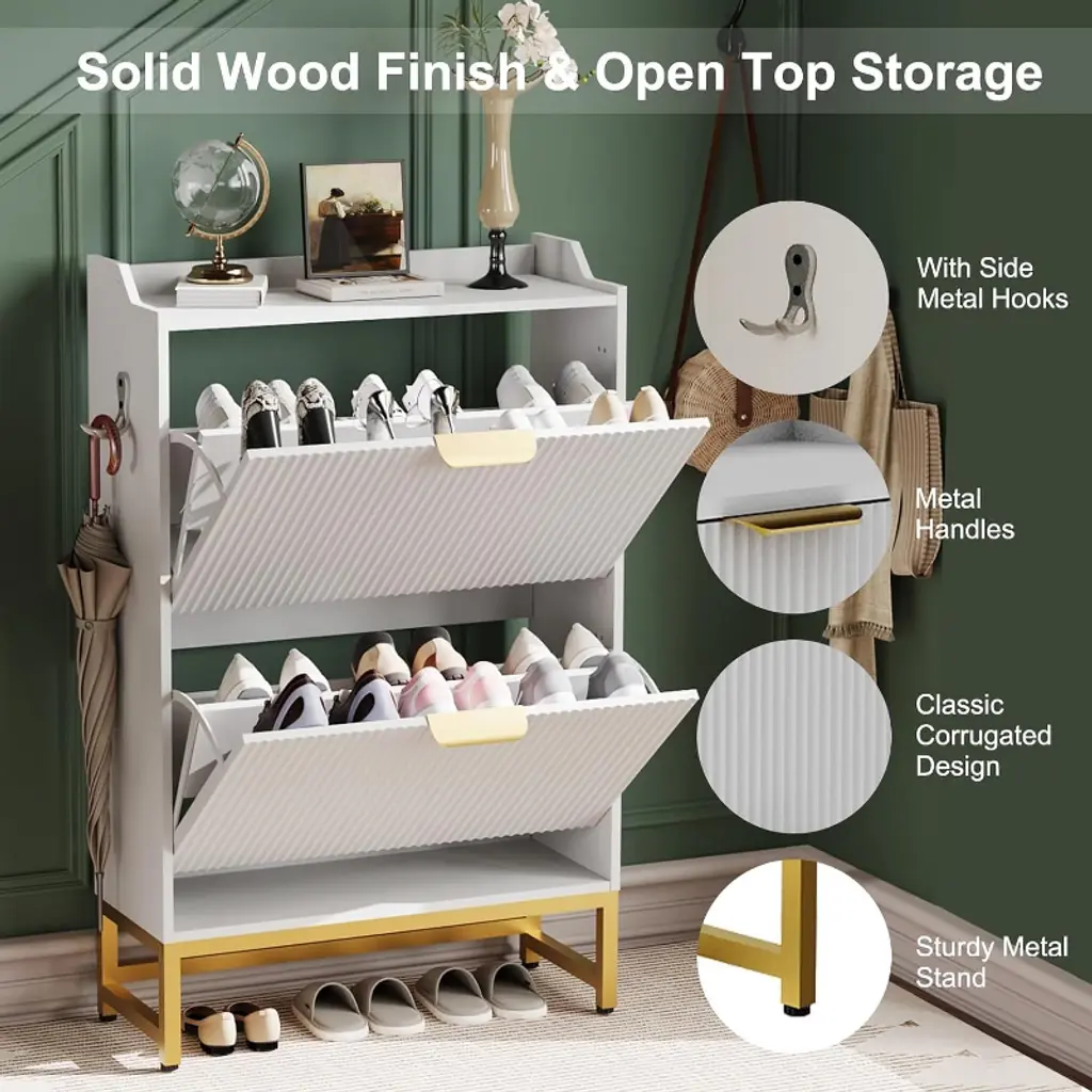 Fluted Shoe Cabinet With 2 Flip Drawers - Slim Modern Shoes Rack With Sturdy Metal Legs, Freestanding Hidden Storage Organizer