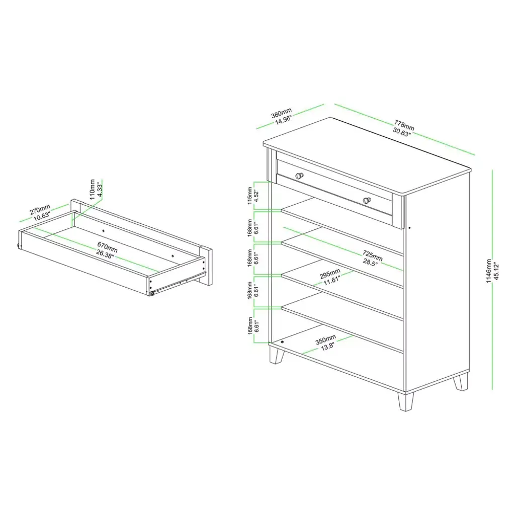 Featuring a classic design and ample storage space, the Glidden shoe cabinet offers a stylish method to keep your entryway organized. Made in Malaysia, this cabinet is constructed from sturdy wood accented with inset paneling. Two doors conceal five shelves with space to store approximately 15 pairs of shoes, depending on size. Requiring assembly, the Glidden features a large drawer for convenient storage of all your outdoor essentials. The doors showcase a recessed grid pattern for added visual texture, making the Glidden shoe cabinet a sleek addition to any space. Overall Dimensions: 45.10" High x 30.60" Wide x 15.00" Deep; Drawer Dimensions: 26.40" Wide x 10.60" Deep x 4.30" High; Larger Shelf Dimensions: 28.00" Wide x 11.60" Deep x 6.60" High; Smaller Shelf Dimensions: 28.50" Wide x 11.60" Deep x 4.50" High; Legs: 3.50" High;
