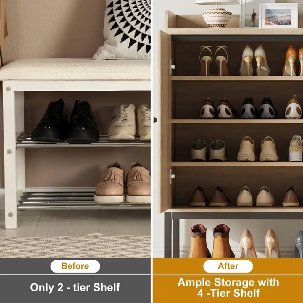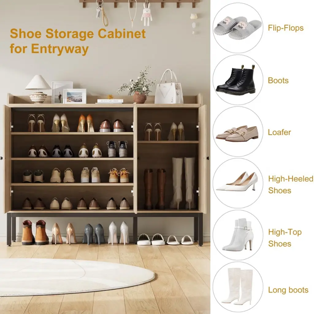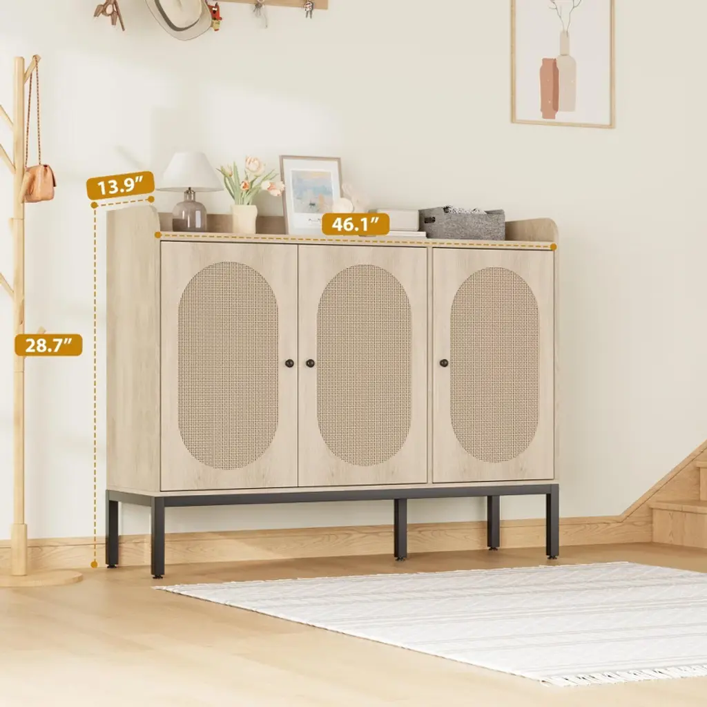 Keep your shoes organized with this Rattan 3-Door Shoe Cabinet, designed for narrow entryways, hallways, dorms, or small apartments. With a capacity for 24-28 pairs of shoes, the adjustable right-side shelf allows storage of boots, heels, and other footwear of varying heights. The hand-woven rattan doors provide protection from dust, pets, and insects while adding a stylish, natural element to your home d¨¦cor. Constructed with durable MDF engineered wood and a waterproof top, this cabinet offers long-lasting stability. The included anti-tip wall bracket ensures safety, while easy-to-follow instructions and labeled parts make assembly simple and quick. Perfect for keeping your space tidy while enhancing the overall aesthetic of your home.