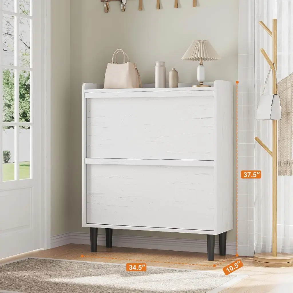 Description: Enhance your entryway with this chic modern shoe cabinet featuring three flip drawers and adjustable shelves. Made from high-quality engineered wood, it accommodates 18-24 pairs of shoes, including sneakers, ankle boots, and men’s sizes up to 13. The space-saving flip drawer design offers easy access while protecting shoes from dust. Equipped with an anti-tip device for safety, sturdy waterproof surfaces, and thick load-bearing shelves, this cabinet combines style, durability, and functionality. Ideal for hallways living rooms or apartments, it is easy to assemble with labeled parts and clear instructions. Dimensions: 34.5 inches W x 10.5 inches D x 37.5 inches H Material: Engineered wood (MDF) Shape: Rectangular Number of Drawers: 2 Item Weight: 52 Pounds Mounting Type: Floor mount Special Features: Adjustable shelves, heavy duty, anti-tip safety What You Get: 1 Shoe cabinet with 3 flip drawers and adjustable shelving Anti-tip safety device for wall mounting Assembly hardware and step-by-step instruction manual After-Sales Service: We provide comprehensive assembly guidance and responsive customer support to ensure a smooth, hassle-free setup. Our team is ready to assist with any questions or concerns for your satisfaction.