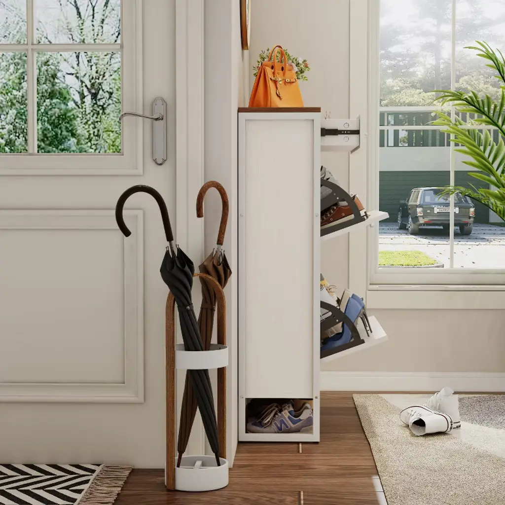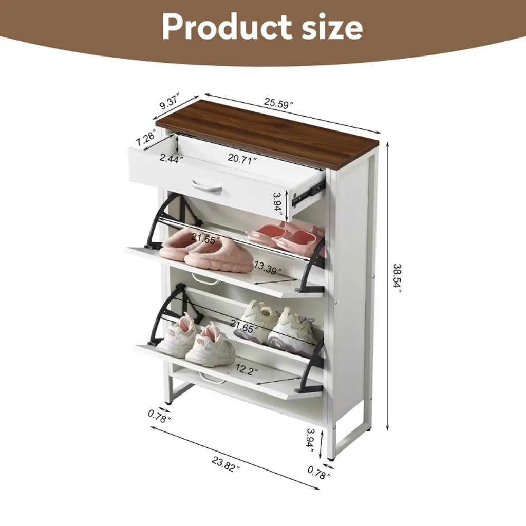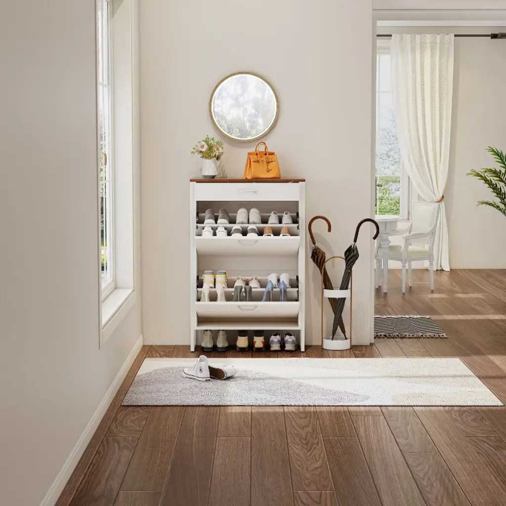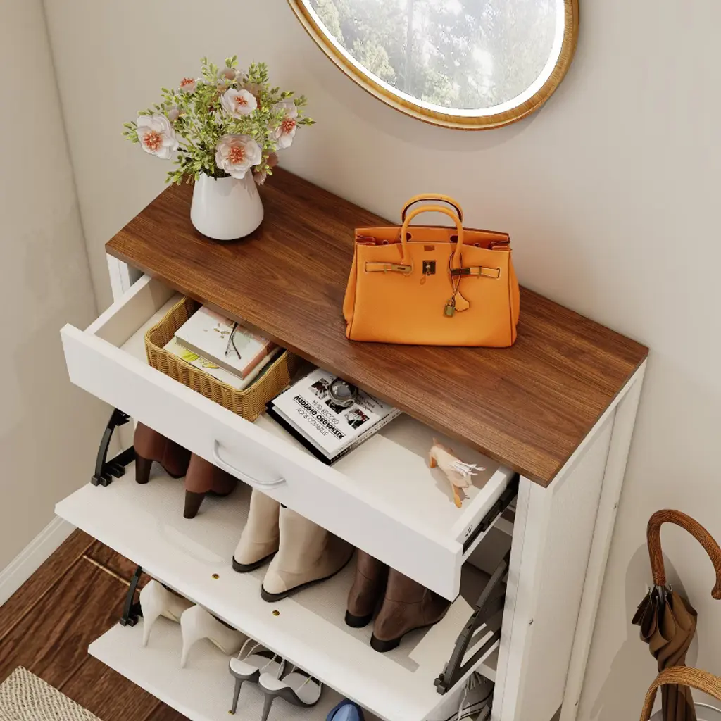 This slim freestanding shoe cabinet brings a clean and modern design to your entryway. Perfect for primary living spaces, it adds a touch of elegance and simplicity to any home decor.Designed to hold approximately 12-16 pairs of shoes, this 2-in-1 shoe storage cabinet with 2 flip drawers offers ample space for organizing footwear. It keeps your entryway tidy and clutter-free, making it an ideal solution for small homes and apartments.