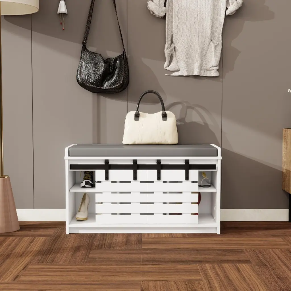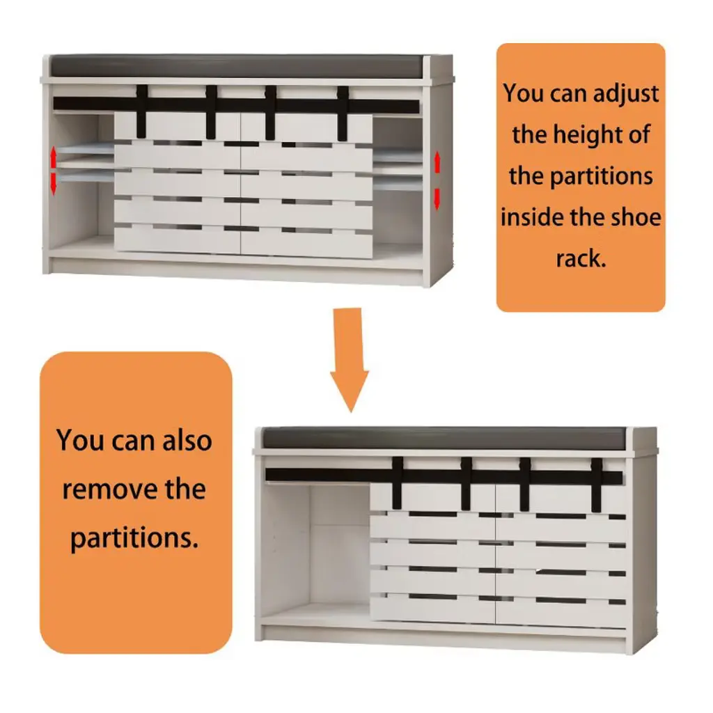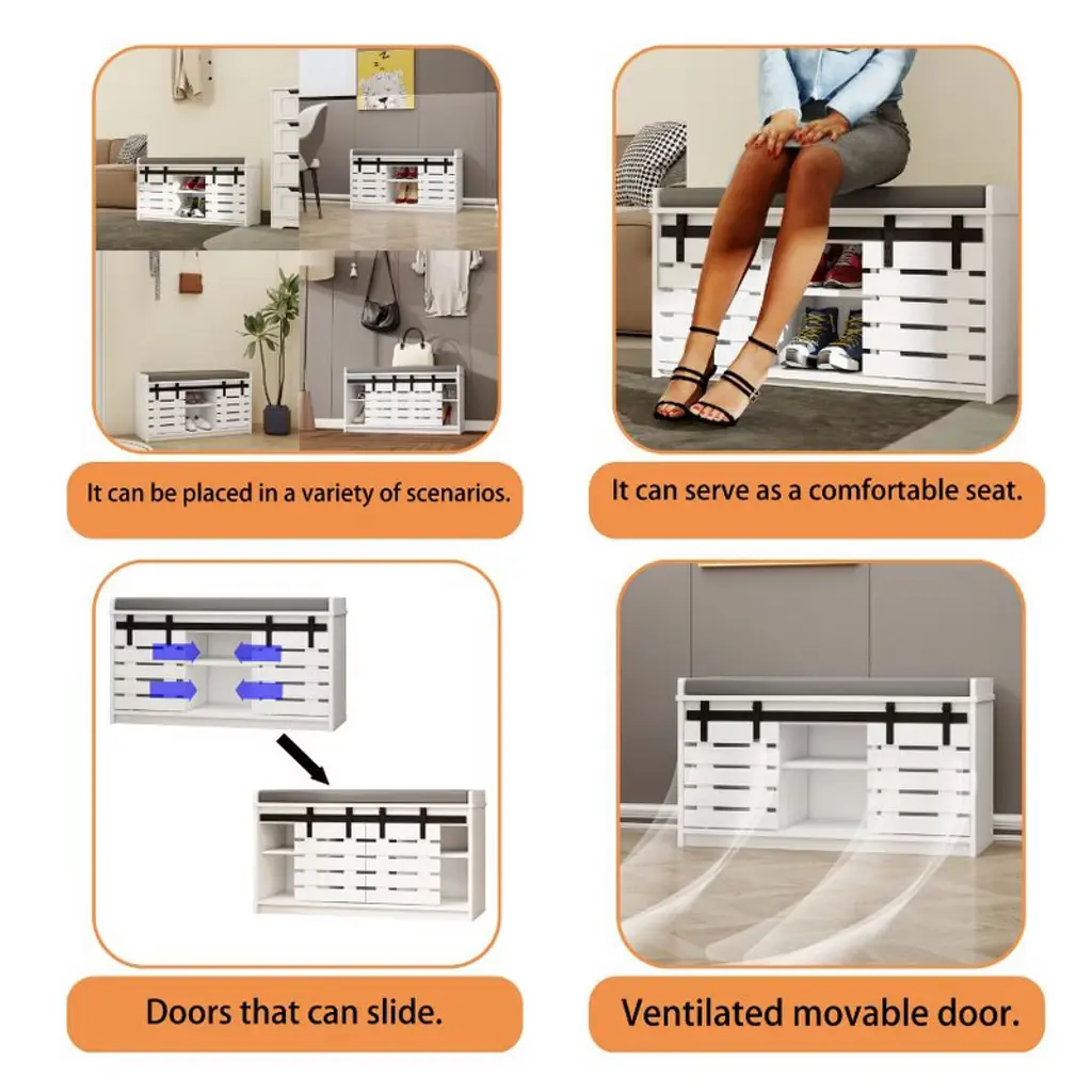 This shoe bench, with its farmhouse-style design and white finish, blends seamlessly into any environment. Featuring two sliding doors and two adjustable shelves on either side, this entryway shoe bench lets you customize the height for optimal organization and provides ample space for all your footwear needs. Whether used in an entryway, front door, hallway, foyer, closet, patio, pantry, living room, or bedroom, its versatile design makes it suitable for any space in your home.