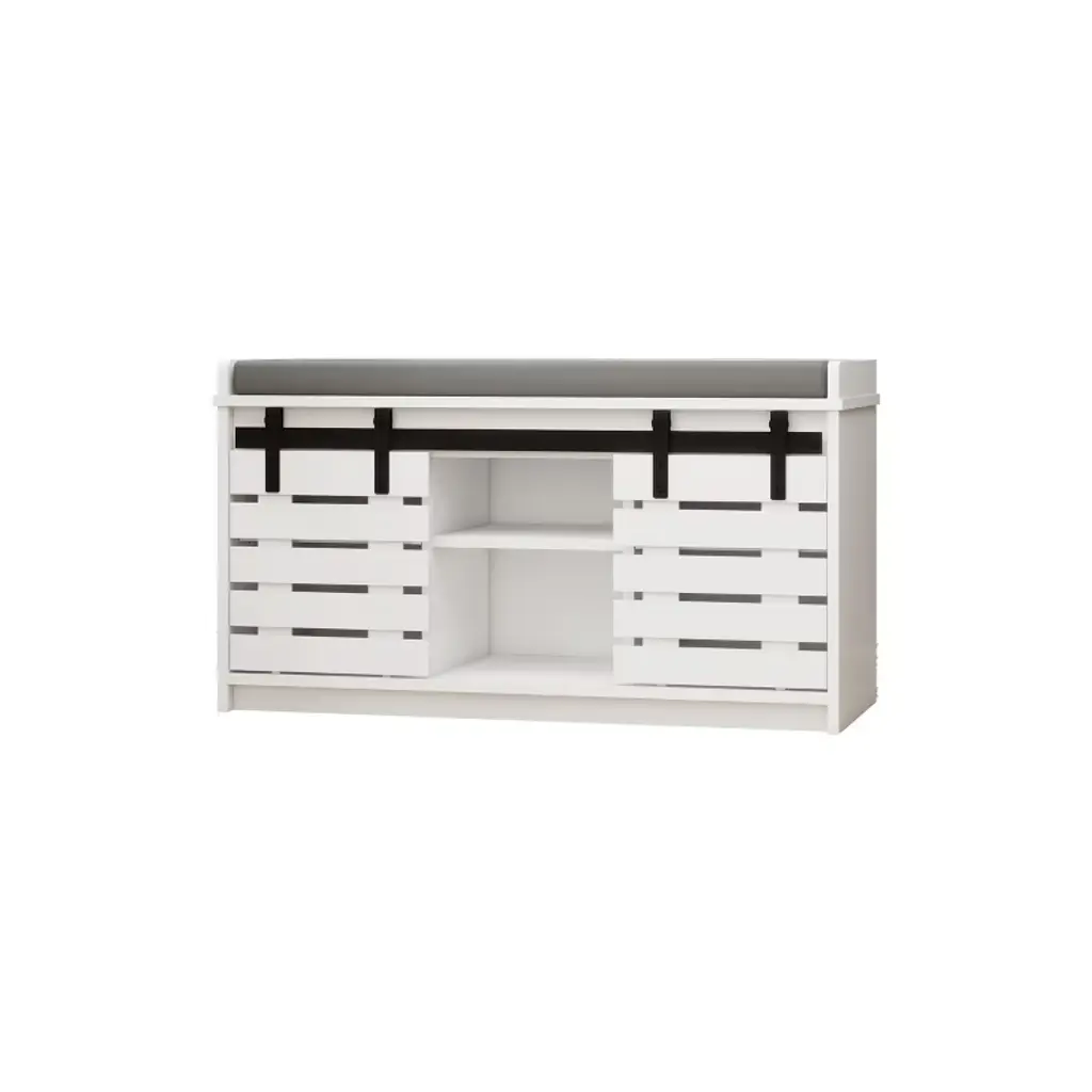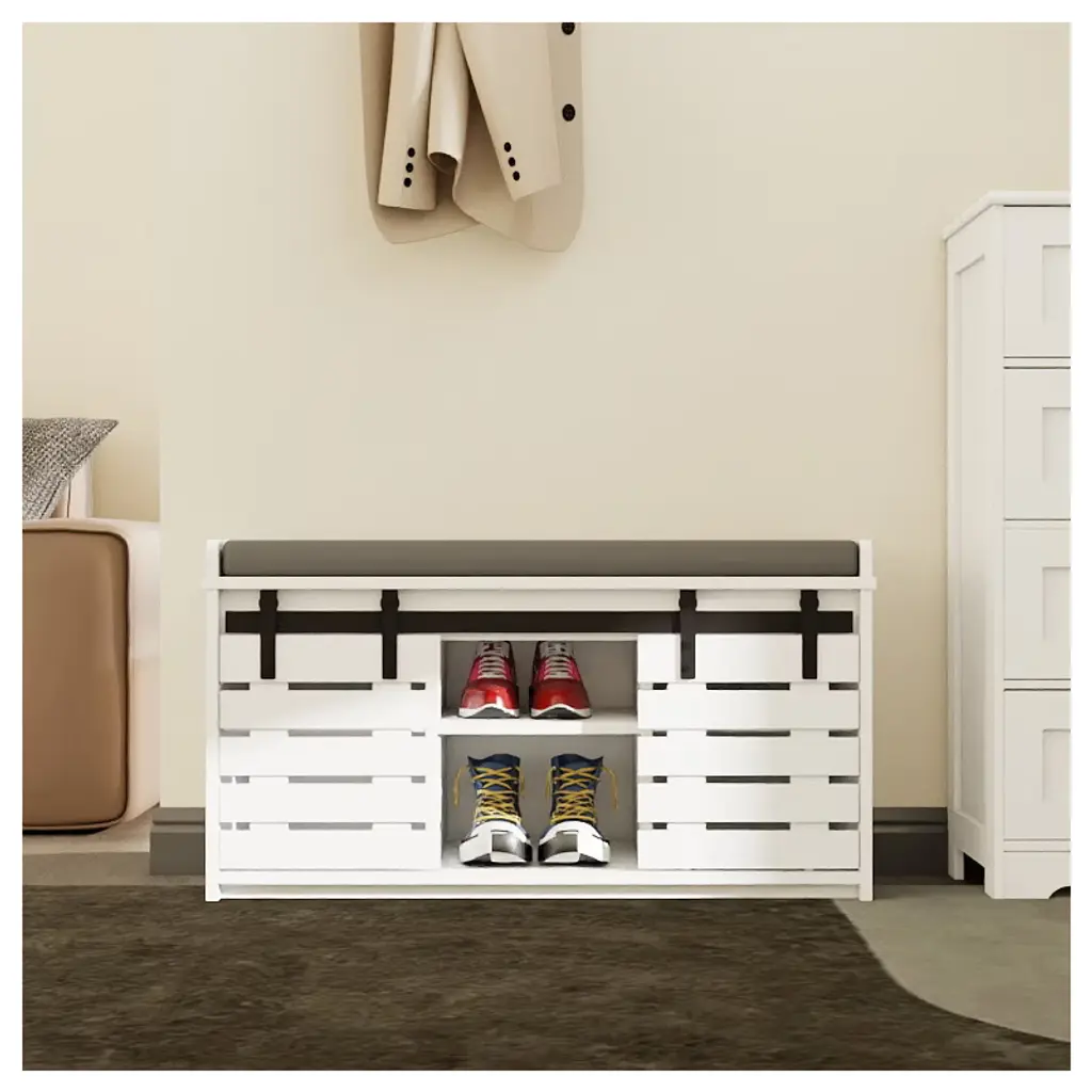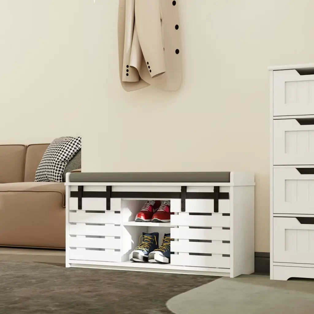 This shoe bench, with its farmhouse-style design and white finish, blends seamlessly into any environment. Featuring two sliding doors and two adjustable shelves on either side, this entryway shoe bench lets you customize the height for optimal organization and provides ample space for all your footwear needs. Whether used in an entryway, front door, hallway, foyer, closet, patio, pantry, living room, or bedroom, its versatile design makes it suitable for any space in your home.
