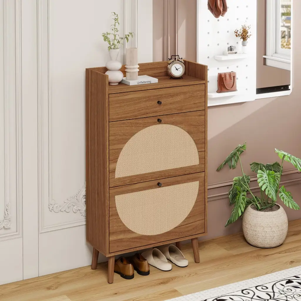 Kwpzqeb Rattan Shoe Cabinet With 2 Flip Drawers, Hidden Wood Shoe Cabinet With Drawer, Freestanding Shoe Storage Cabinet For Entryway, Walnut