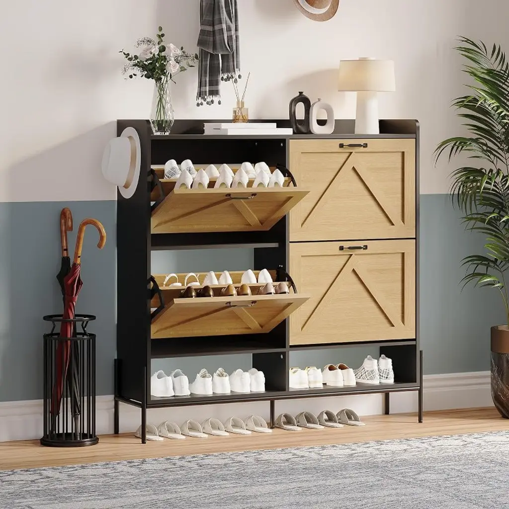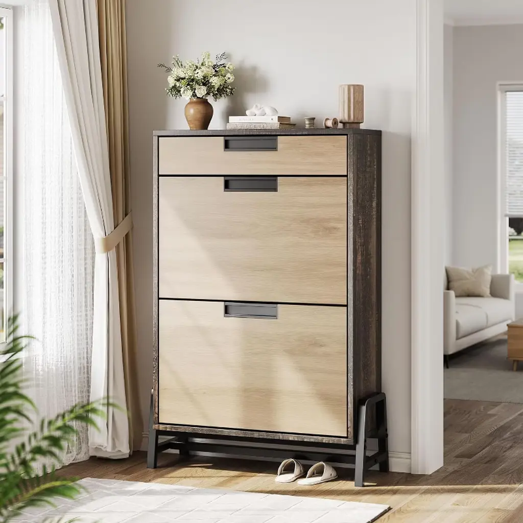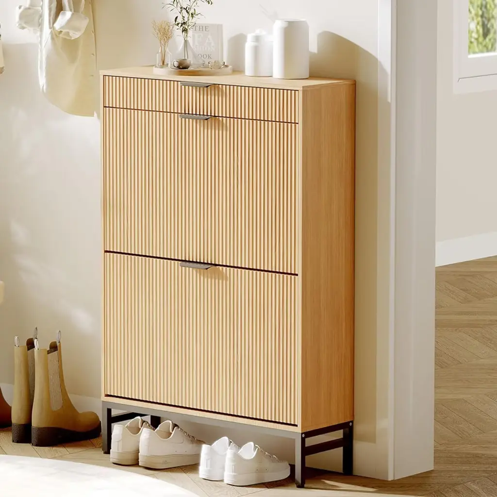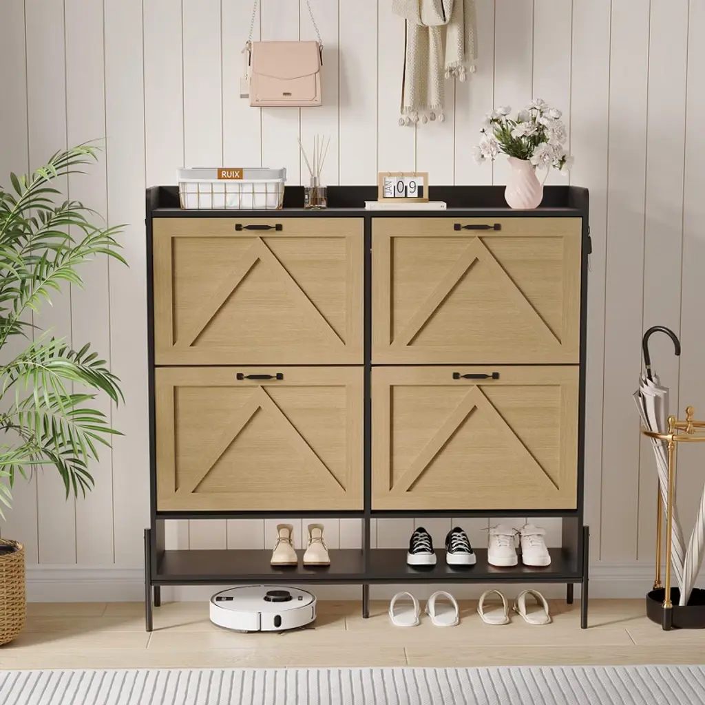 Keep your entryway neat and stylish with the Nasitip 4-drawer flip shoe cabinet. This 47.2-inch wide storage solution features a slim, space-saving profile and a natural oak finish that adds warmth and charm to any hallway, living room, or foyer. Designed with four hidden flip drawers and adjustable shelves, it stores 18–24 pairs of shoes while maintaining a clutter-free appearance. Crafted from durable engineered wood, this cabinet combines modern design with reliable function. Anti-tip hardware ensures added safety for families with children or pets. Whether you're organizing sneakers or heels, this cabinet is a sleek upgrade for everyday living.