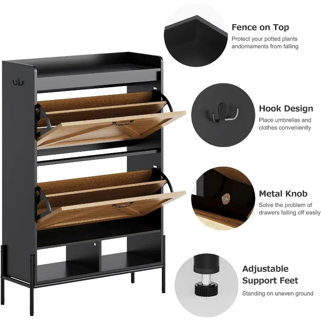 Maximize your entryway organization with the Nasitip 2-Drawer Flip Shoe Cabinet—a tall, narrow cabinet designed to neatly store and conceal your footwear. Crafted from durable engineered wood with black metal legs and natural rattan accents, this freestanding cabinet features two flip drawers, each offering two tiers of adjustable storage for everything from heels to sneakers. The spacious bottom area accommodates slippers or robot vacuums, while the top ledge is ideal for plants, keys, or décor. Built for convenience, the cabinet includes wall-secure anti-tip hardware, adjustable feet for stability, and detachable side hooks for umbrellas and bags. Blending style with practicality, it’s a smart, space-saving solution for hallways, entryways, and more.