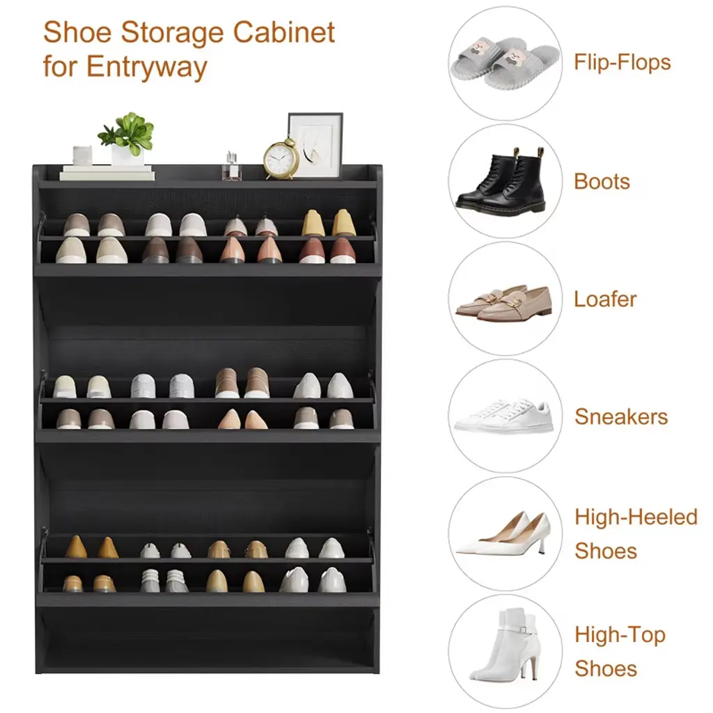 1.Space-Saving Design for Compact Areas With a slim, modern profile, this narrow shoe cabinet is tailor-made for small spaces¡ªperfect for entryways, hallways, closets, or apartments where floor space is limited. Its three flip drawers maximize vertical storage, efficiently organizing up to 24 pairs of shoes (from sneakers to sandals) without cluttering your front door or mudroom. By tucking away footwear in a streamlined unit, it keeps your entryway tidy and welcoming, even in cozy living spaces. 2.Adjustable Shelves for Versatile StorageThe cabinet¡¯s customizable shelves adapt to all types of footwear, ensuring a perfect fit for every pair. Whether you need to store bulky boots, delicate high heels, flat shoes, or even men¡¯s size 12 sneakers, the adjustable design lets you modify shelf heights to accommodate them all. Beyond shoes, the spacious top surface doubles as a handy spot for daily essentials: drop your keys, wallets, or small bags, or display decor like potted plants or baskets¡ªadding functionality without sacrificing style. 3.Sturdy, Safe Construction Built to LastCrafted from high-quality engineered wood, this freestanding shoe rack boasts a scratch-resistant and water-resistant finish, standing up to daily use, scuffs, and accidental spills. Its robust frame ensures stability, while included anti-tip hardware adds an extra layer of safety¡ªcritical for homes with children or pets, preventing tipping even when drawers are fully extended. Designed for longevity, it remains a reliable storage solution for years to come. 4.Hidden Flip Drawers: Tidy & StylishThe tilt-out flip drawers keep shoes concealed and dust-free, maintaining a clean, uncluttered look in your entryway. Smooth, easy-to-grip handles allow quick access to your footwear, while the minimalist black finish and sleek lines blend seamlessly with diverse decor styles¡ªfrom farmhouse and modern to traditional. Whether placed in a foyer or closet, it elevates the space with understated elegance while hiding the mess. 5.Easy Assembly & Reliable SupportSetting up this shoe cabinet is hassle-free, thanks to clearly labeled parts and step-by-step instructions¡ªno advanced DIY skills needed. The unit arrives in secure packaging to prevent damage during shipping, ensuring it reaches you in perfect condition. If you have questions or need replacements, our responsive U.S.-based customer service team is ready to assist, ensuring your satisfaction with every purchase.