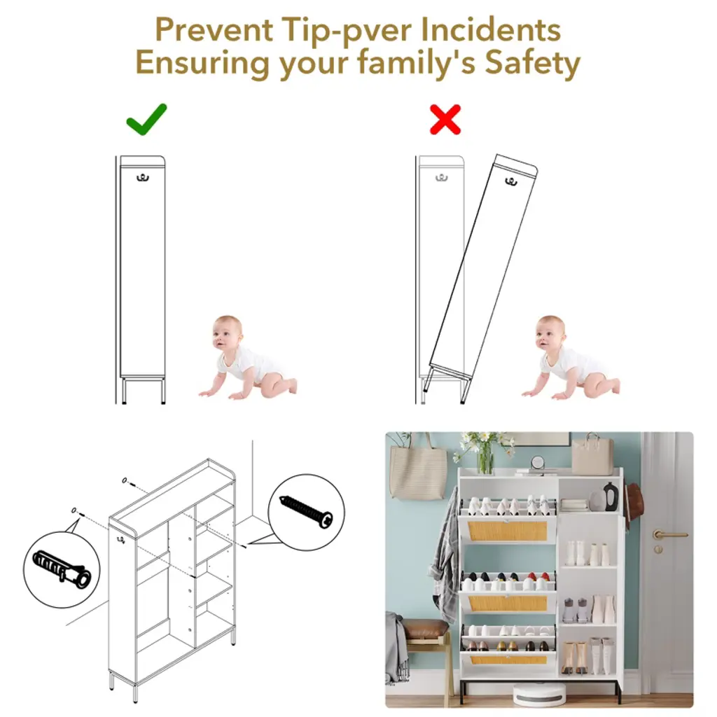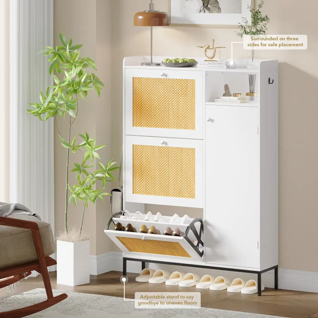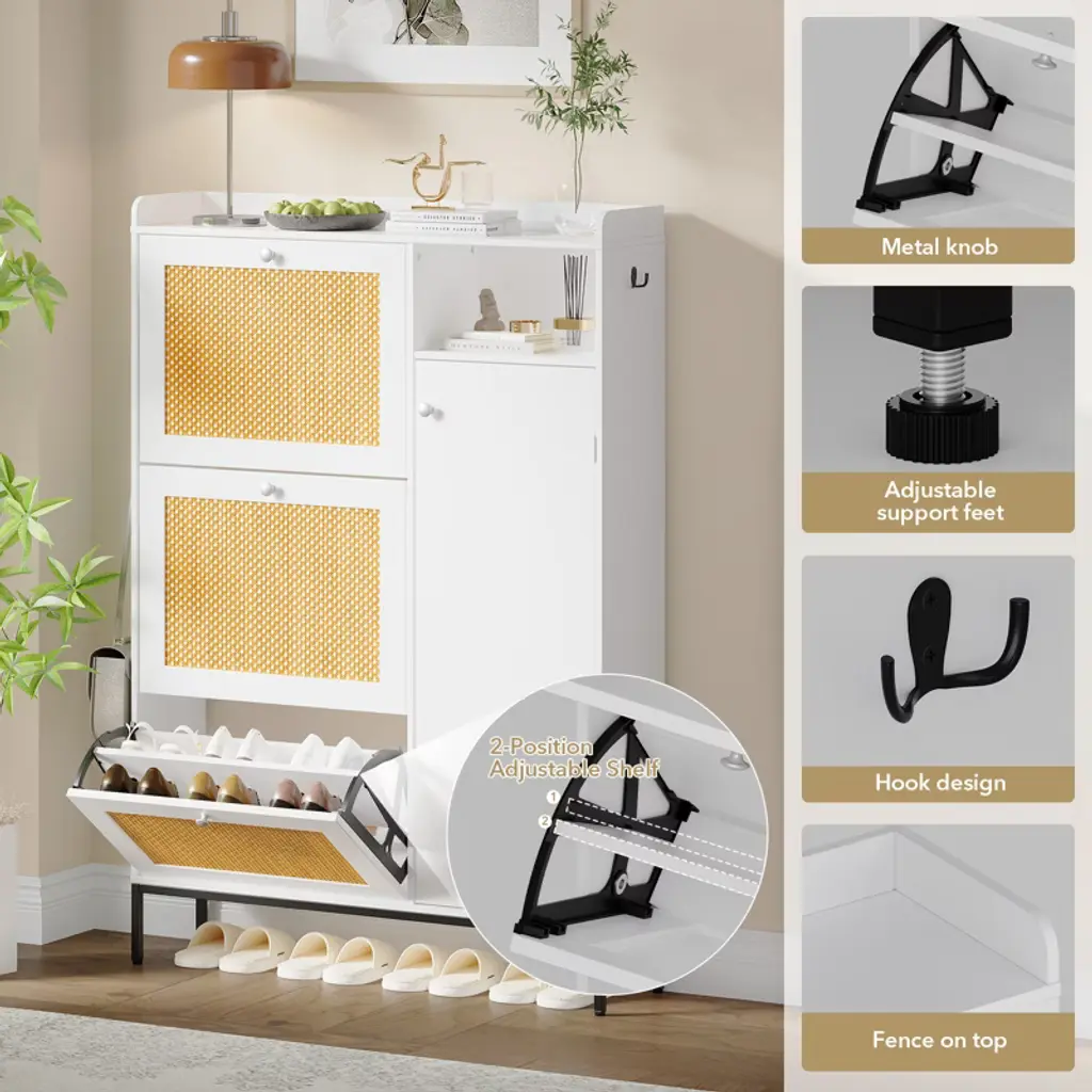 [ Large Capacity Shoe Cabinet ] - The shoe storage cabinet can hold a maximum of 32 to 40 pairs of shoes. On the left side, there are three flip drawers, each with two storage compartments. The panel can be adjusted or removed in two positions within two grooves to accommodate different heights and sizes of flats, ankle boots, or high heels. On the right side, there are two adjustable shelves for storing women's knee-high boots or other items. [ Flip Drawers Shoe Cabinet ] - This modern standalone shoe cabinet features a sleek and stylish design that seamlessly blends with various home styles. The spacious interior easily accommodates different types of shoes. Additionally, the compact structure helps save space, making it an ideal choice for entryways or bedrooms, keeping your shoes neatly organized. The bottom flip drawers are specifically designed for children's shoes to help increase organizational skills. [ More Thoughtful Designs ] - The bottom space can hold slippers or a sweeping robot and the 360° adjustable metal legs make the cabinet stable even on uneven floors. The top fence keeps items like plants, ornaments, socks, and keys safe from falling. The hooks on both sides can be used to store umbrellas or shoe horns. The unique silent cotton design ensures no noise when opening and closing the cabinet doors. Despite its narrow size, this shoe cabinet has complete and powerful functions. [ Sturdy and Durable ] - The rattan shoe cabinet perfectly combines practicality and aesthetics. With its attractive rattan design, high-quality MDF and sturdy metal legs, this cabinet not only offers excellent load-bearing capacity but also withstands daily wear and tear. Additionally, the top of the cabinet serves as a display area, making it an ideal choice for showcasing decorative items or everyday essentials, enhancing its functionality. [ Easy to Install ] - Our packaging box comes with installation instructions and tools. Simply follow the instructions to quickly complete the installation. The specific installation time will depend on your situation. If you encounter any problems during installation or use, please contact us promptly, and we will provide a satisfactory solution.