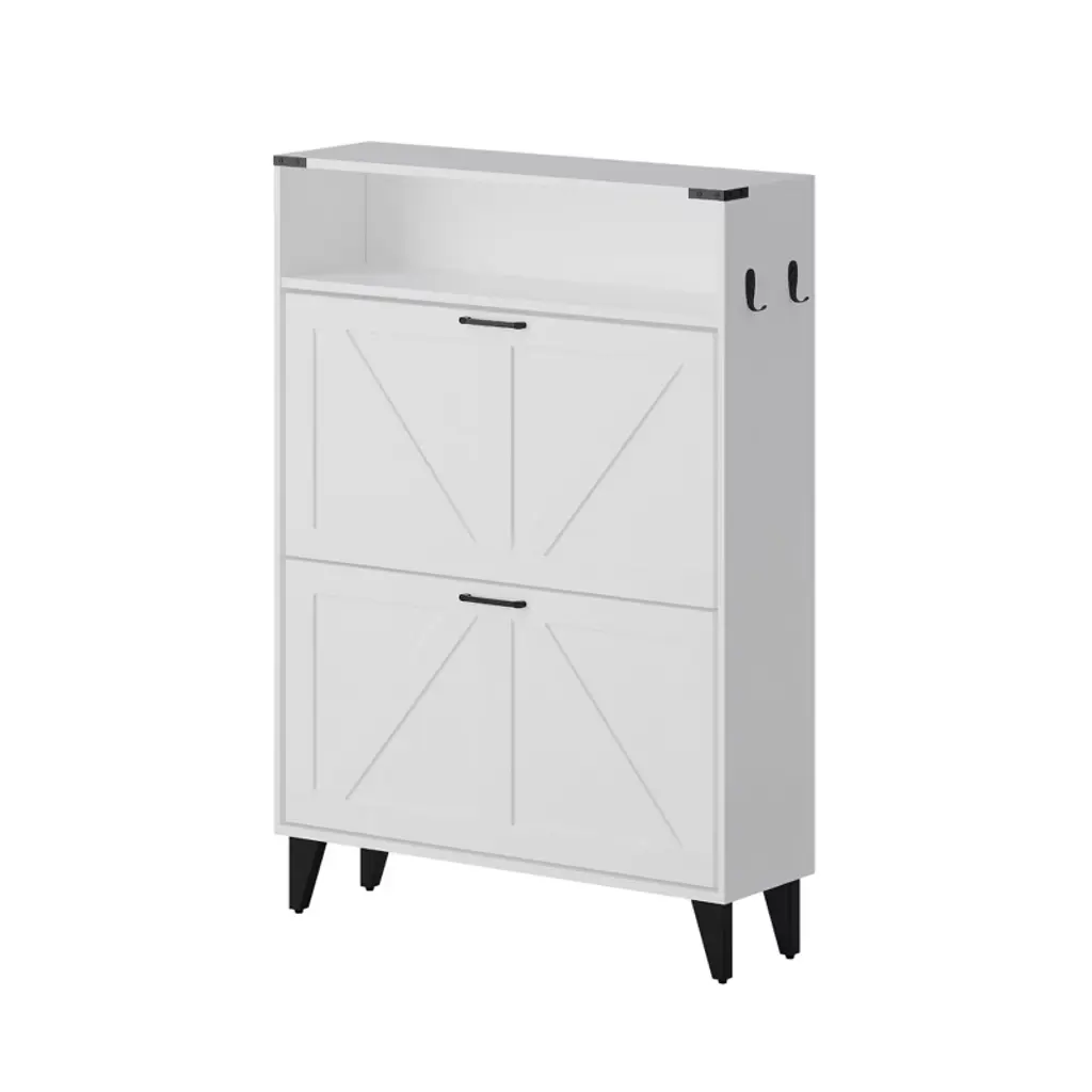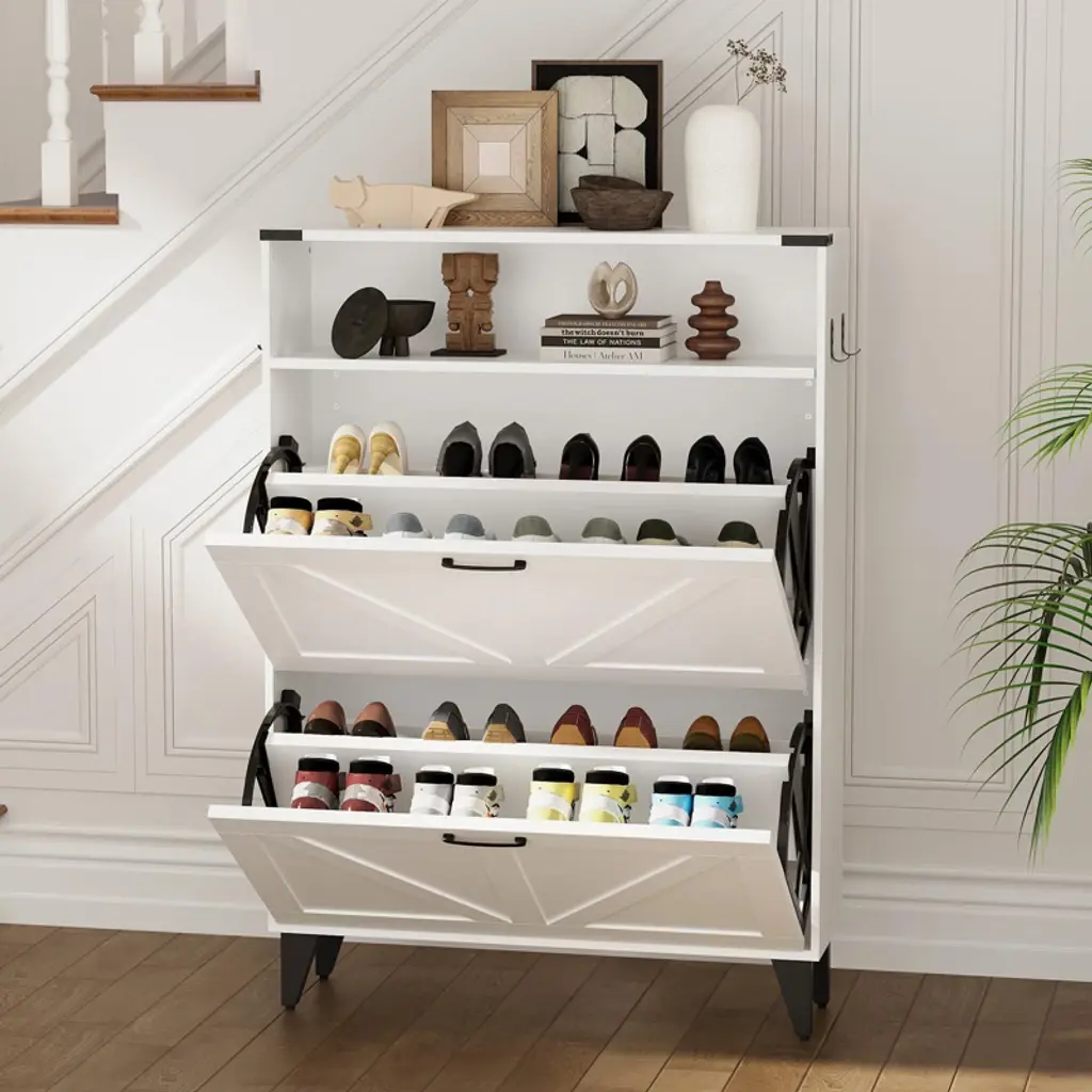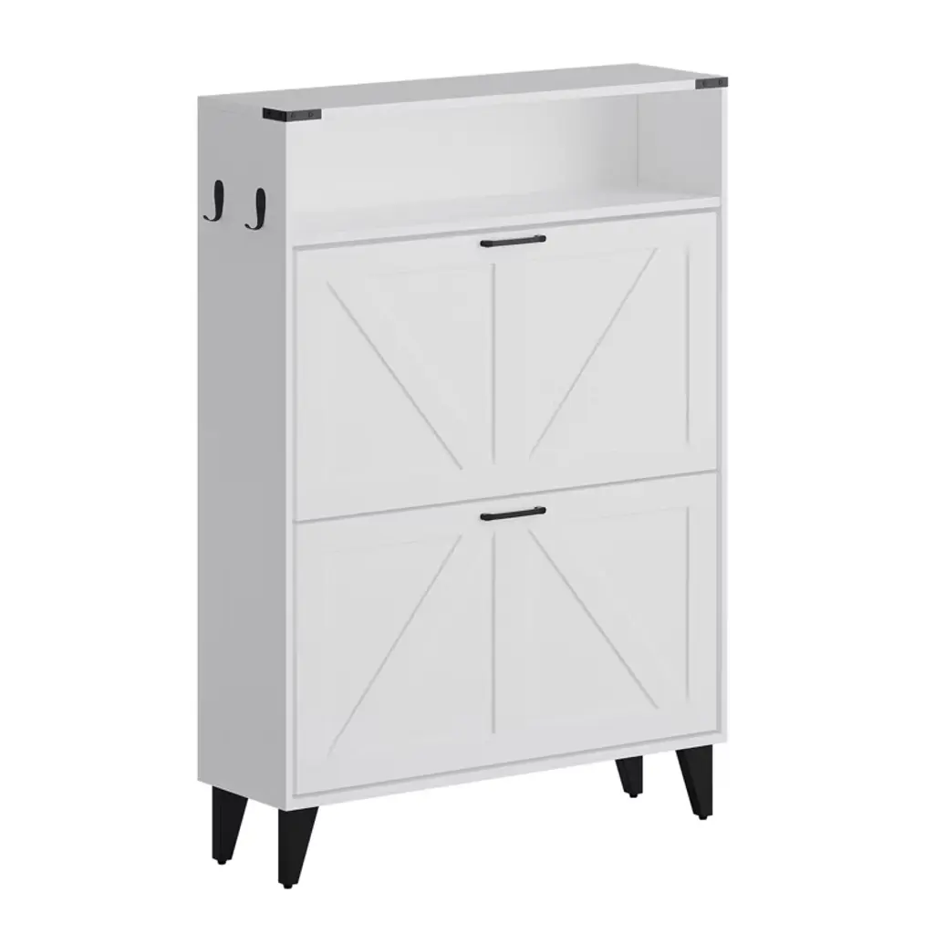Efficient Shoe Storage with Smart OrganizationThis shoe cabinet is designed to tackle clutter with two flip-top drawers and dedicated compartments, offering ample space to neatly store and organize multiple pairs of shoes. Whether it¡¯s sneakers, sandals, or boots, the structured layout makes it easy to find the right pair quickly, keeping your entryway or hallway tidy and free from scattered footwear.Versatile Placement for Any SpaceWith its compact and stylish design, this shoe storage cabinet fits seamlessly into various areas of your home. It¡¯s ideal for entryways to greet you with organized shoes as you come in, hallways to keep footwear out of sight, living rooms for a subtle storage solution, or even porches to store outdoor shoes. Its versatility ensures it complements any decor while adding functionality.Additional Hanging Hooks for Extra ConvenienceBeyond shoe storage, the cabinet features four built-in hooks, perfect for hanging umbrellas, keys, dog leashes, or small accessories. This added feature maximizes utility, keeping everyday essentials within easy reach as you head out the door, and reducing the need for extra storage pieces in your entry space.Safety-Focused Design for Peace of MindEquipped with an anti-dumping device, this shoe cabinet ensures stable placement, even in busy households with children or pets. The secure design prevents tipping, adding a layer of safety to your home while maintaining the cabinet¡¯s functionality and sleek appearance.Durable Particleboard ConstructionCrafted from sturdy particleboard, this cabinet combines durability with practicality, standing up to daily use and supporting the weight of multiple shoes. It seamlessly integrates the roles of a shoe cabinet, organizer, and storage rack into one compact unit, offering long-lasting reliability for your storage needs.