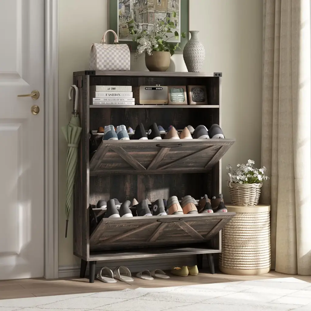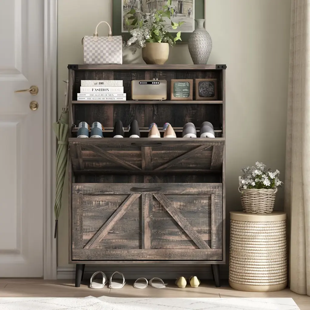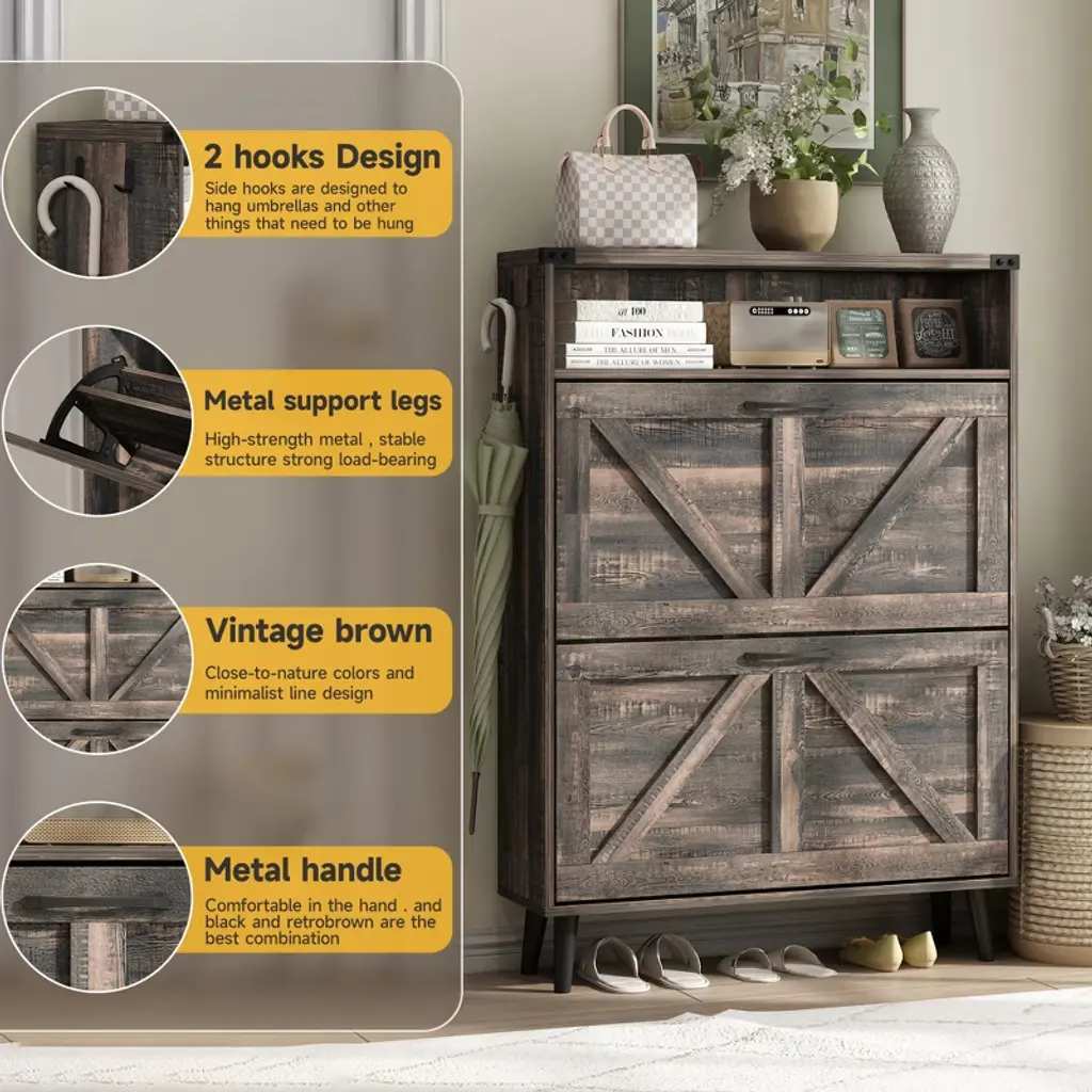 Shoe Cabinet With 2 Flip Drawers & Open Storage,dark Rustic Oak