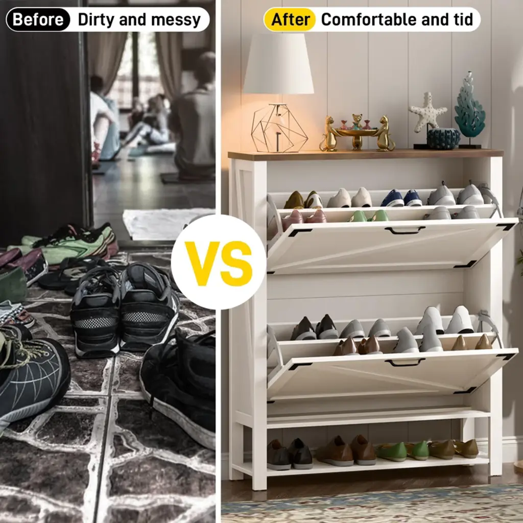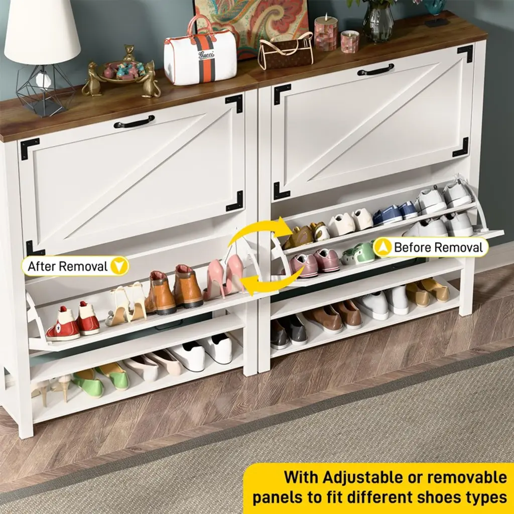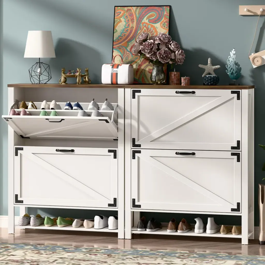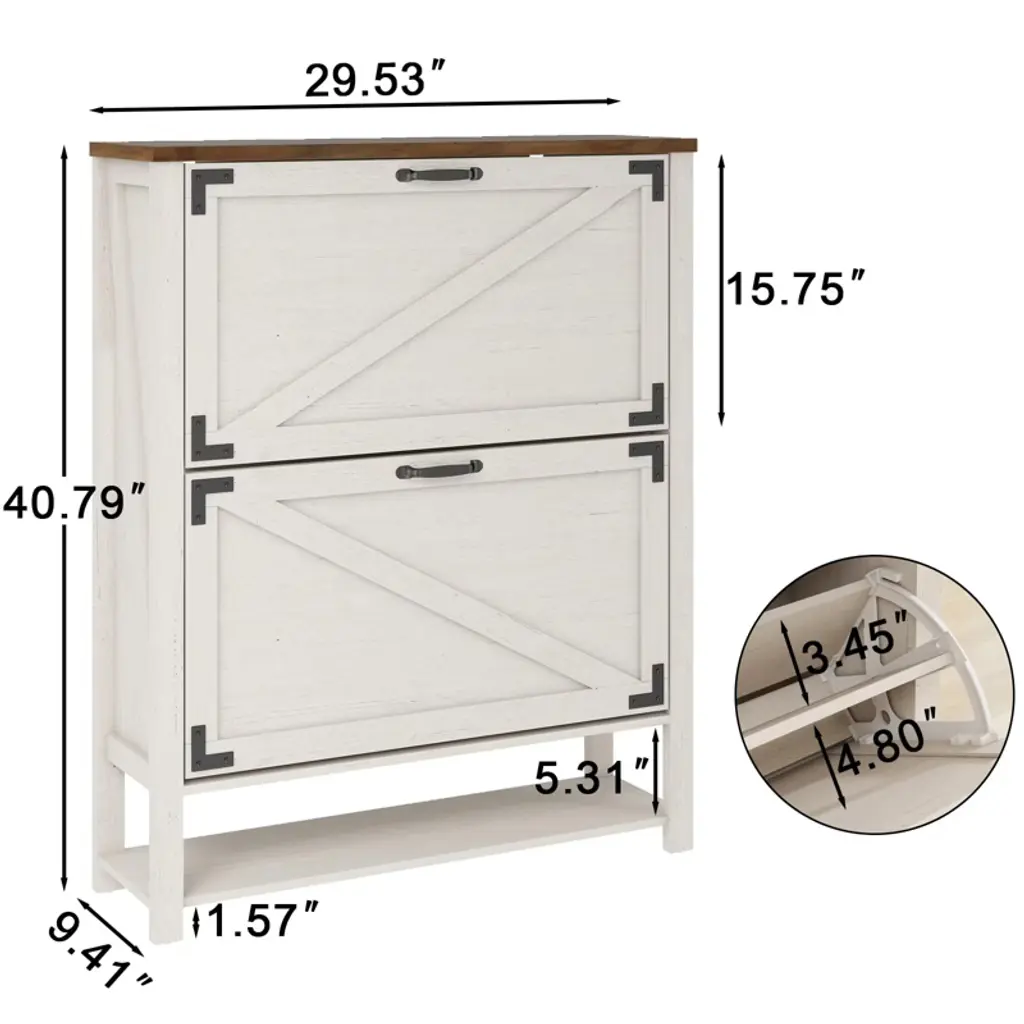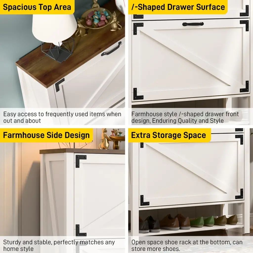This freestanding shoe cabinet with 2 flip drawers saves space, fitting tight areas while keeping shoes dust-free and bug-protected. It offers ample storage, plus a bottom open shelf for frequently worn shoes. With a stylish farmhouse design, it blends with any decor, suitable for entryways, hallways, etc. Sturdy with a solid wood base and anti-tipping accessories, it’s safe and easy to assemble with clear instructions. Contact support for help if needed.