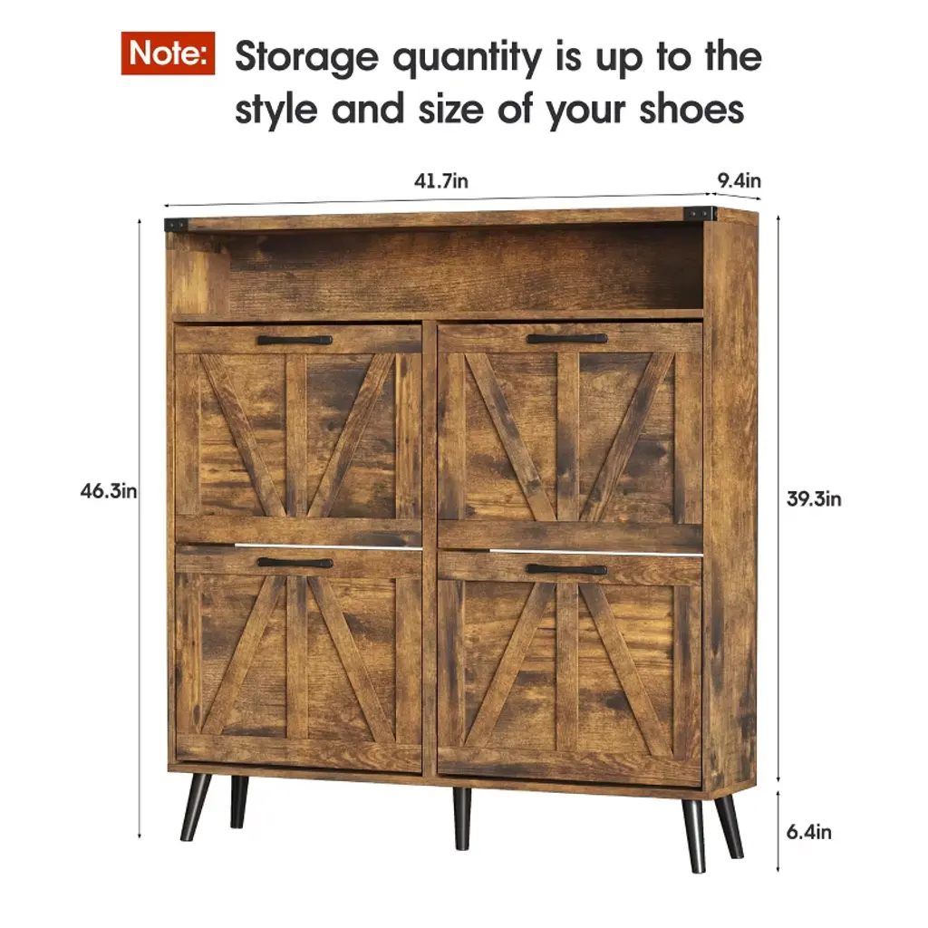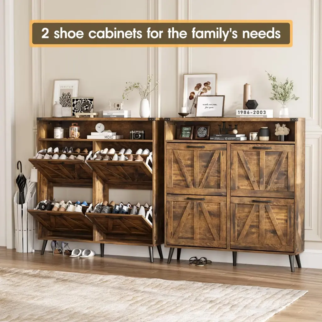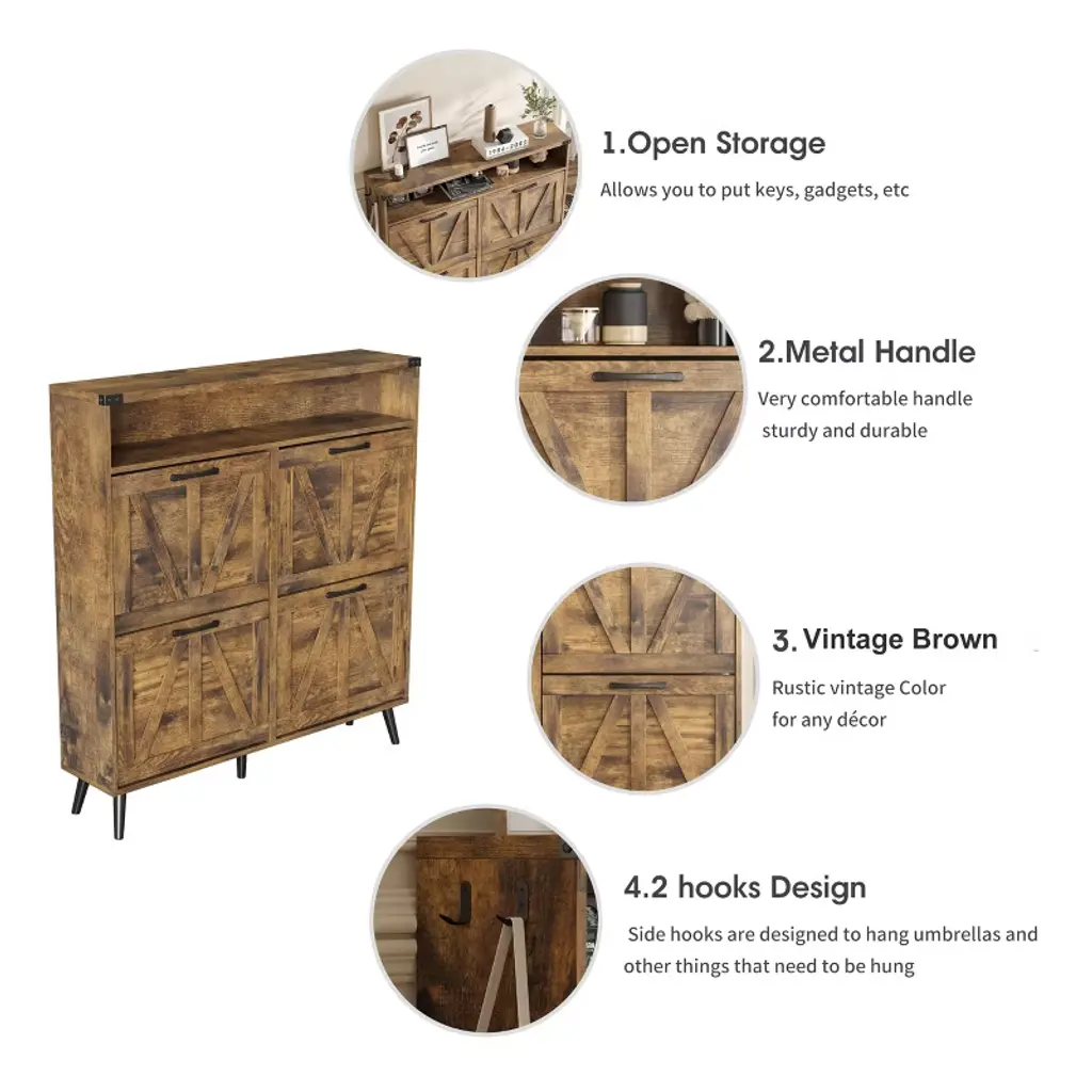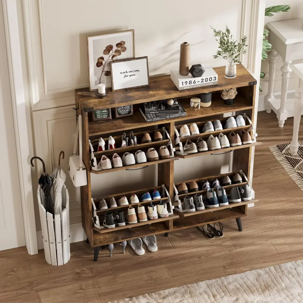 This slim entryway shoe cabinet offers large capacity with four flip drawers, each featuring two tiers and a removable divider for flexible storage, ideal for the whole family. The spacious top and open cubby keep accessories like keys and wallets within reach, while the hidden tipping bucket design maintains a tidy entryway. Made of high-quality MDF with black metal handles, it includes anti-tipping kits for stability. Easy to assemble with labeled parts and clear instructions, it’s a stylish and practical storage solution for any home.