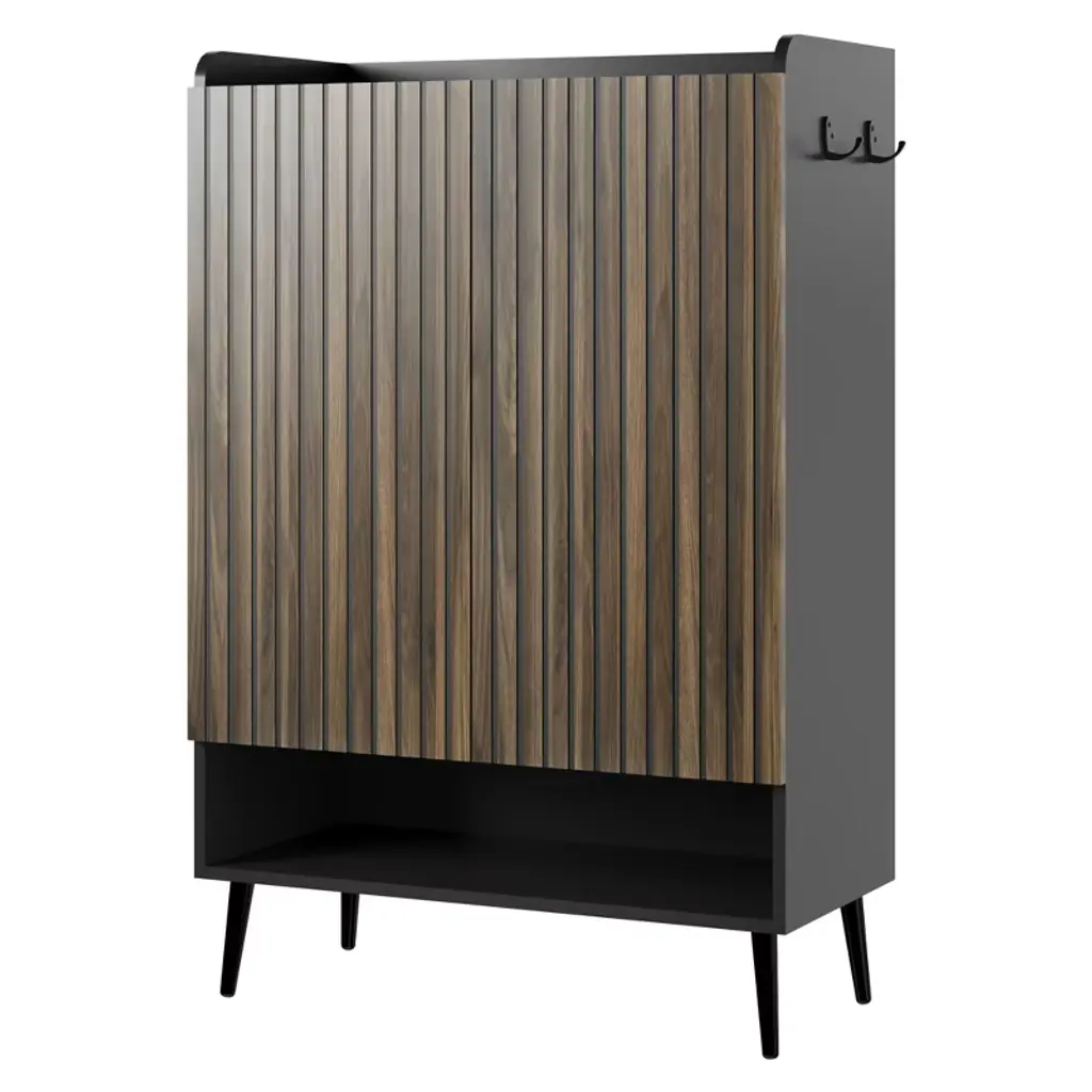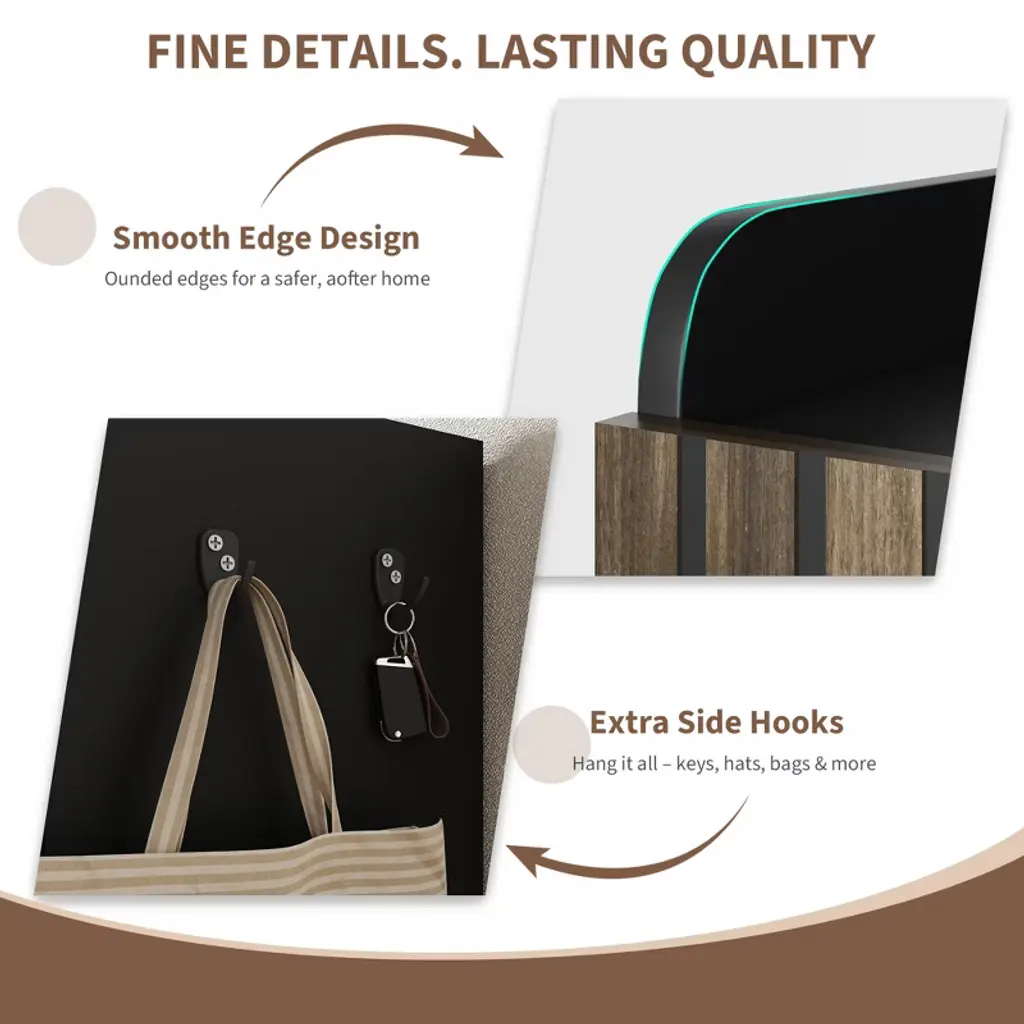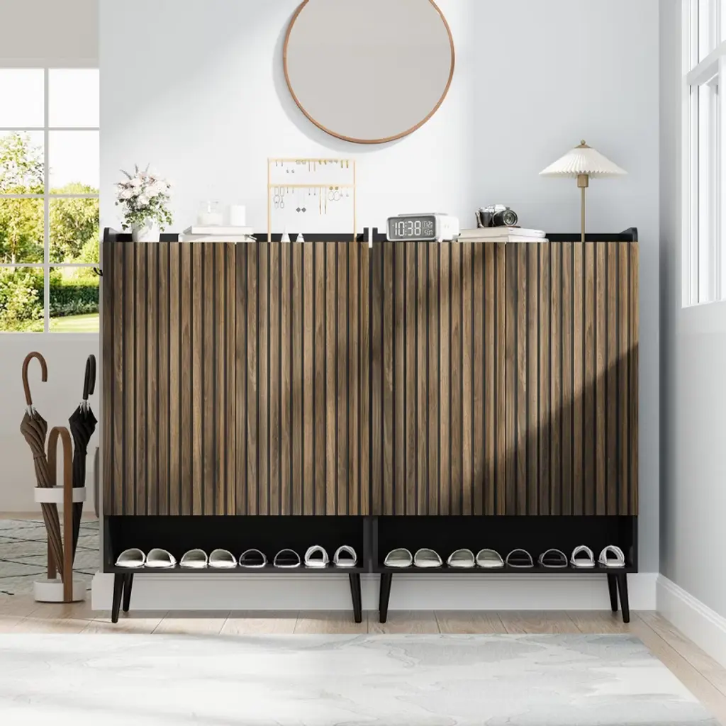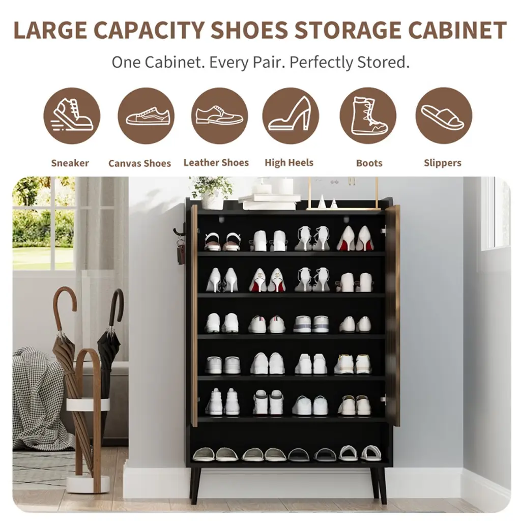 Modern Handleless Shoe Cabinet Design - Featuring a sleek handleless look, this shoe cabinet opens easily with raised door edges for a clean, modern aesthetic¡ªperfect for contemporary entryways and minimalist interiors 6-Tier Shoe Cabinet with Boot Storage: This spacious shoe cabinet holds 30+ pairs with 5 interior shelves, an open bottom tier, and a tall side compartment for boots. Perfect for entryways, closets, or hallways Built-In Hooks for Keys & Bags£ºTwo metal side hooks are included to conveniently hang keys, umbrellas, or bags, making this a multifunctional entryway shoe storage cabinet with hooks that helps keep your essentials organized and within reach Safe Curved Corners:Carefully rounded corners enhance safety in tight spaces¡ªperfect for children and older adults. This handleless entryway shoe storage cabinet blends safety and style Easy Assembly for Hassle?Free Setup:All parts labeled and instructions clear¡ªeasy assemble shoe cabinet gets you organized quickly without struggle
