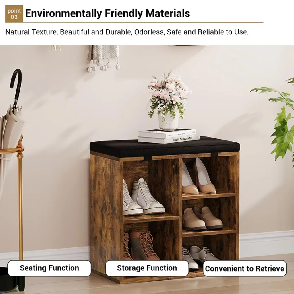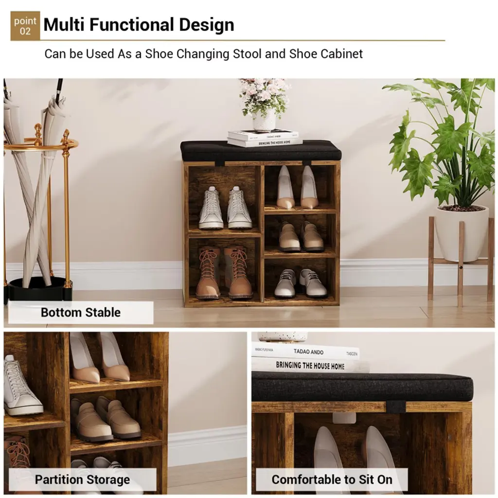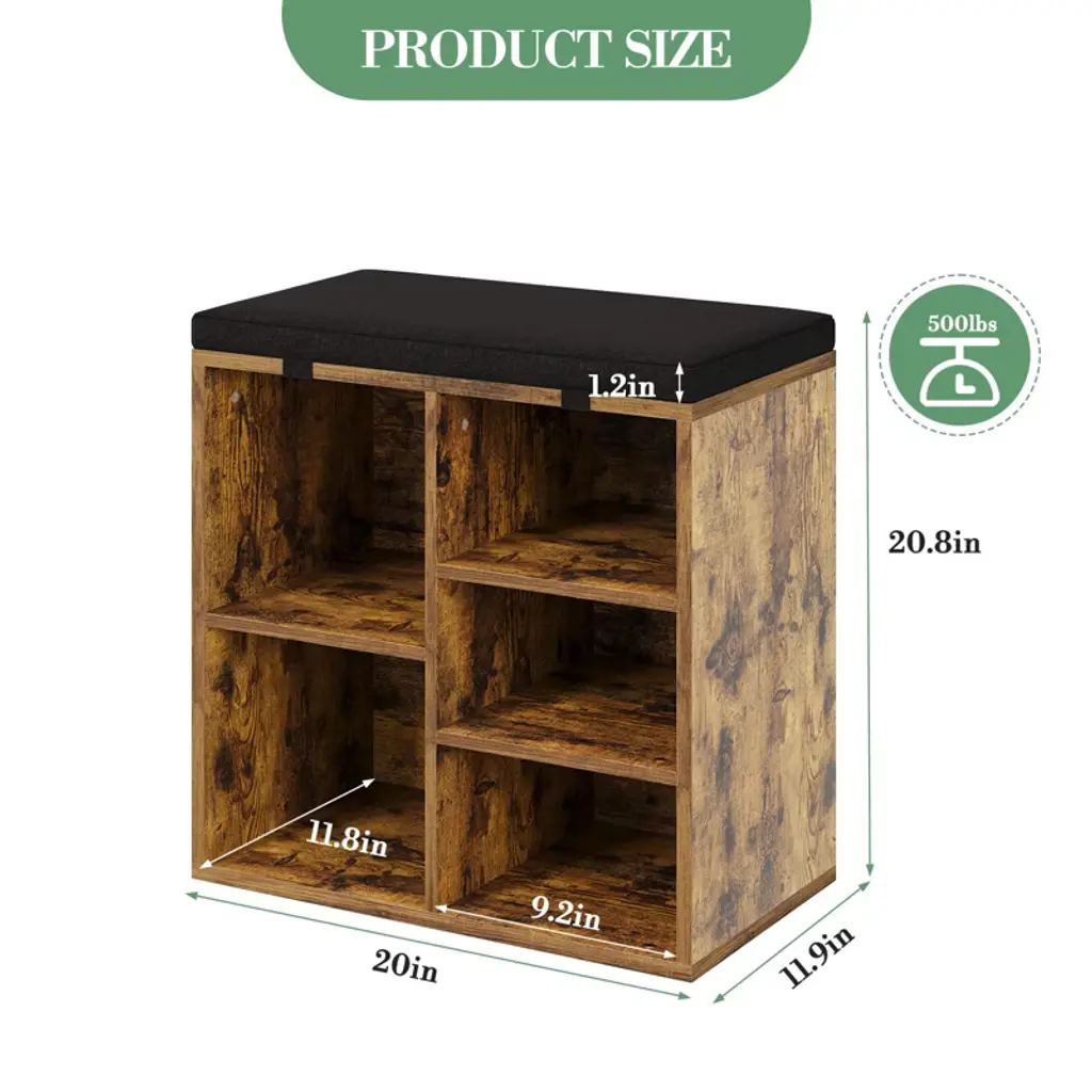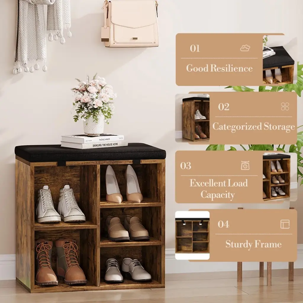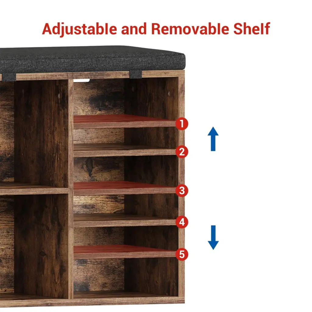 Shoe Storage Bench With Cushion, 20" Cubby Seat Shoe Cabinet, Cubby Seat Shoe Cabinet With 3-tier Adjustable Shelf For Living Room Hallway, Brown