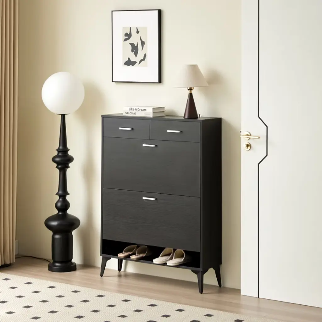 Maximize small spaces with the Black Shoe Cabinet, featuring 4 flip-door drawers (holds 20+ pairs) and a compact 31.5"W design. The durable particleboard construction (200lb capacity) includes anti-tip safety features, while adjustable shelves accommodate everything from heels to boots. A top platform stores decor, and smooth handles complete this space-saving organizer perfect for entryways or apartments.