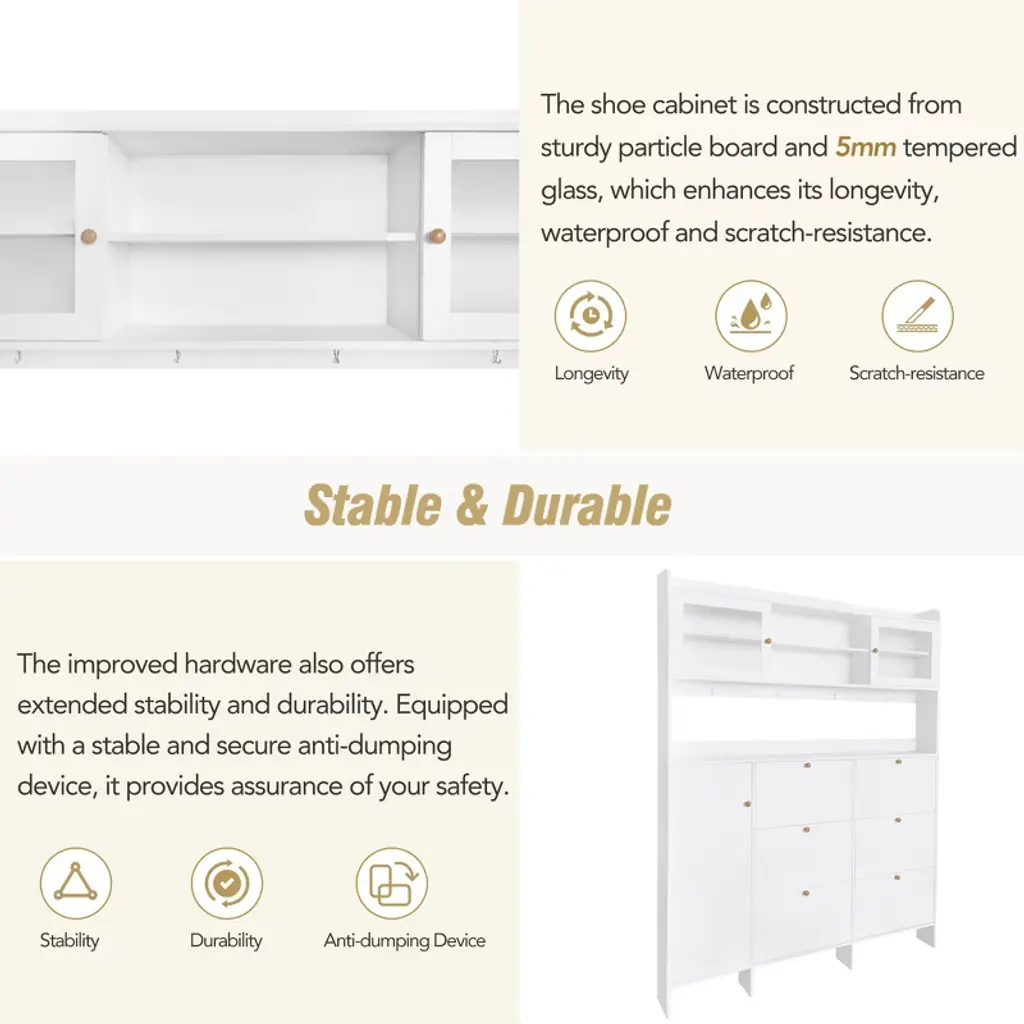 Discover the Multifunctional Tipping Bucket Shoe Cabinet with Storage Shelf & 6 Flip Drawers, Large Hall Tree with Tempered Glass Doors, Foyer Cabinet with 4 Hooks for Hallway, White, a versatile addition to your home. Features include: - Particle Board construction - 62.1L ¡Á 7.1W dimensions - 145.8lb sturdy build