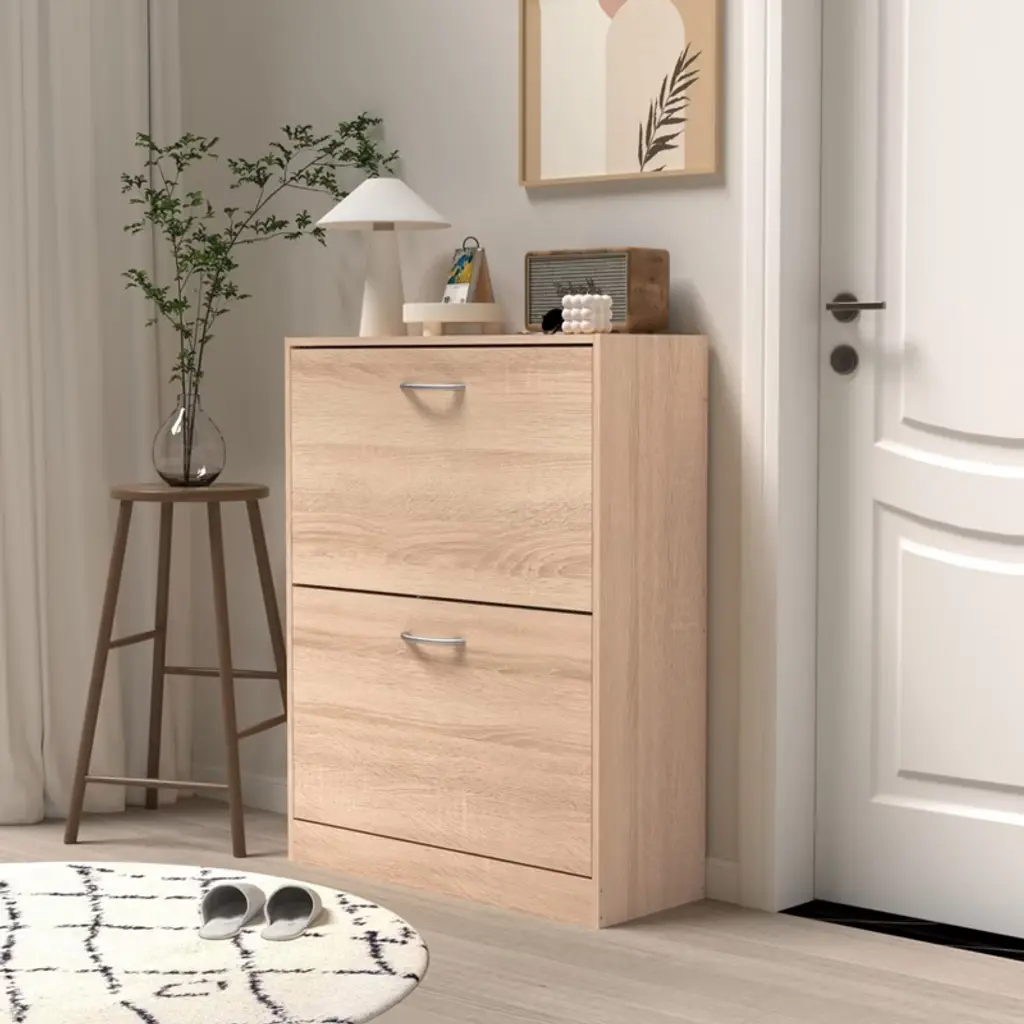 This elegant brown shoe cabinet combines durability with modern storage. Crafted from sturdy, moisture-resistant particle board, its 3 flip-down drawers (each with 2 layers) organize heels, boots, and sneakers, while the top holds keys or decor. Smooth silver handles and a wood-style finish add timeless charm, fitting any entryway, bedroom, or hallway. Easy to assemble and wipe clean, its slim 24x9x47-inch design maximizes small spaces.