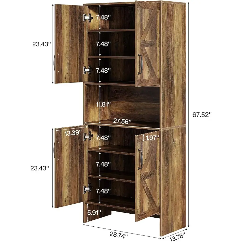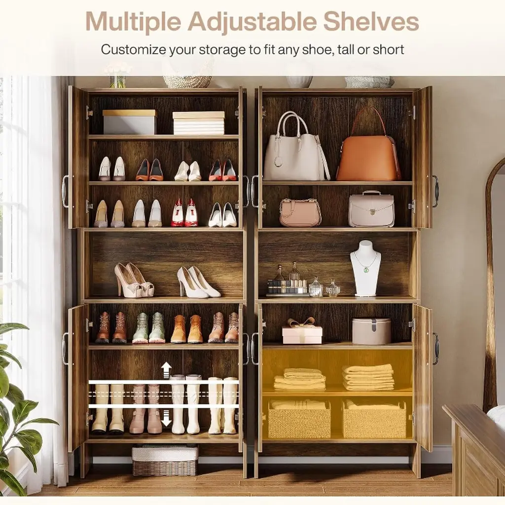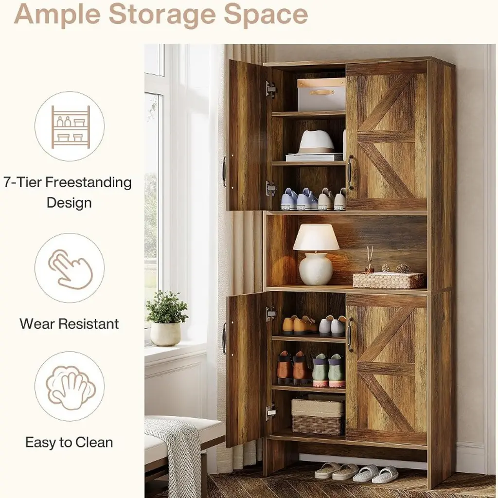 Keep your home tidy with this 67.52-inch farmhouse shoe cabinet, featuring seven adjustable shelves behind closed doors to store up to 28 pairs of shoes discreetly. The warm rustic brown finish and charming design make it a stylish addition to entryways or living rooms, while the spacious interior accommodates everything from sandals to boots. Perfect for families, it combines practical organization with cozy farmhouse appeal.